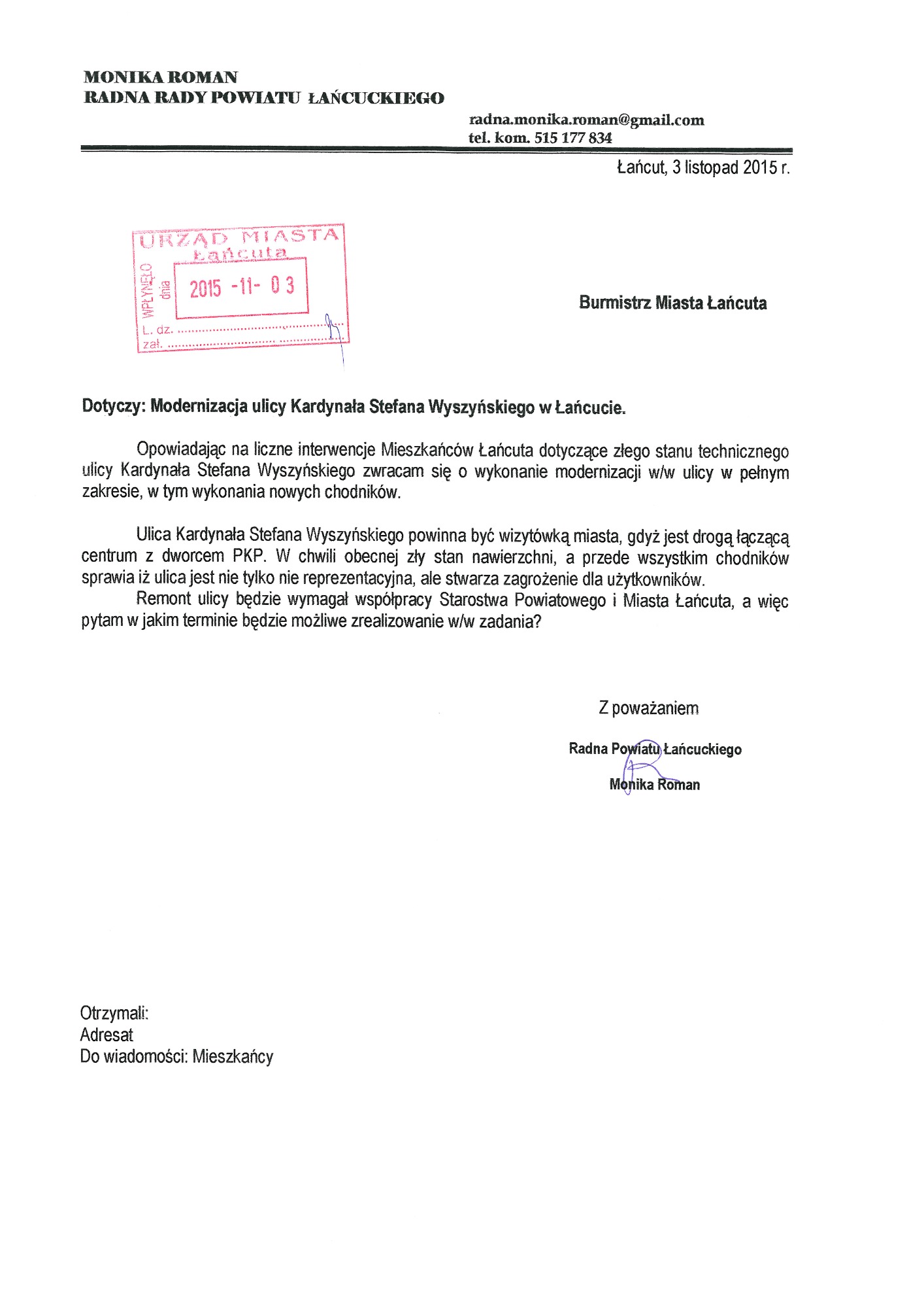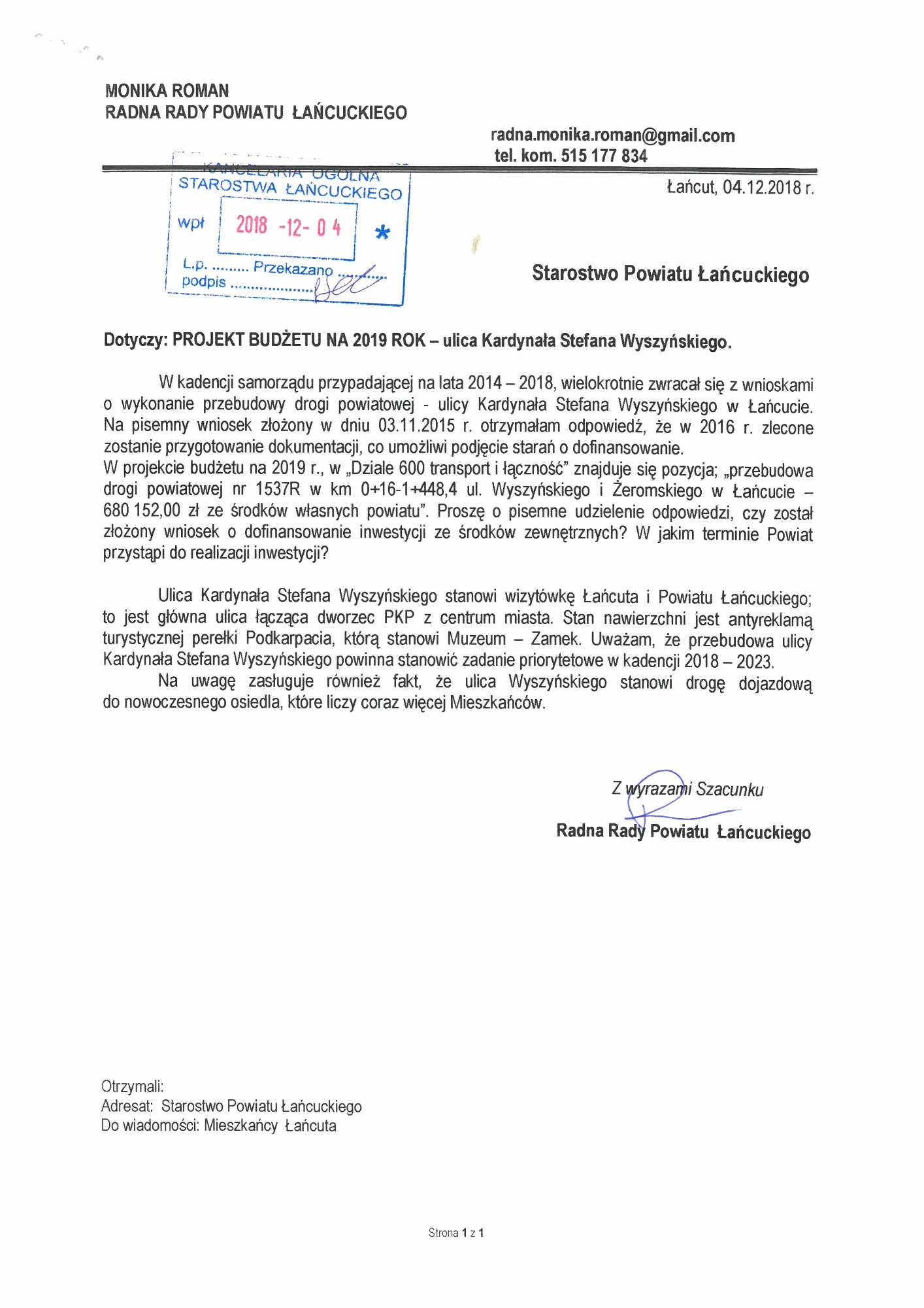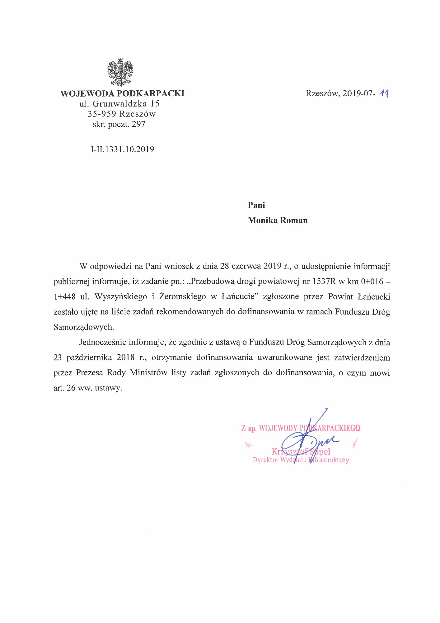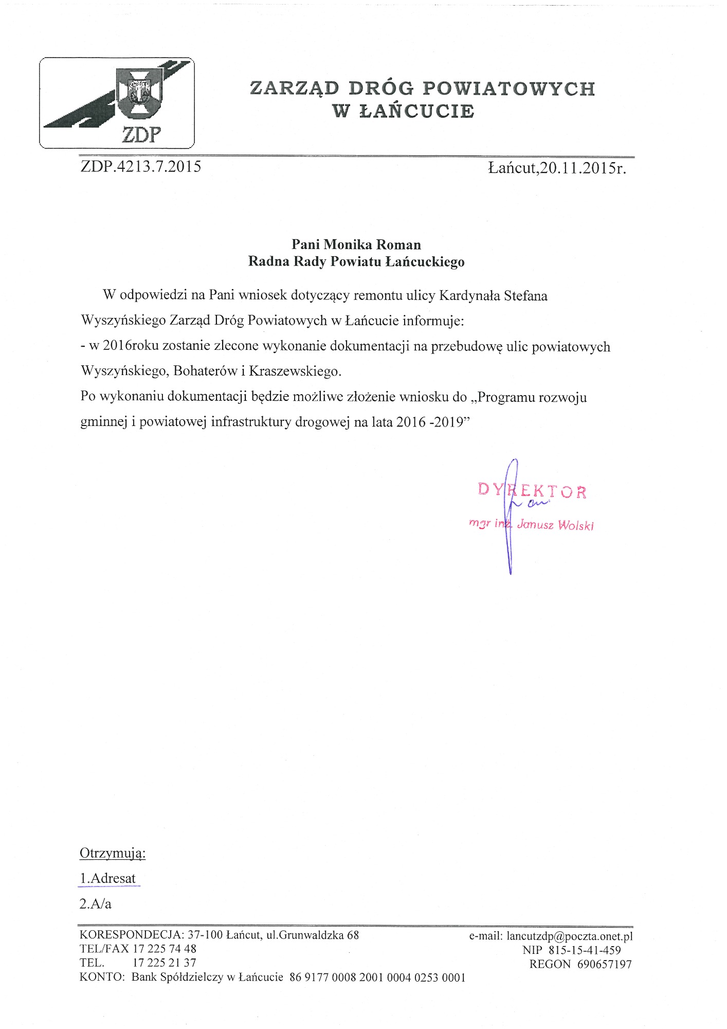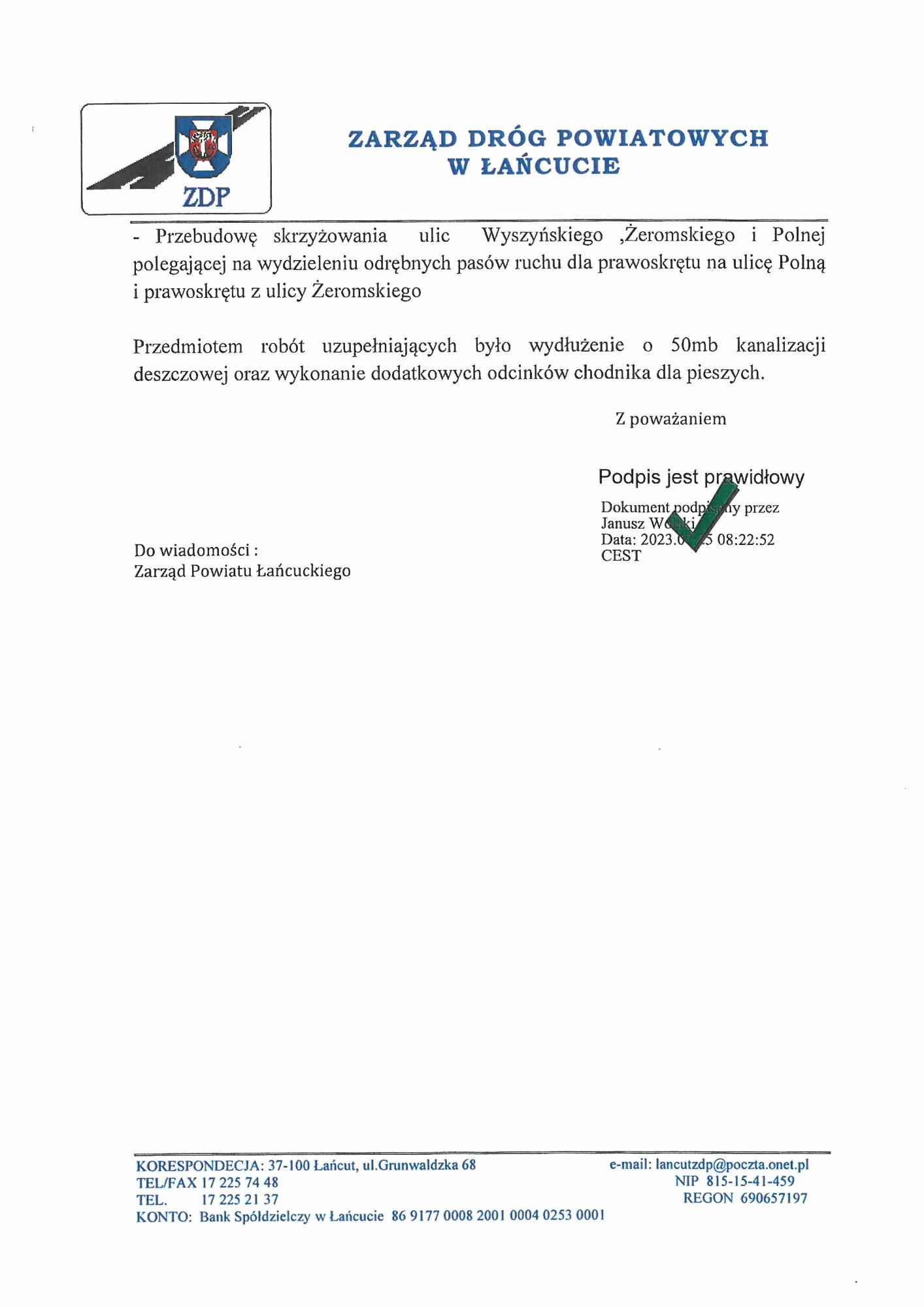 Ulica Kardynała Stefana Wyszyńskiego należy do kategorii dróg powiatowych. W poprzedniej kadencji samorządu tj. w latach 2014 - 2018 w starostwie powiatowym przygotowano dokumenty techniczne, niezbędne do złożenia wniosku o dofinasowanie. Inwestycja w terenie została wykonana w obecnej kadencji samorządu. Przebudowa ulicy była możliwa dzięki determinacji Dyrekcji i Pracowników Zarządu Dróg Powiatowych w Łańcucie.