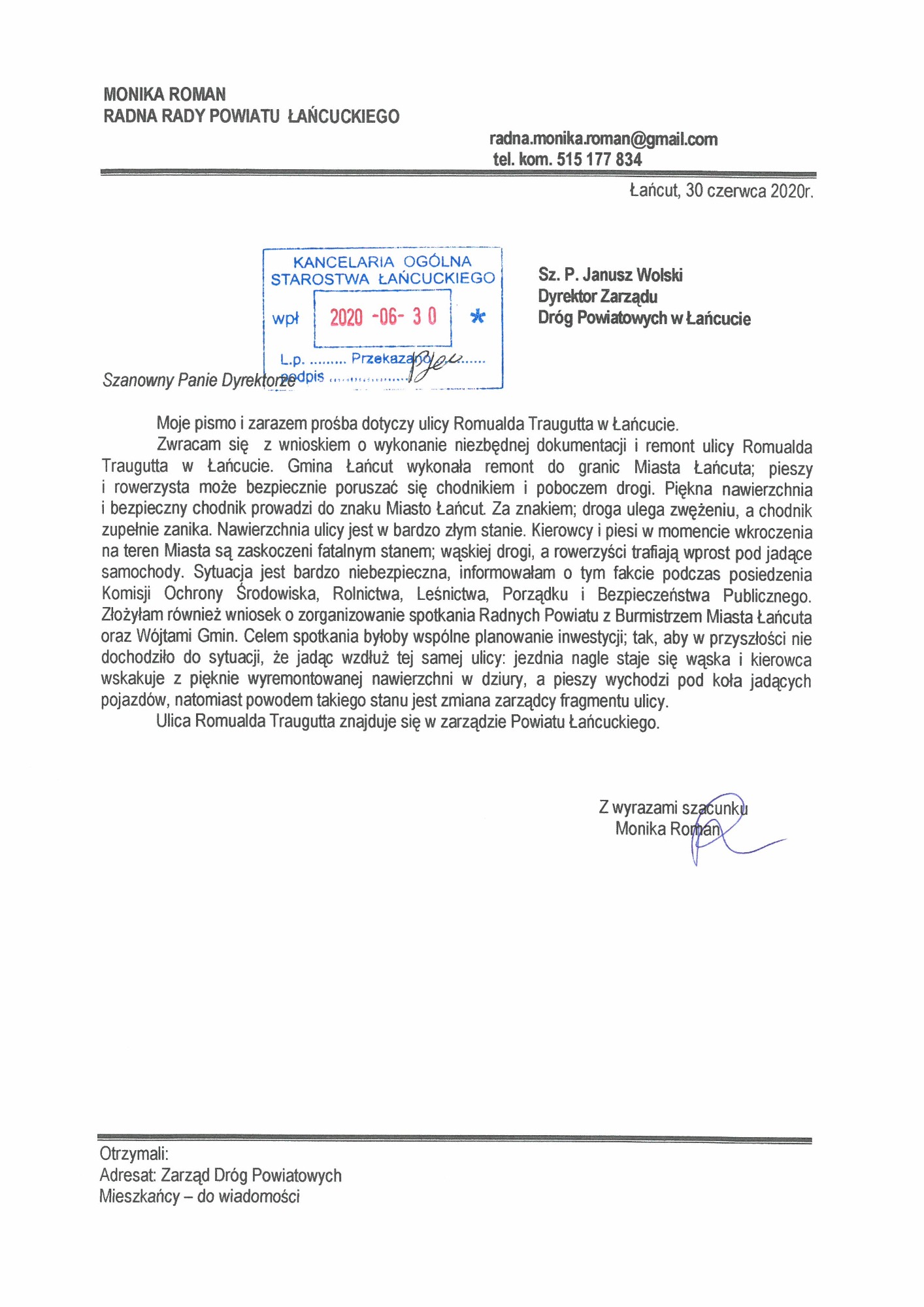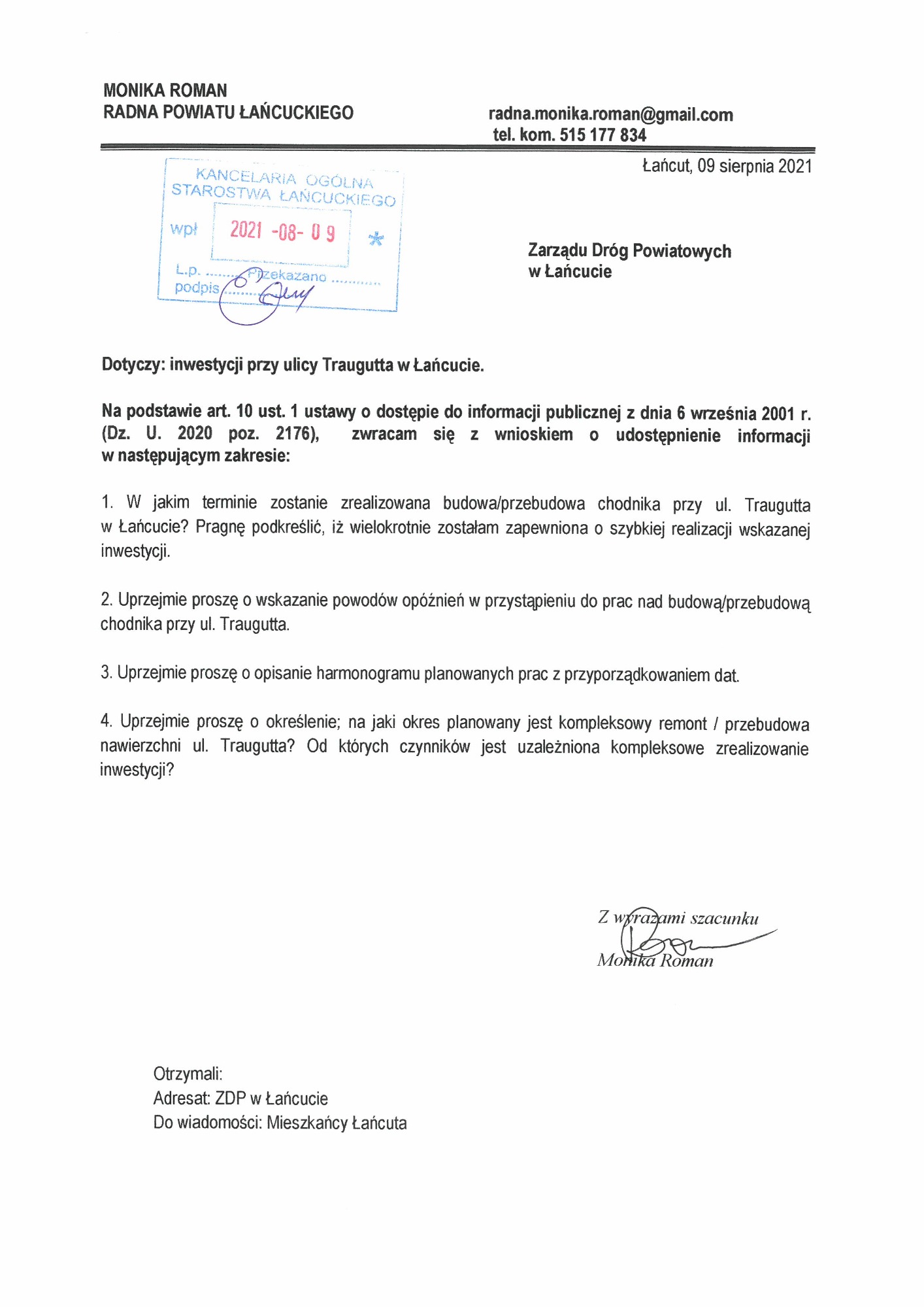 Zapraszam do zapoznania się ze skanami wniosków, które złożyłam w sprawie budowy chodnika na ulicy Romualda Traugutta w Łańcucie. Inwestycja została wykonana przez Zarząd Dróg Powiatowych w Łańcucie.