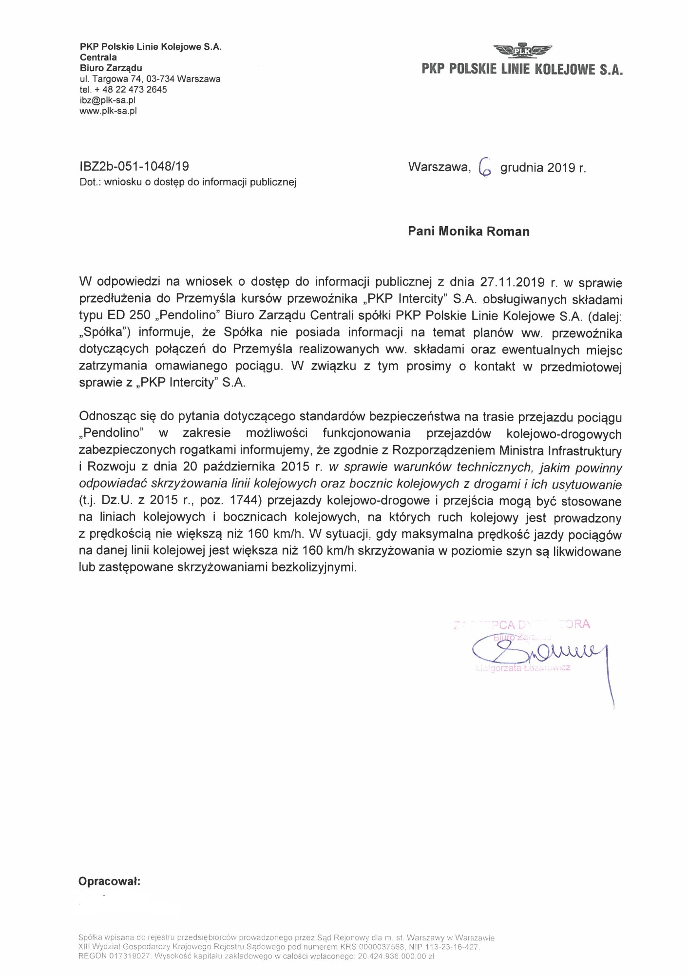 Zwróciłam się z prośbą do POLREGIO S.A. o wprowadzenie kursu nocnego do rozkładu jazdy pociągów. Kurs nocny na trasie Rzeszów – Przeworsk, około godziny 1 w nocy. Widzę potrzebę wprowadzenia takiego połączenia – szeroko ten temat uzasadniłam wypowiadając się podczas sesji Rady Powiatu Łańcuckiego. Aktualnie ostatni pociąg z Rzeszowa do Łańcuta odjeżdża około 23:30. Pasażer, który nie zdążył – zostaje na noc, na peronie. Łańcucianie, którzy wracają z turnusów rehabilitacyjnych, sanatoriów, studenci wracający z uczelni, Mieszkańcy Łańcuta i Powiatu Łańcuckiego wracający z wakacji, lub po prostu z pracy, – jeżeli nie zdążą na ostatni pociąg, który odjeżdża po godzinie 23:30 – muszą czekać do rana. Pierwsze połączenie jest wykonywane około godziny 5:00. Sześć godzin to zbyt długa przerwa w komunikacji. Odległość z Łańcuta do Rzeszowa to tylko lub aż: 17 kilometrów.