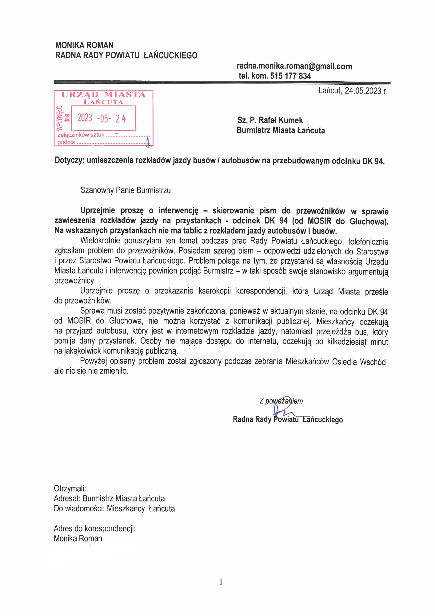 Serdecznie zapraszam Państwa do zapoznania się ze skanami korespondencji w sprawie funkcjonowania komunikacji w mieście i w powiecie.