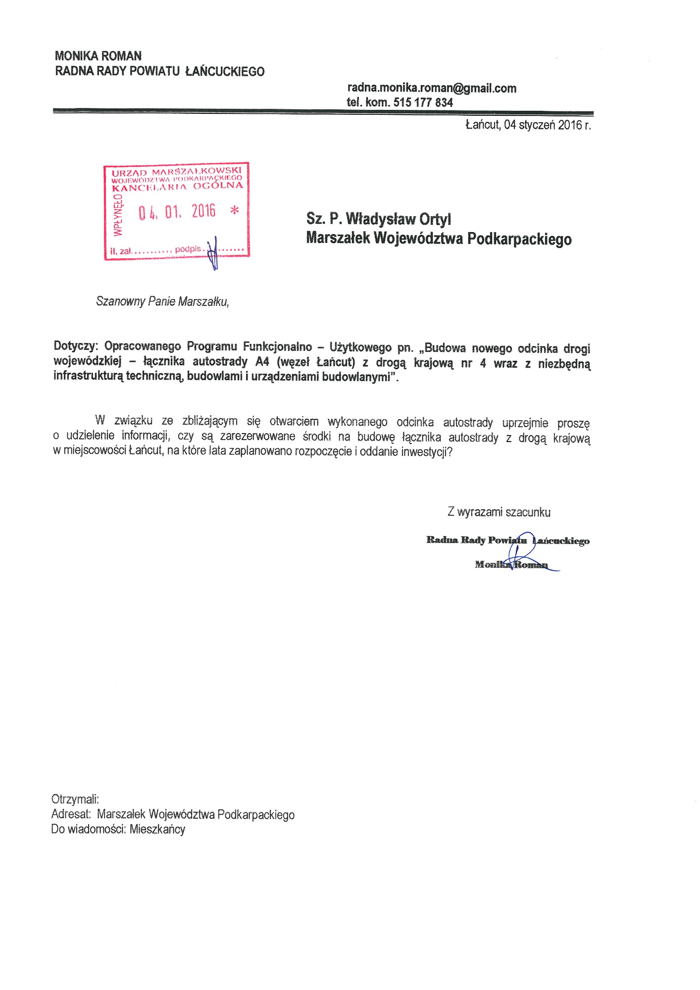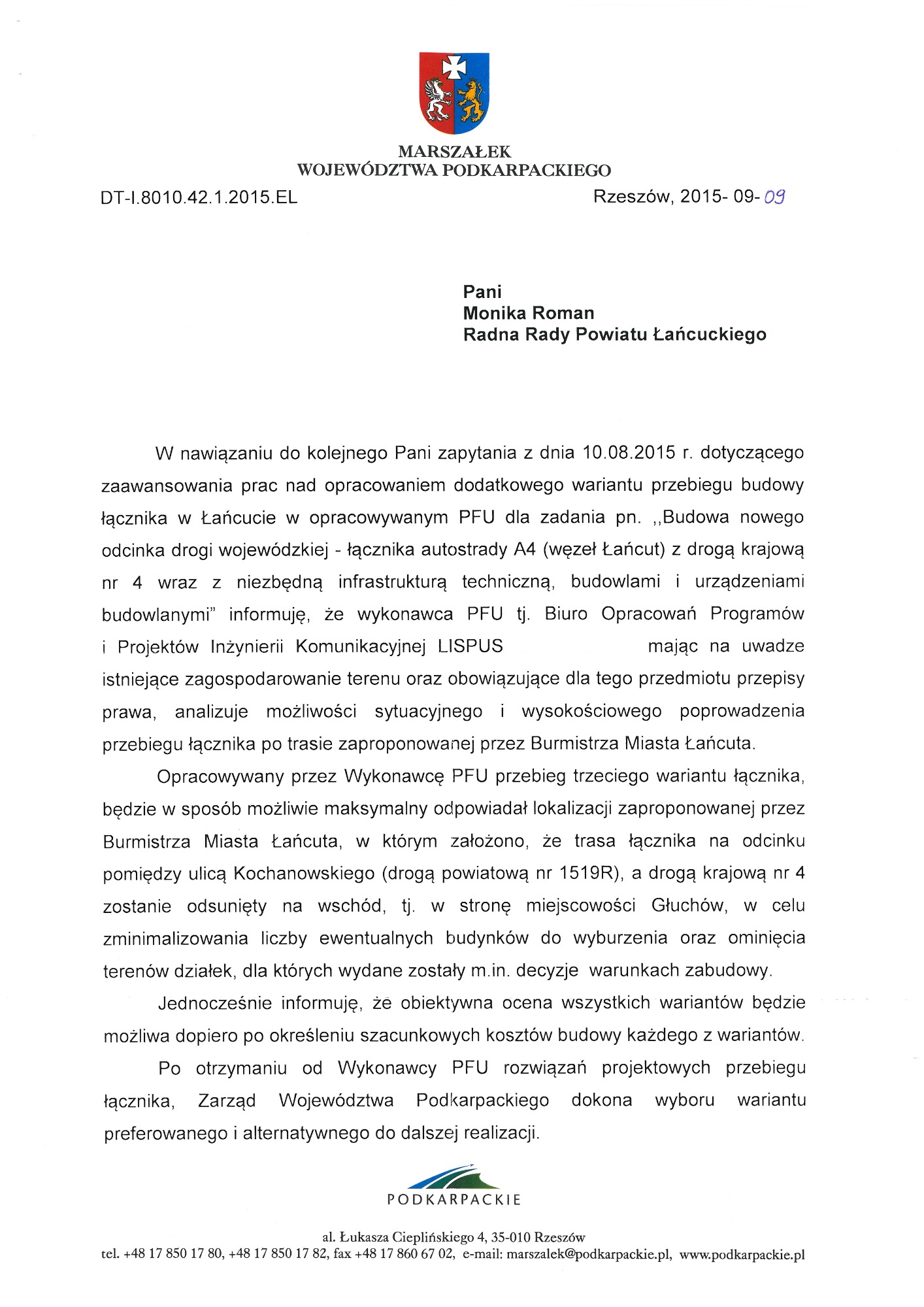 Zgodnie z pismem Urzędu Marszałkowskiego Województwa Podkarpackiego z 2018 roku postępowanie dotyczące budowy łącznika zostało zawieszone przez Wojewodę Podkarpacką. Pisma od Władz Województwa Podkarpackiego znajdują się w galerii, zapraszam do zapoznania się z dokumentami.