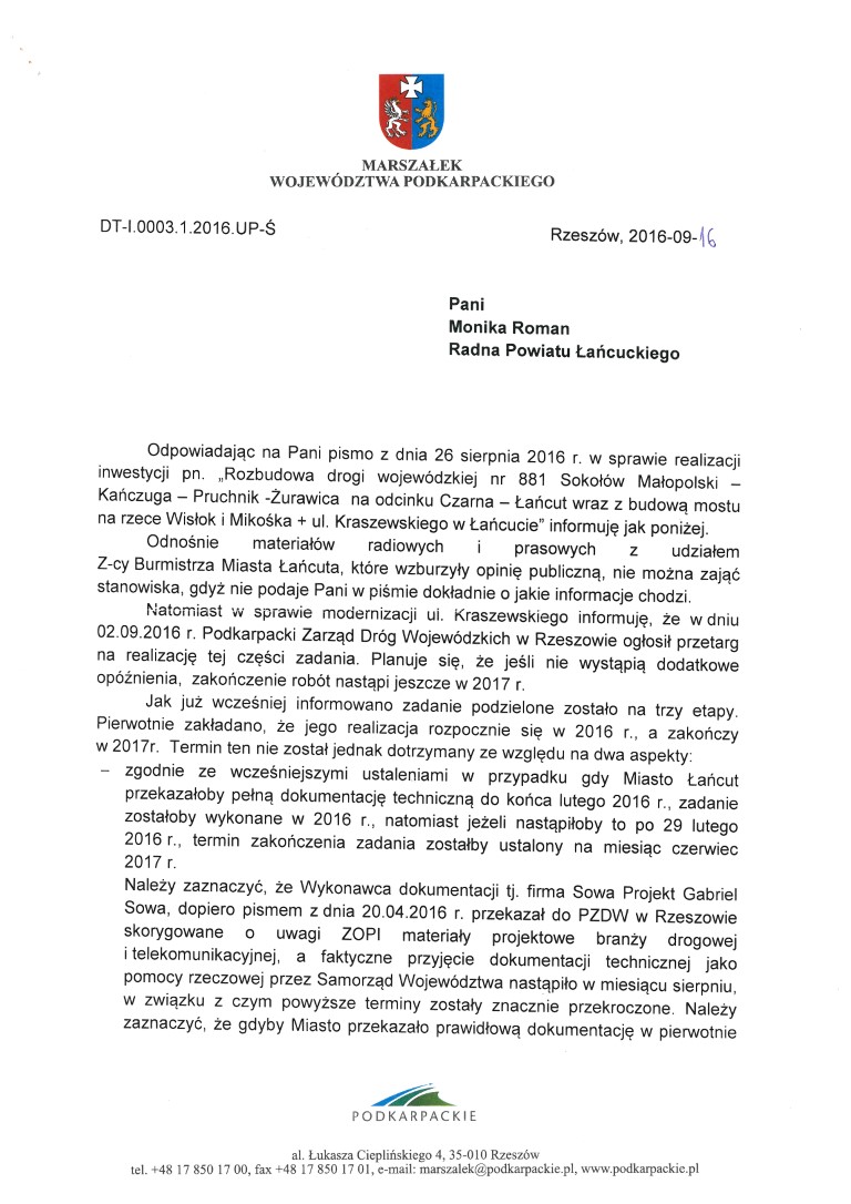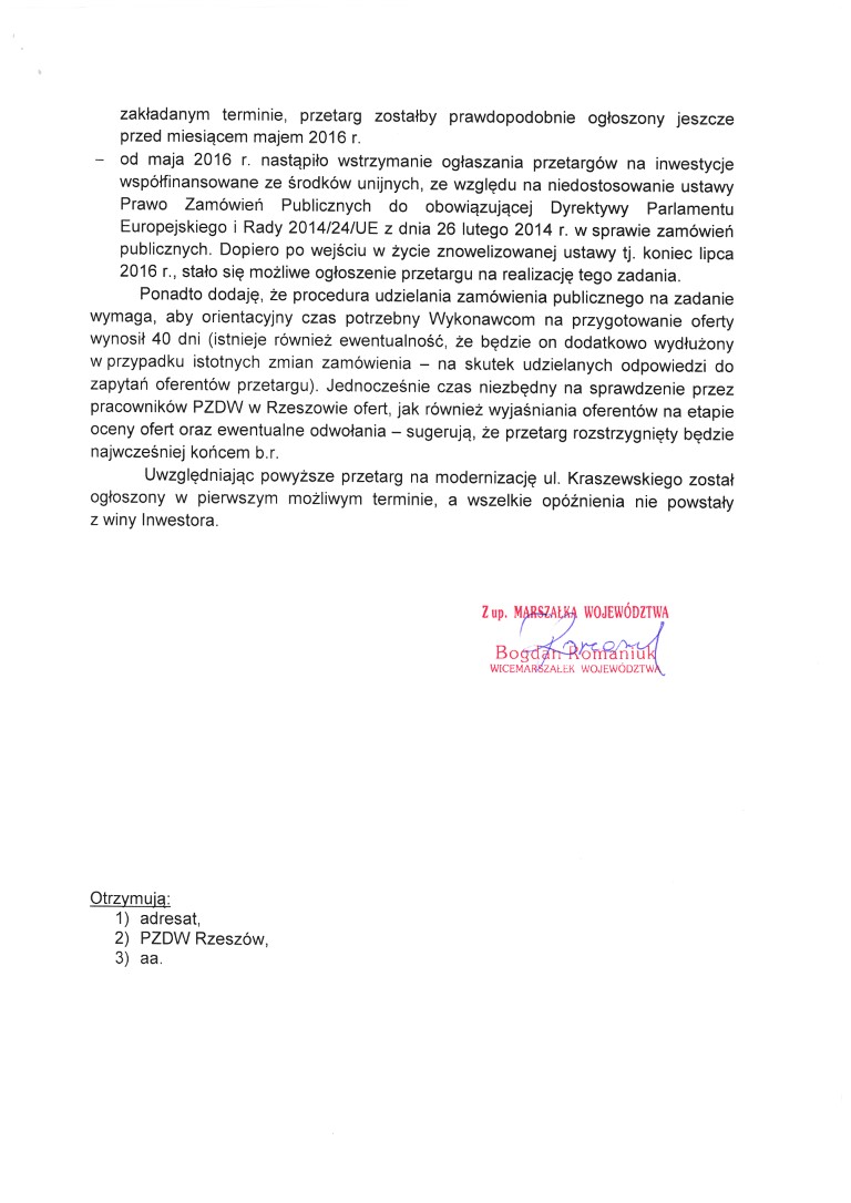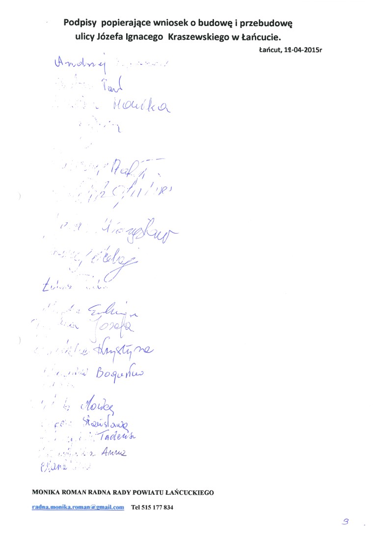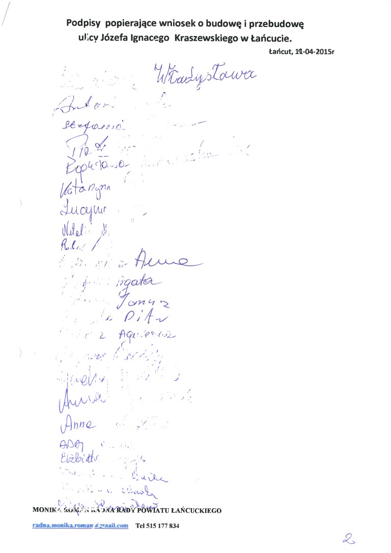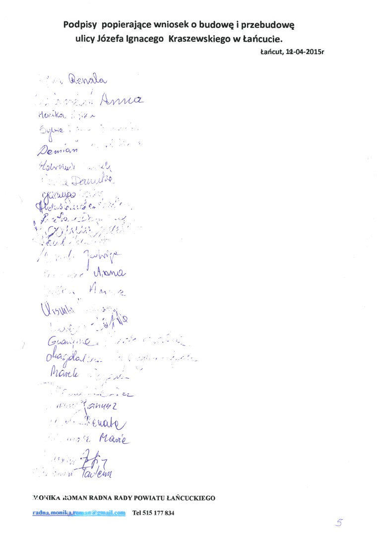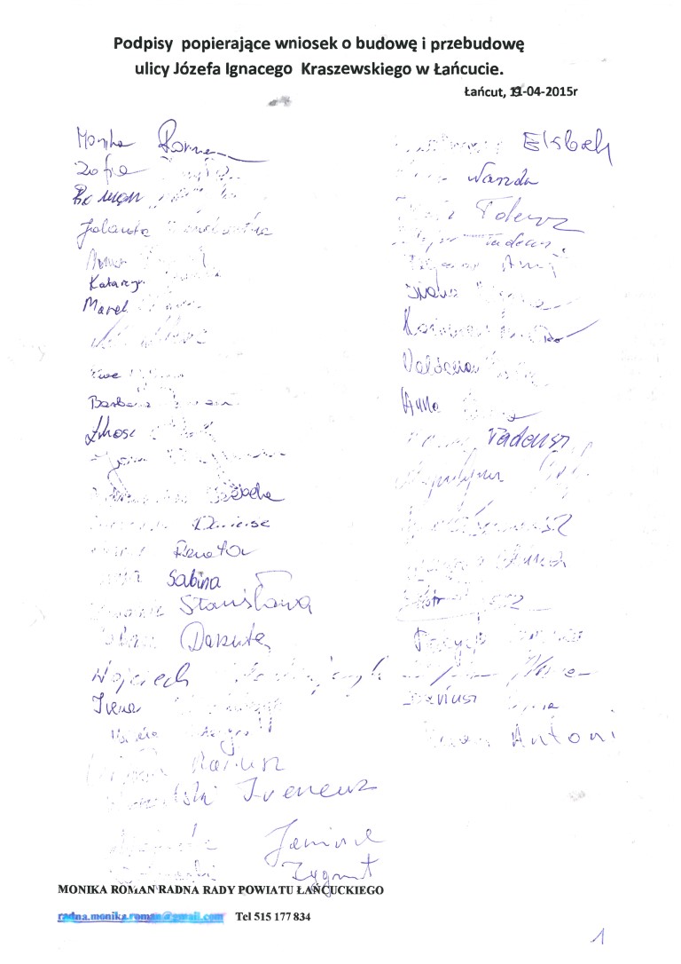 Modernizacja ulicy Józefa Ignacego Kraszewskiego była jedną z moich obietnic wyborczych. Zebrałam około 300 podpisów pod wnioskiem o realizację inwestycji. Wniosek wraz z podpisami przekazałam do Urzędu Marszałkowskiego Województwa Podkarpackiego. Poparcie społeczne było jednym z decydujących czynników, który przyczynił się do wybrania właśnie tej inwestycji do dofinansowania z funduszy europejskich !