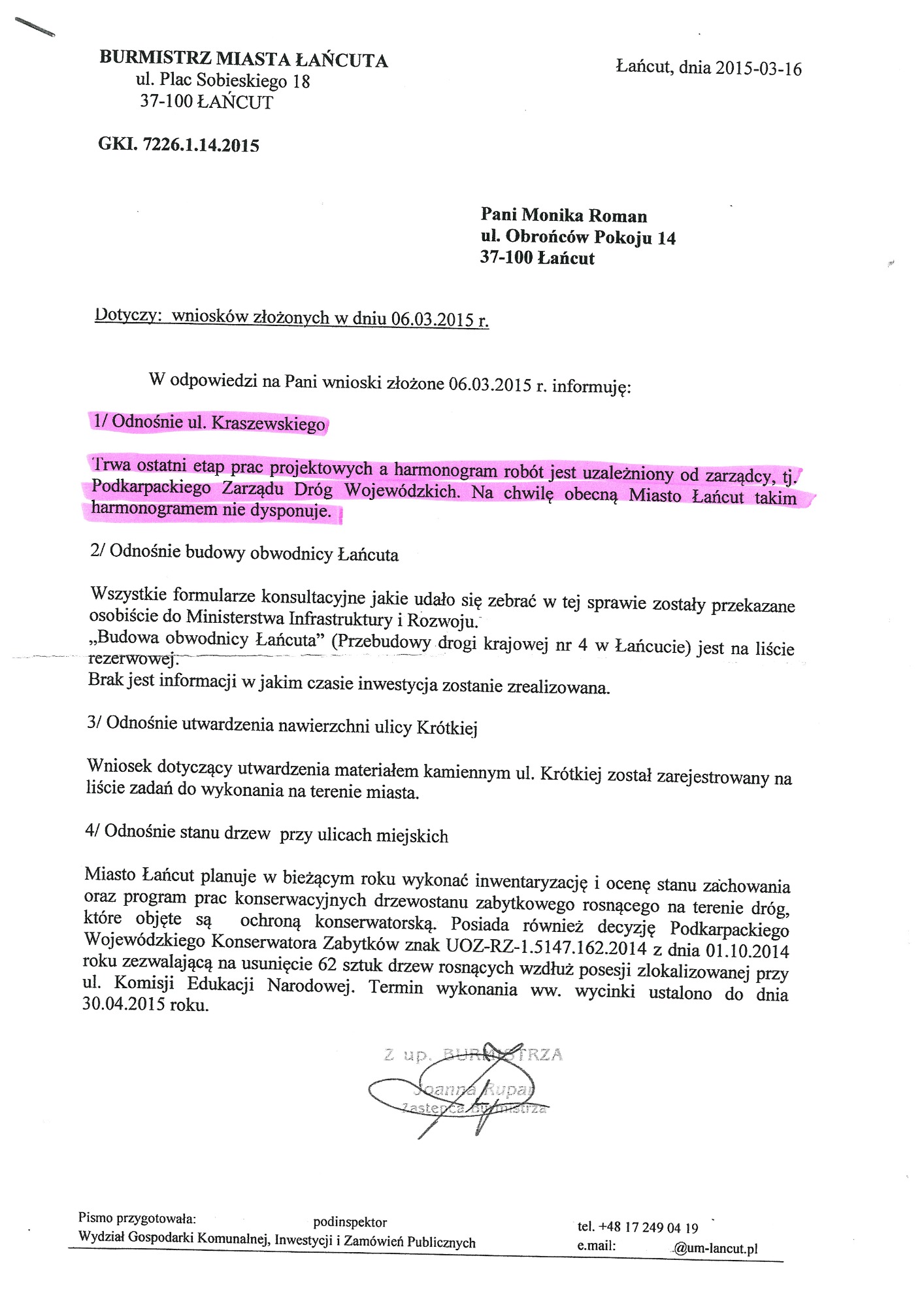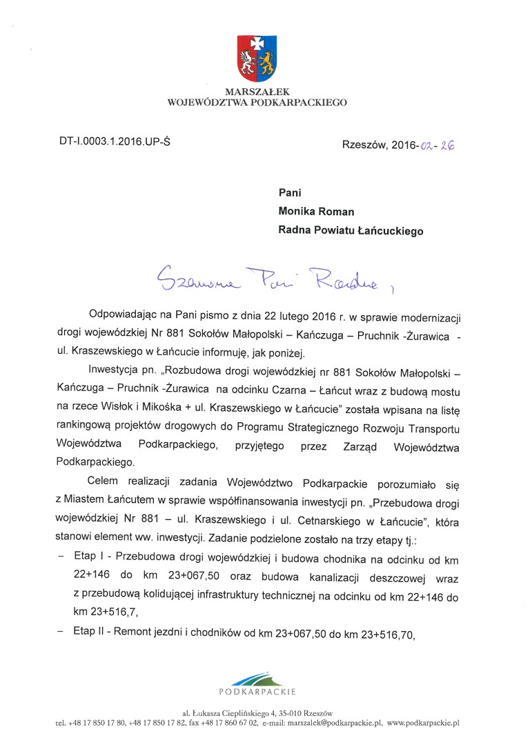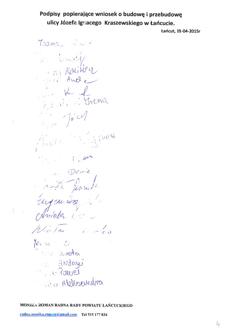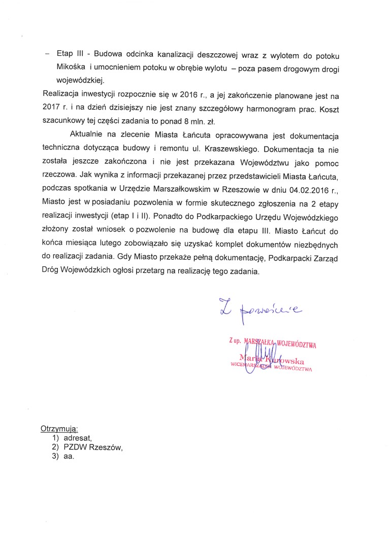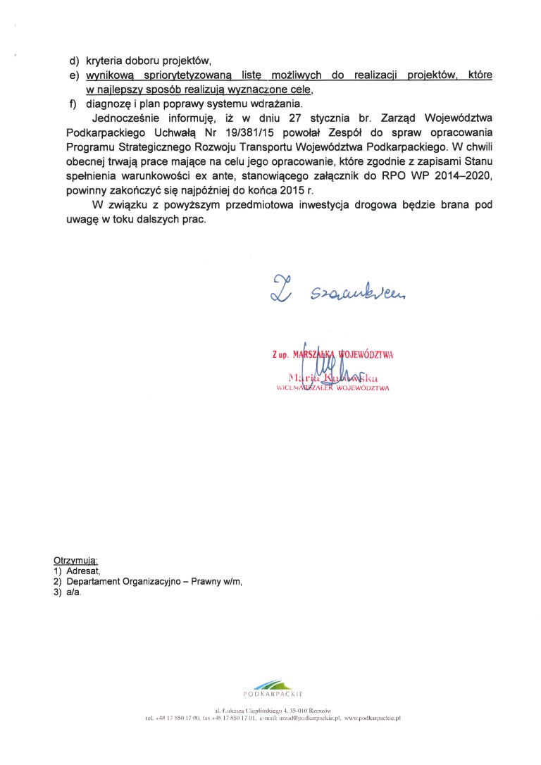 W galerii znajduje się korespondencja z Samorządem Województwa Podkarpackiego i kilka kart podpisów Mieszkańców popierających inwestycję, (podpisy zostały zanonimizowane ze względu na nowe brzmienie ustawy o ochronie danych osobowych).