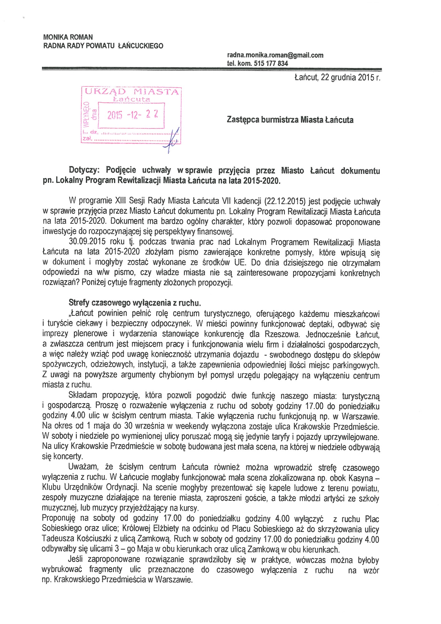 W kadencji przypadającej na lata 2014 - 2018, jako radna Powiatu Łańcuckiego, zaproponowałam władzom miasta rozwiązanie stosowane w Warszawie tzn. czasowe wyłączenie ulic z ruchu. Rozwiązanie polega na wybrukowaniu dwóch ulic kostką, po której mogą poruszać się samochody, a następnie wyłączaniu tych ulic z ruchu tylko na czas weekendu tzn. od godziny 16:00 w sobotę do 24:00 w niedzielę, lub do 3:00 w poniedziałek. Takie rozwiązanie funkcjonuje w Warszawie na ulicy Krakowskie Przedmieście. W weekendy na Krakowskim Przedmieściu funkcjonuje deptak, stoją krzesełka z lokalnych kawiarenek, natomiast od poniedziałku do piątku po ulicy jeżdżą samochody i autobusy. Myślę, że jest to dobre rozwiązanie na zachęcenie turystów, rozwój gastronomii i dla Nas – Mieszkańców Łańcuta. Każdy chciałby w niedzielę wyjść do miasta na lody i bezpiecznie pospacerować, zwłaszcza jeśli wychodzi z małymi dziećmi.