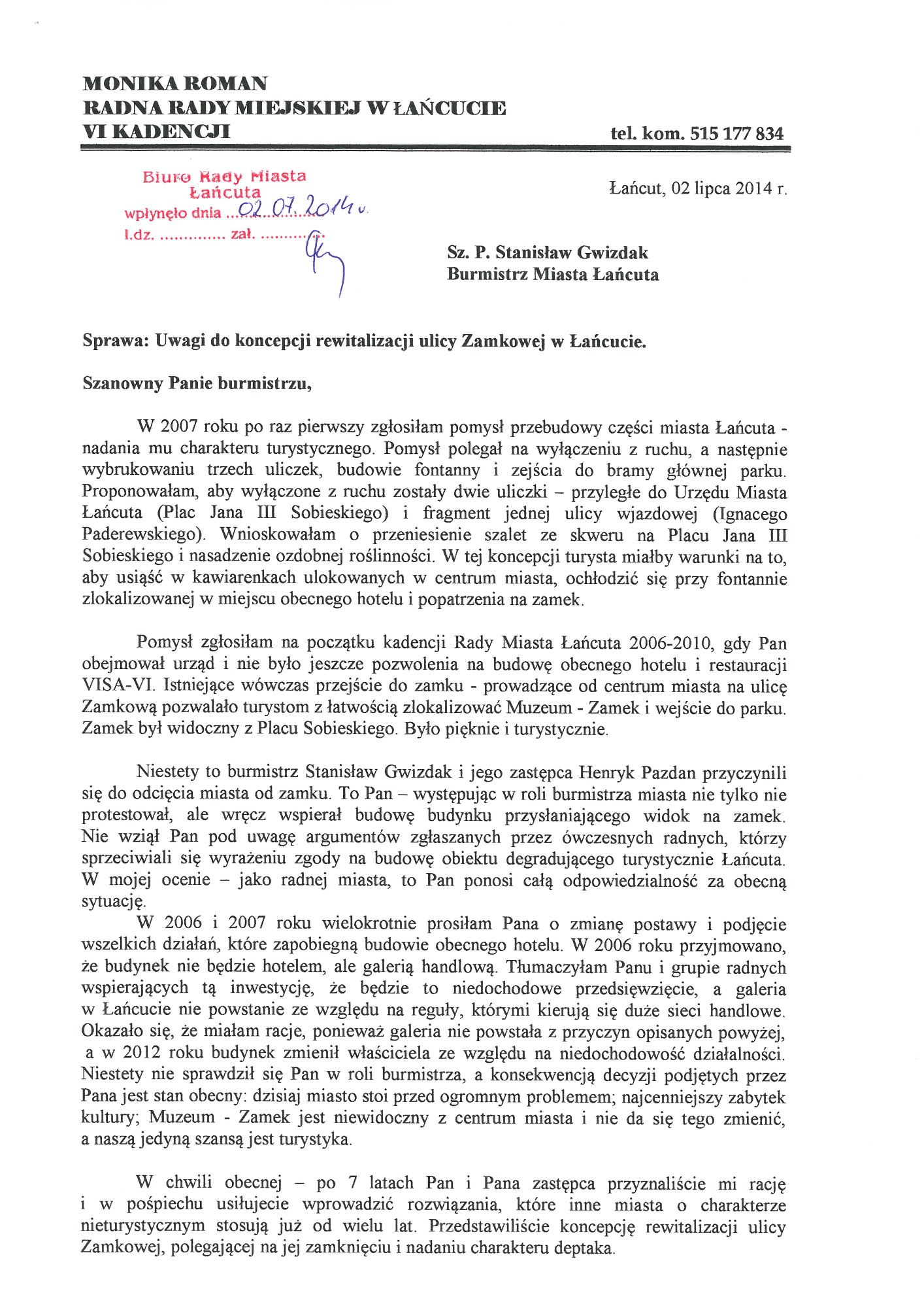 Większa cześć radnych – z listy pana burmistrza zdecydowała, że budynek handlowy jest większą szansą dla Łańcuta niż turystyka, gdyż powstanie w nim galeria handlowa! Argumentowałam, tłumaczyłam, że Łańcut jest perełką turystyczną! że żadna sieć handlowa nie uruchomi sklepu w mieście poniżej 20 tysięcy mieszkańców, że przyszłość centrum miasta powinna być powiązana z turystyką, a galerie handlową można zaplanować w innej dzielnicy. Niestety większa część radnych zarzuciła mi blokowanie rozwoju miasta, zdecydowali że galeria handlowa jest większą szansą na rozwój Łańcuta, niż turystyka! Budynek na Placu Sobieskiego, w którym obecnie znajduje się restauracja i hotel, w zamyśle radnych V kadencji miał być galerią handlową. Budynek powstał i zasłonił przepiękny widok na Muzeum – Zamek.