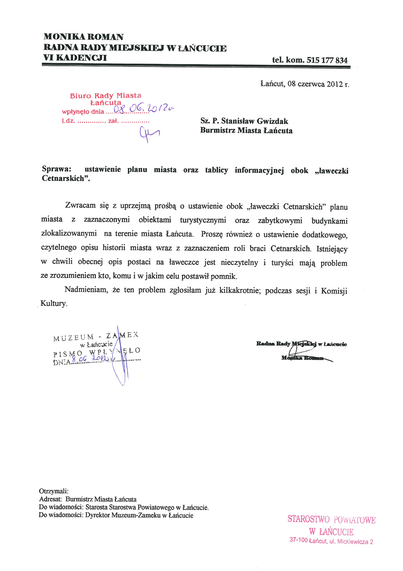 Zaproponowałam również rzeczy prozaiczne, takie jak ustawienie tablic ze wskazaniem zabytków, czy opisem historii miasta. Proponowałam również „gadające ławeczki” – na wzór ławeczek grających utwory Szopena. W Warszawie na Krakowskim Przedmieściu stoją marmurowe ławeczki, po dotknięciu ławeczka odtwarza muzykę skomponowaną przez Fryderyka Szopena. Ciekawą atrakcją dla Łańcuta byłaby marmurowa ławeczka, która po dotknięciu odtwarza nagraną historię miasta. Byłaby to również lekcja historii miasta dla młodych łańcucian.