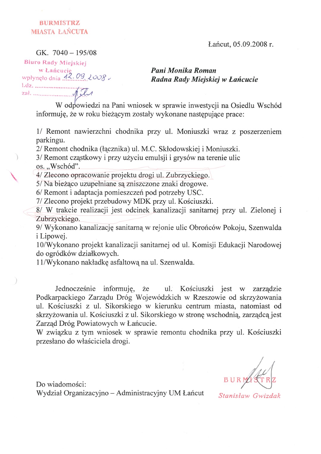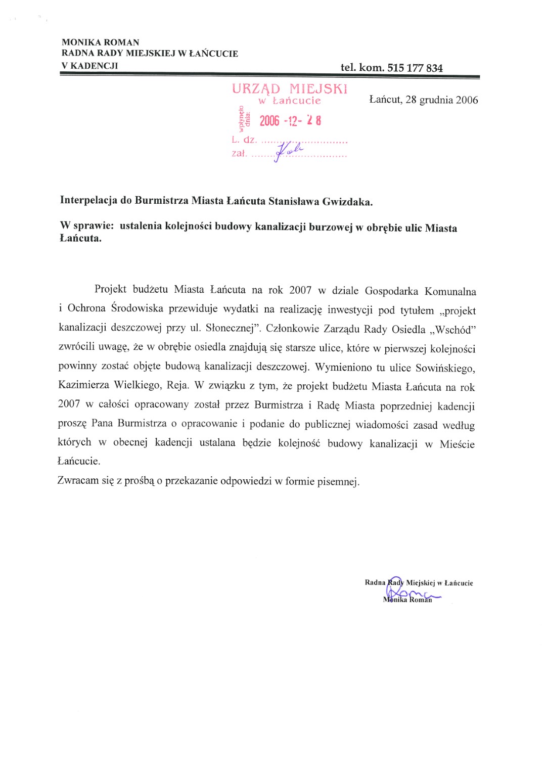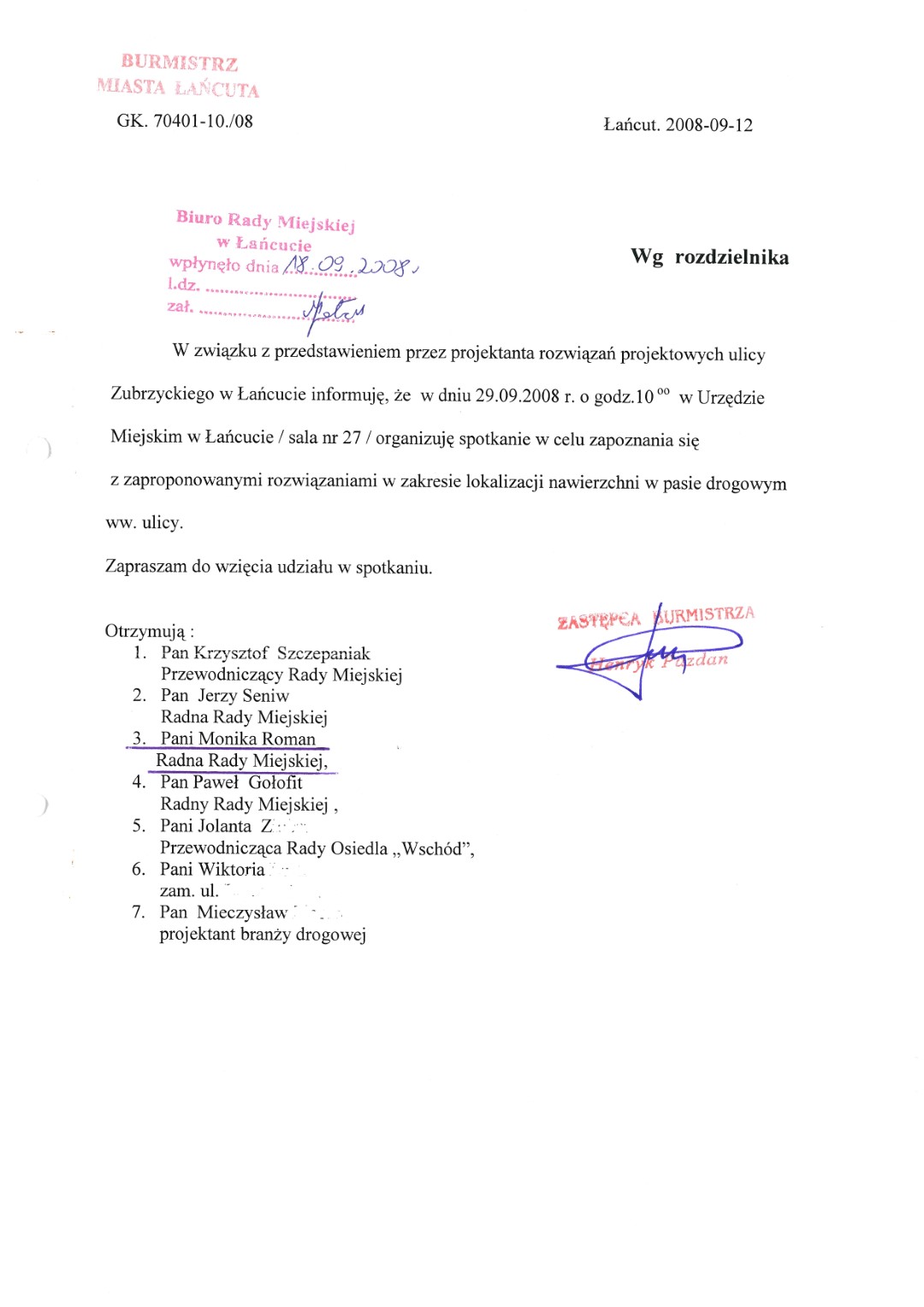 Mieszkańcy ulicy Zubrzyckiego (obecnie ulica Pod Bażantarnią) zwrócili się do mnie z wnioskiem w sprawie wykonania kanalizacji burzowej oraz asfaltowej nawierzchni. Powodem interwencji był brak utwardzonej nawierzchni oraz woda wlewająca się do garaży po każdym deszczu. Zebraliśmy podpisy i opracowaliśmy treść pism. Wnioski o realizację inwestycji złożyłam w terminach: 07-01-2007, 19-04-2007, 11-09-2007, 12-03-2008.