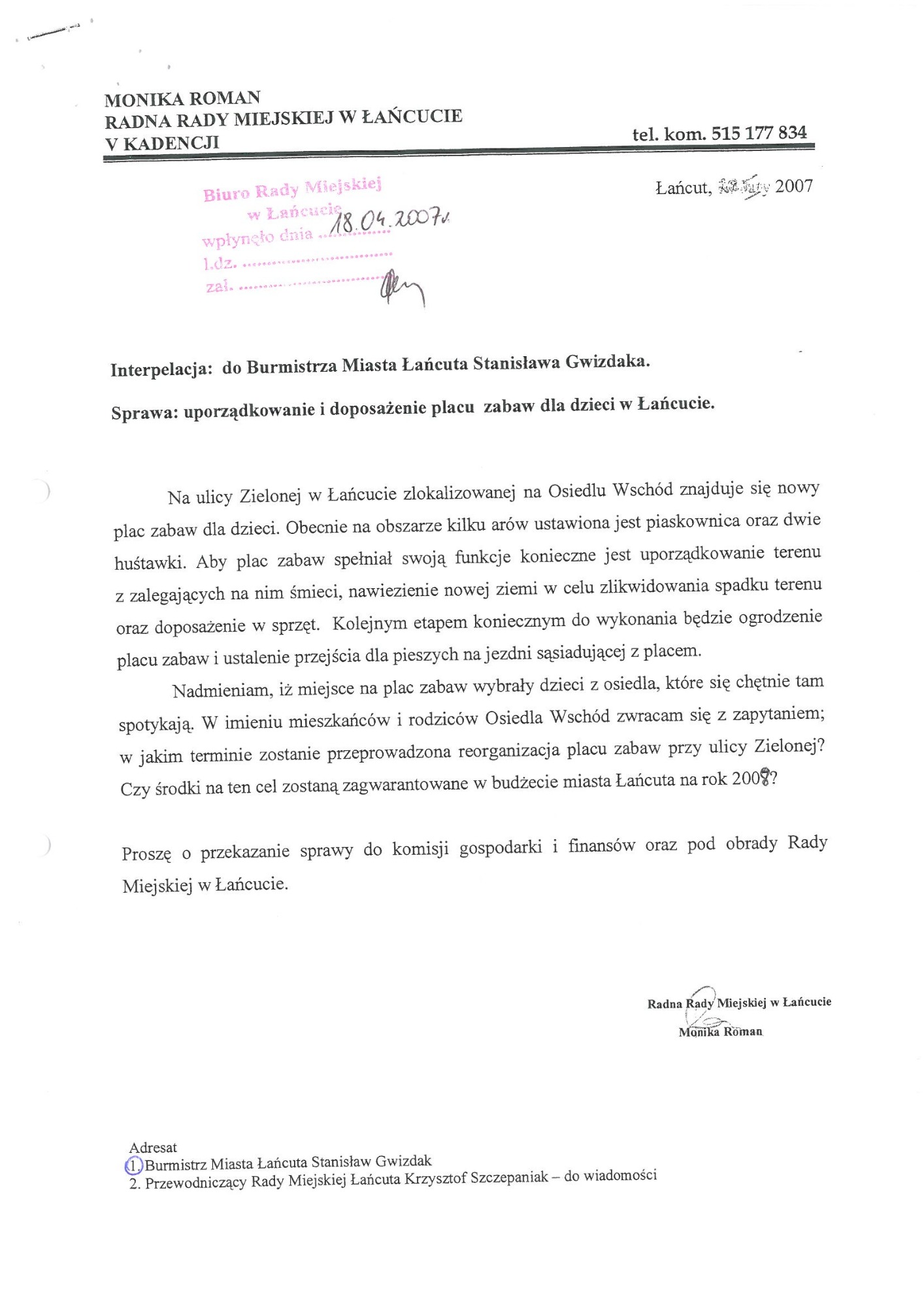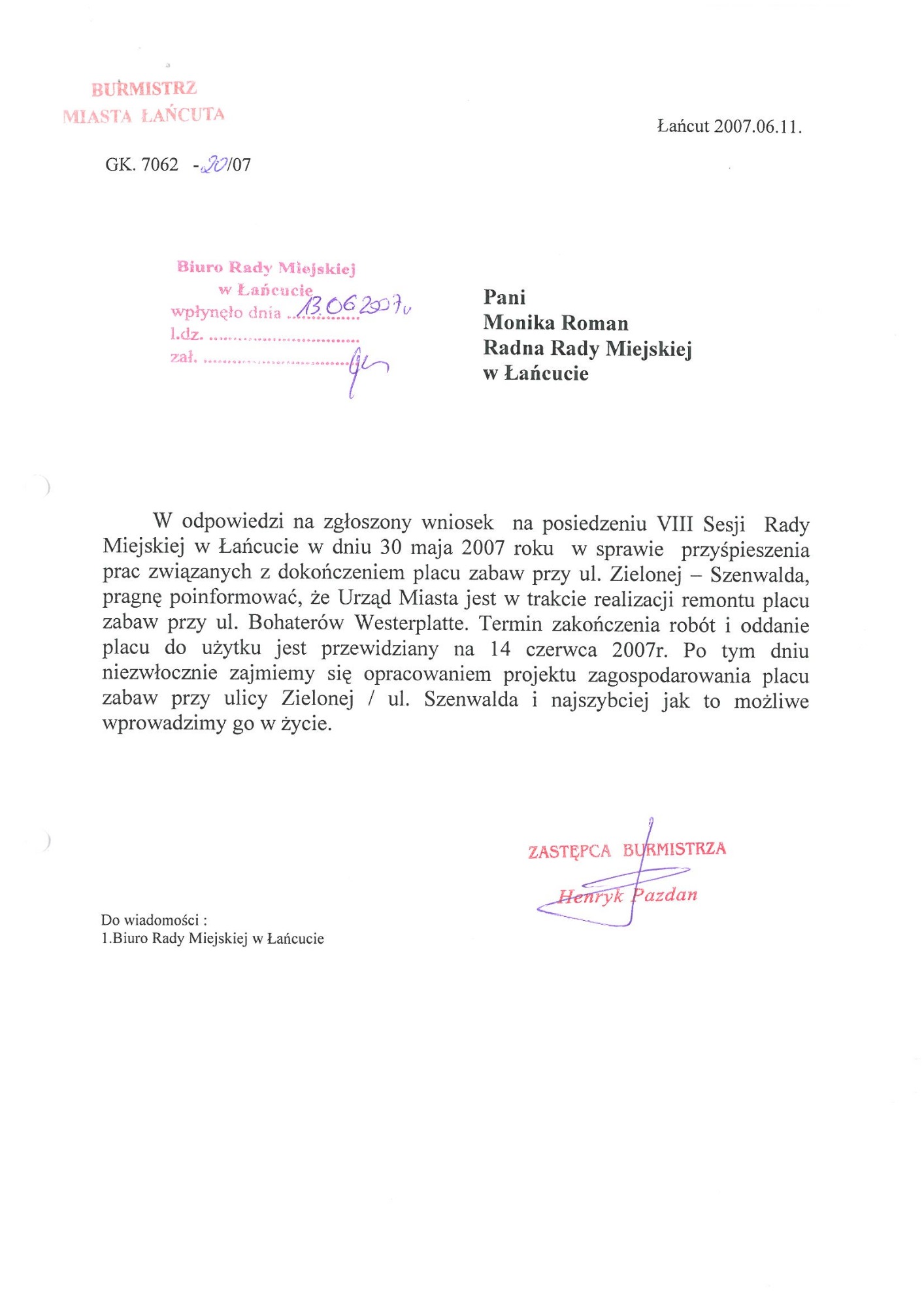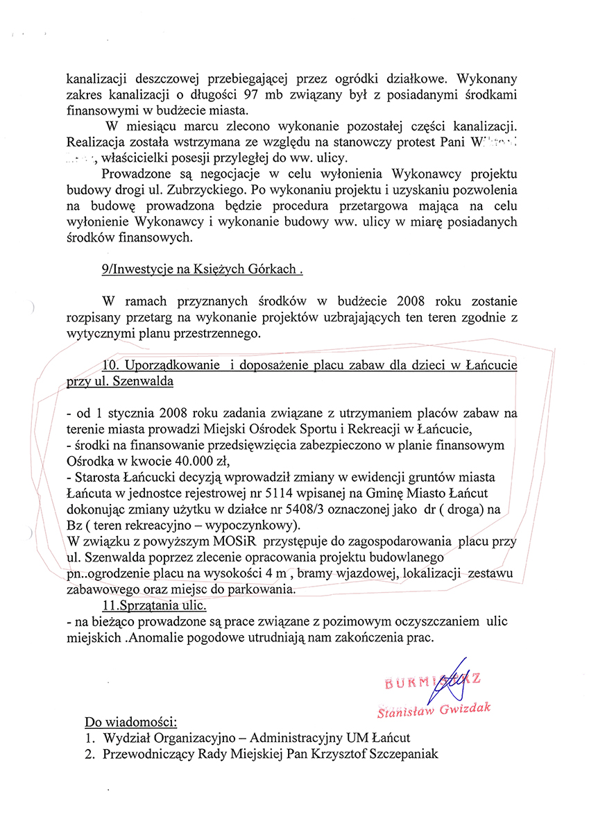 Plac zabaw przy ul. Zielonej (poprzednia nazwa ulica Szenwalda). Wspólne starania Mieszkańców i moje zostały uwieńczone sukcesem powstał ogrodzony - bezpieczny plac zabaw dla dzieci. Plac zabaw jest systematycznie doposażony i unowocześniany.