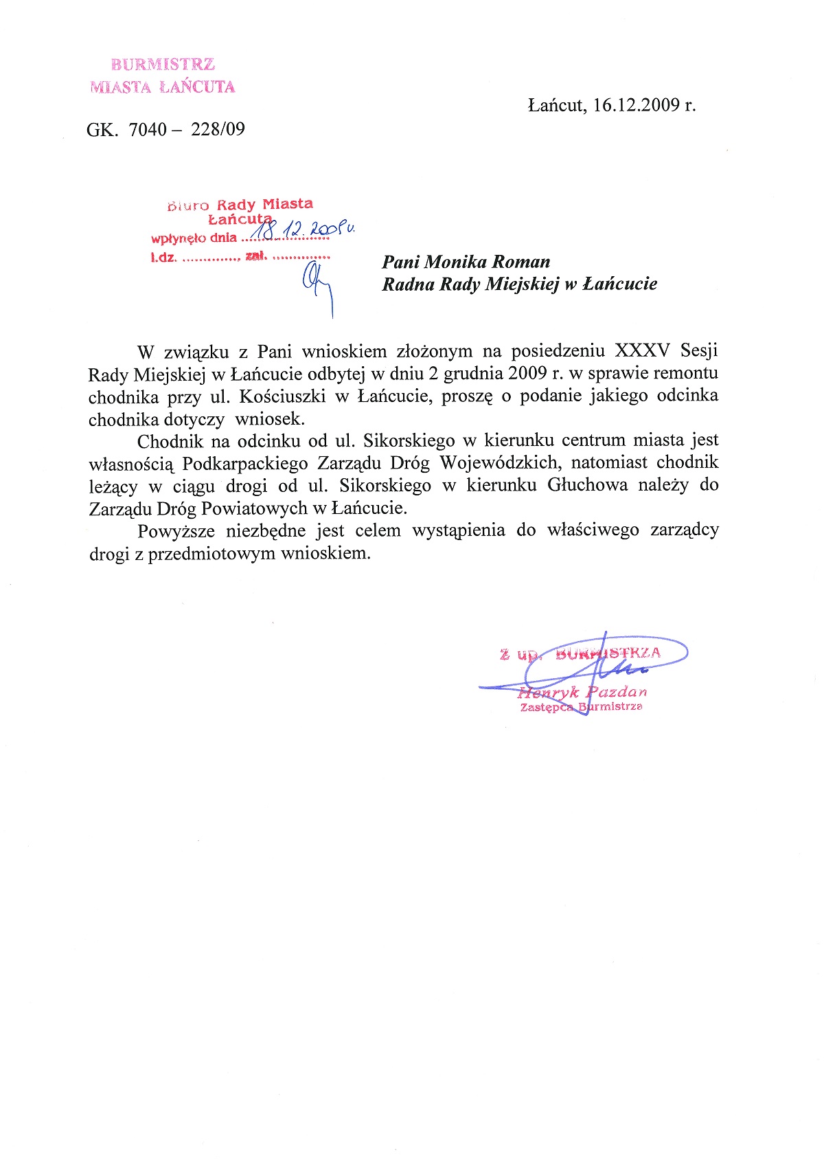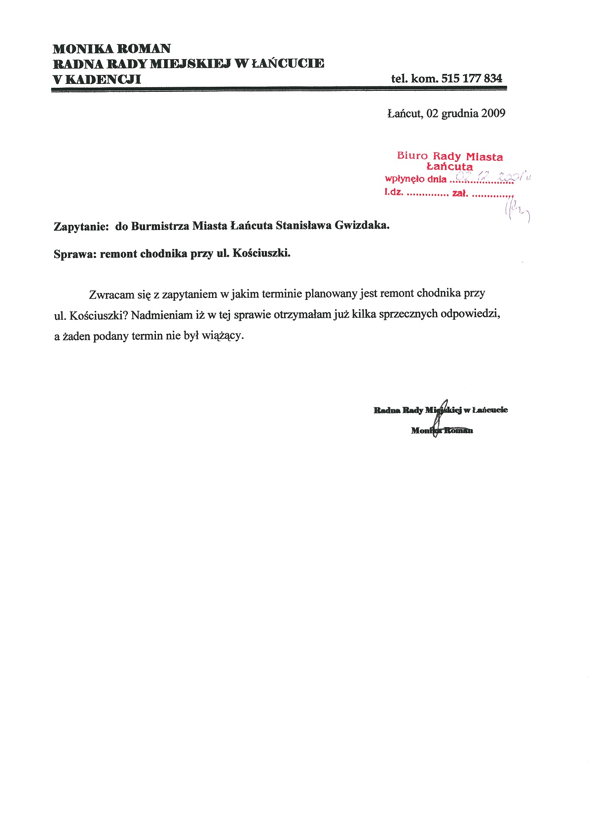 Inwestycja została zrealizowana w 2011 roku. Przebudowa chodnika przy ulicy Tadeusza Kościuszki była przedmiotem wielu moich interwencji. Obecnie, po chodniku wygodnie jeździ się dziecięcym wózkiem i jest on w pełni bezpieczny dla osób starszych.