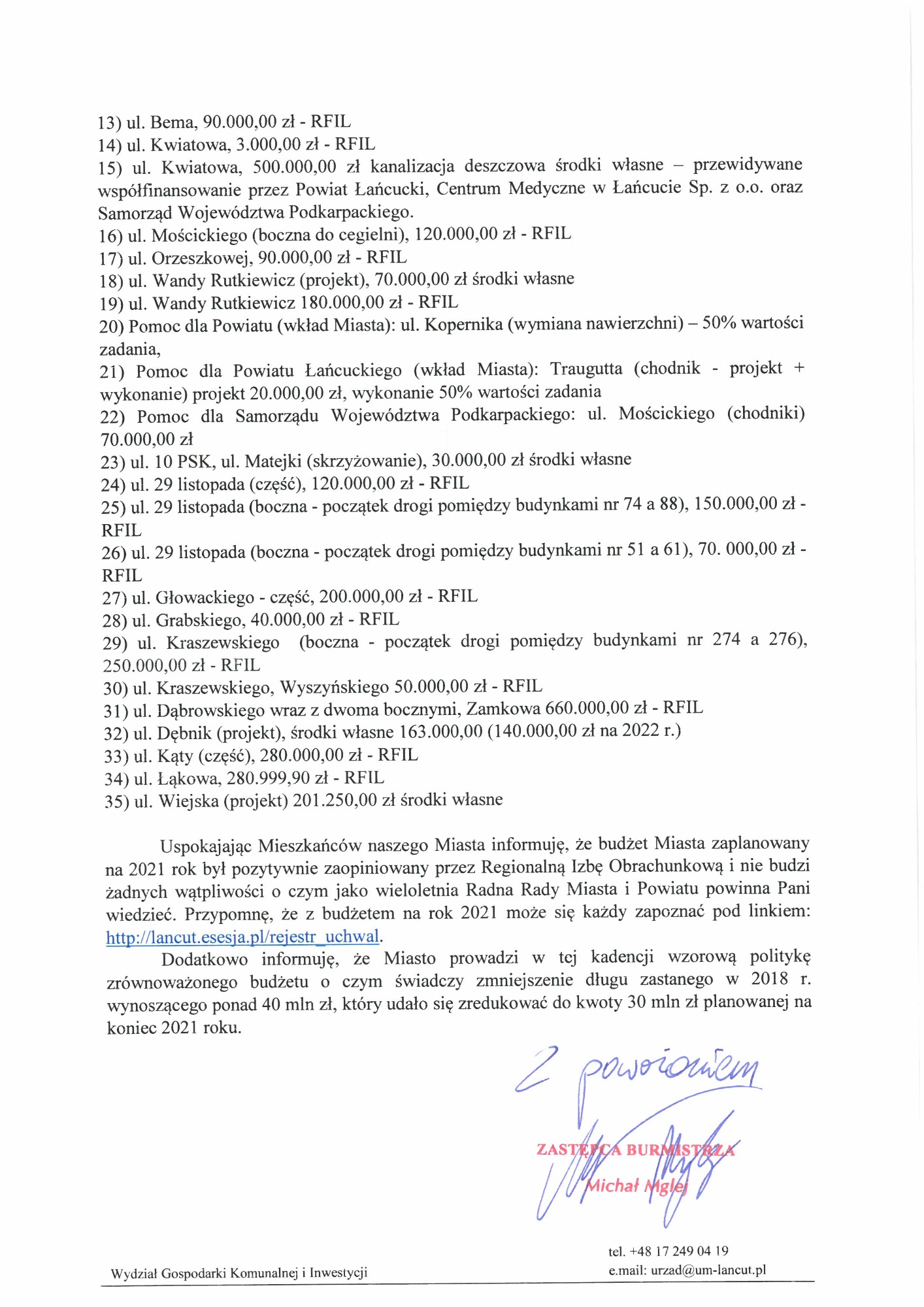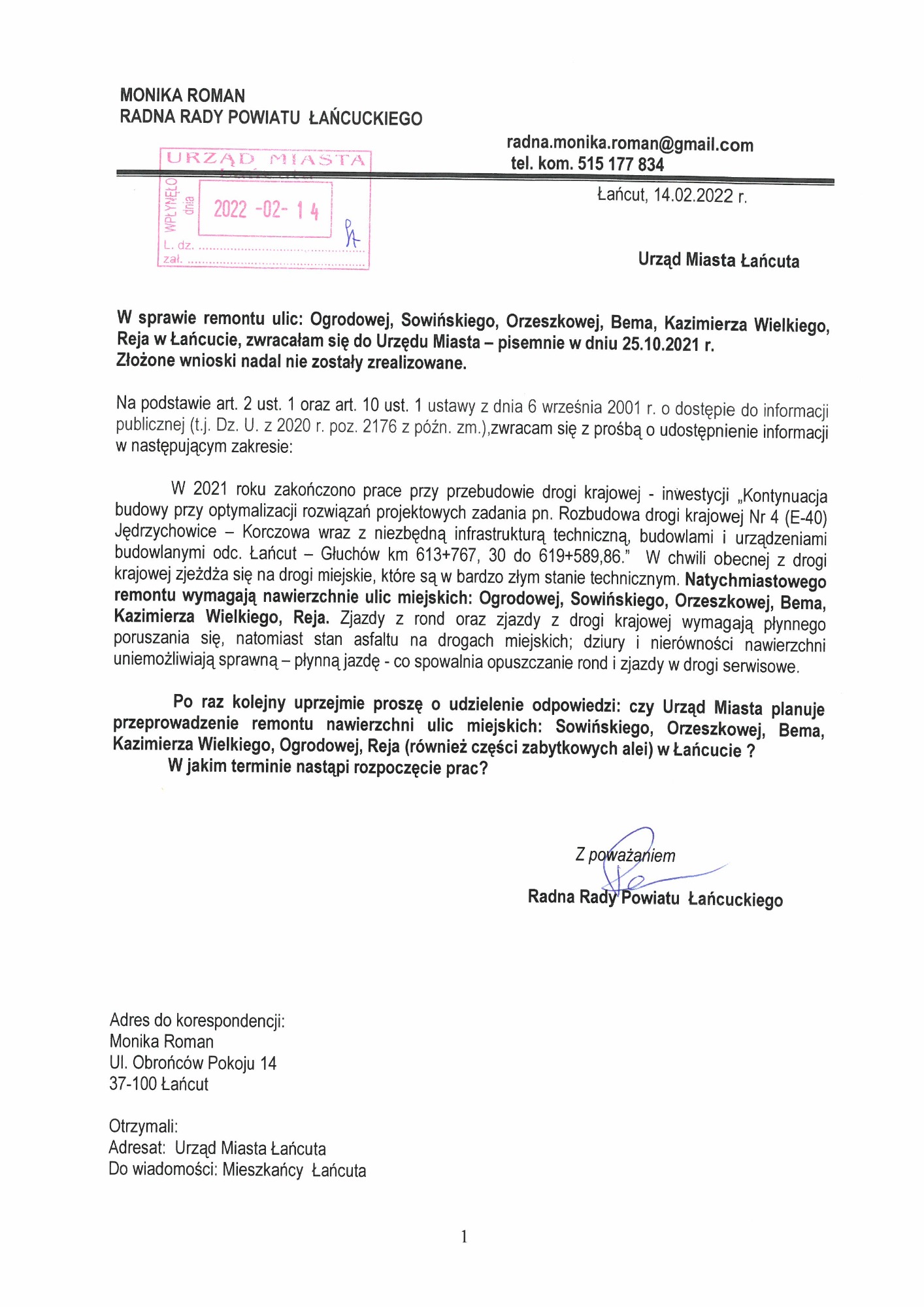 W poprzednich kadencjach samorządu; wspólnie z Mieszkańcami zbieraliśmy podpisy, składaliśmy prośby ustne i pisemne, dotyczące remontu nawierzchni dróg oraz budowy chodników. Wnioski zostały wpisane na listę zadań do realizacji. Wniosek na wymianę nawierzchni ulicy Podzamcze przeleżał szesnaście lat. Pierwszą interwencję w sprawie ulicy Podzamcze podjęłam w 2007 roku. Ciągłość działania samorządu gwarantuje, że wnioski raz złożone, pisma dostarczone do Urzędu Miasta, powinny być składowane do czasu zamknięcia sprawy, bez względu na to kto z imienia i nazwiska sprawuje urząd burmistrza.