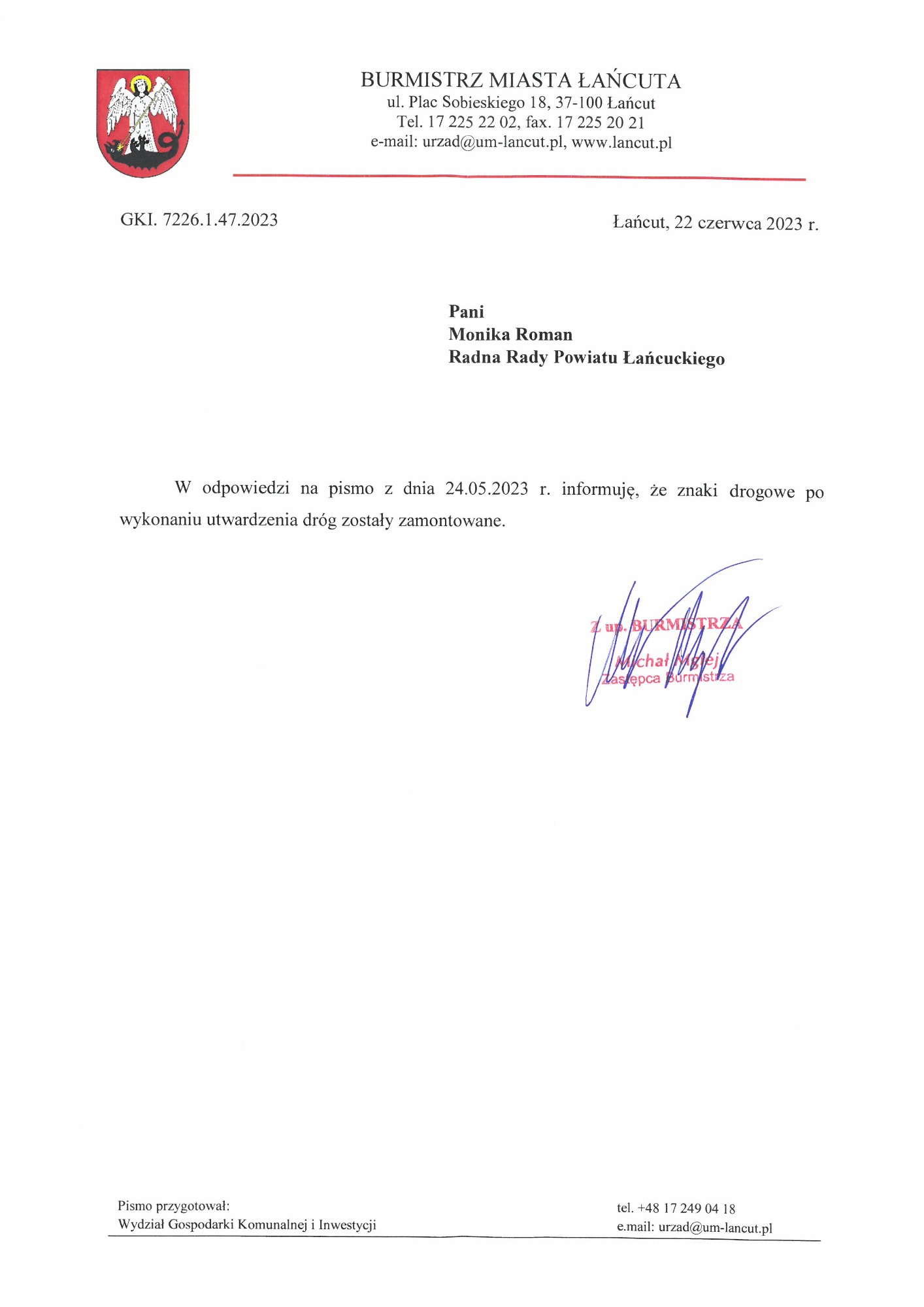 W bieżącej kadencji samorządu złożyłam do urzędu miasta szereg wniosków i interwencji w sprawie budowy, przebudowy, wymiany nawierzchni ulic: Słonecznej, Kazimierza Wielkiego, Ogrodowej, Generała Sowińskiego, Bema, Elizy Orzeszkowej, Mikołaja Reja. Wnioski dotyczyły także uzupełniania oznakowania po zakończonych remontach.