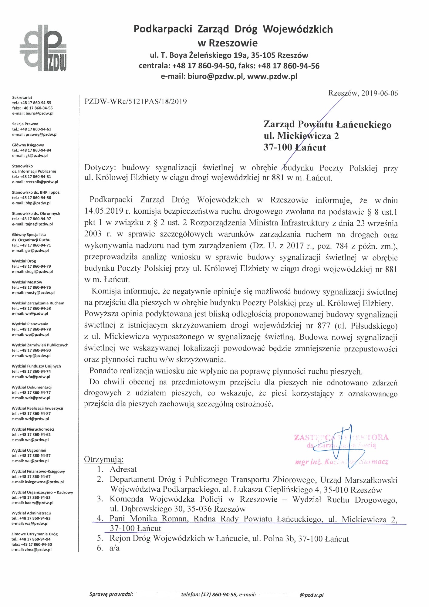 Odpowiadając na zgłoszenia od Państwa; kilkukrotnie interweniowałam i wnioskowałam o wybudowanie sygnalizacji świetlnej na DWÓCH RÓŻNYCH przejściach dla pieszych: obok budynku poczty w centrum Łańcuta oraz obok delikatesów i szkoły w ciągu ulicy Podzwierzyniec.