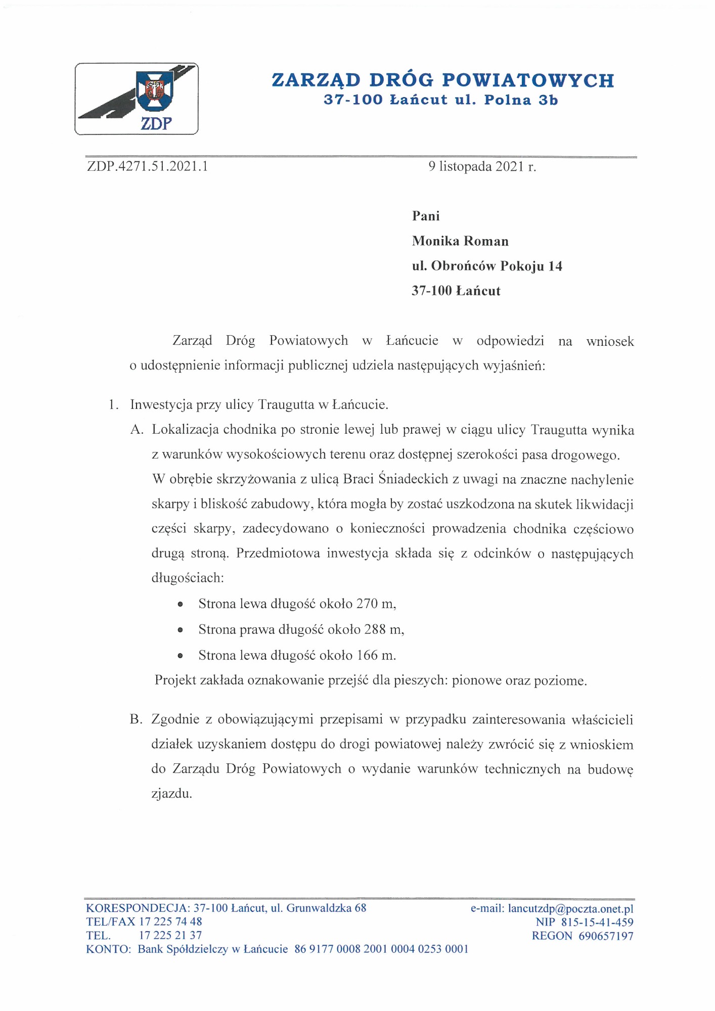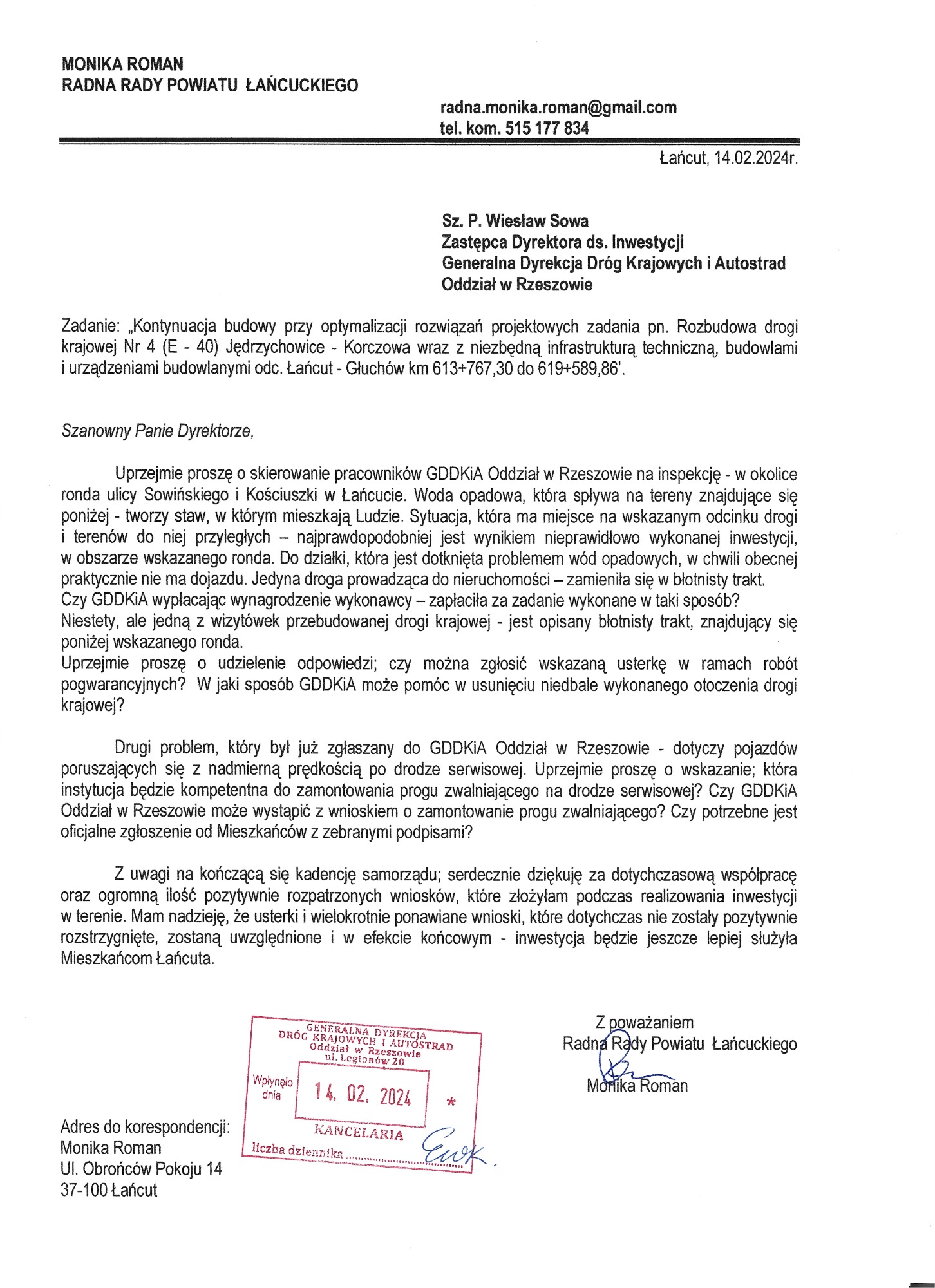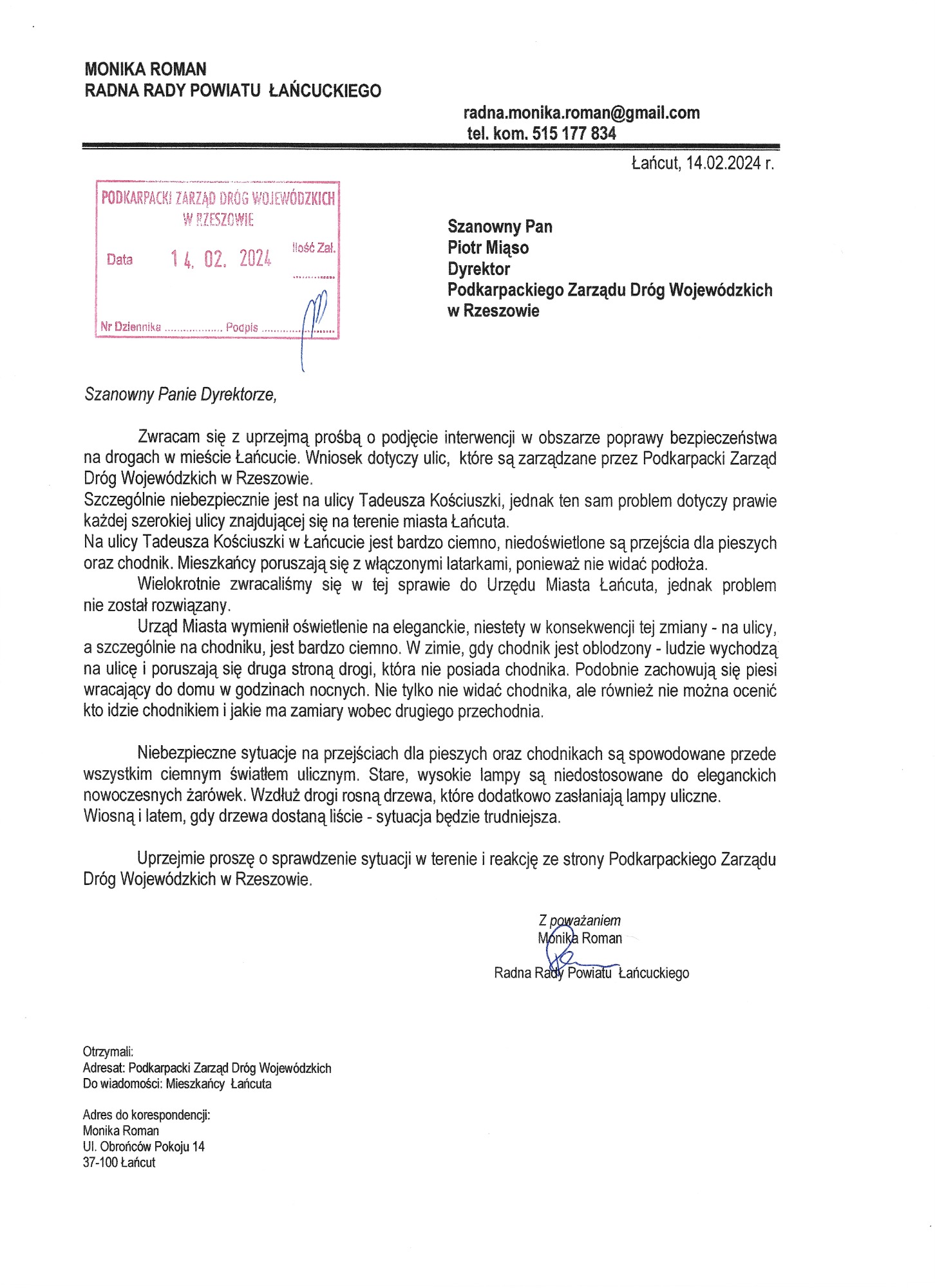 Problem wielokrotnie omówiłam podczas posiedzeń Komisji Ochrony Środowiska, Rolnictwa, Leśnictwa, Porządku i Bezpieczeństwa Publicznego Rady Powiatu Łańcuckiego. Poniżej znajduje się skan pisma do aktualnego zarządcy drogi – Zarządu Dróg Wojewódzkich w Rzeszowie.