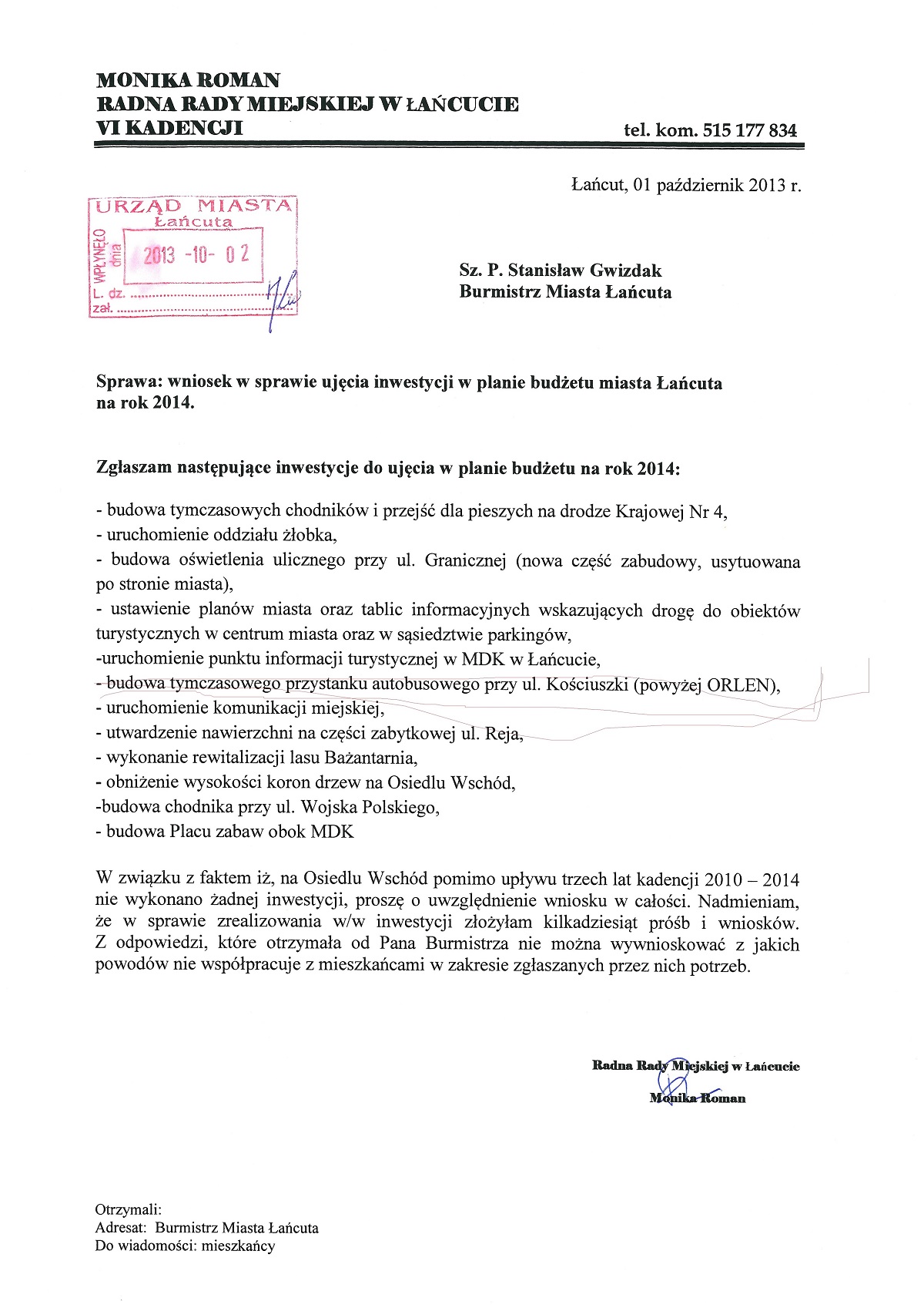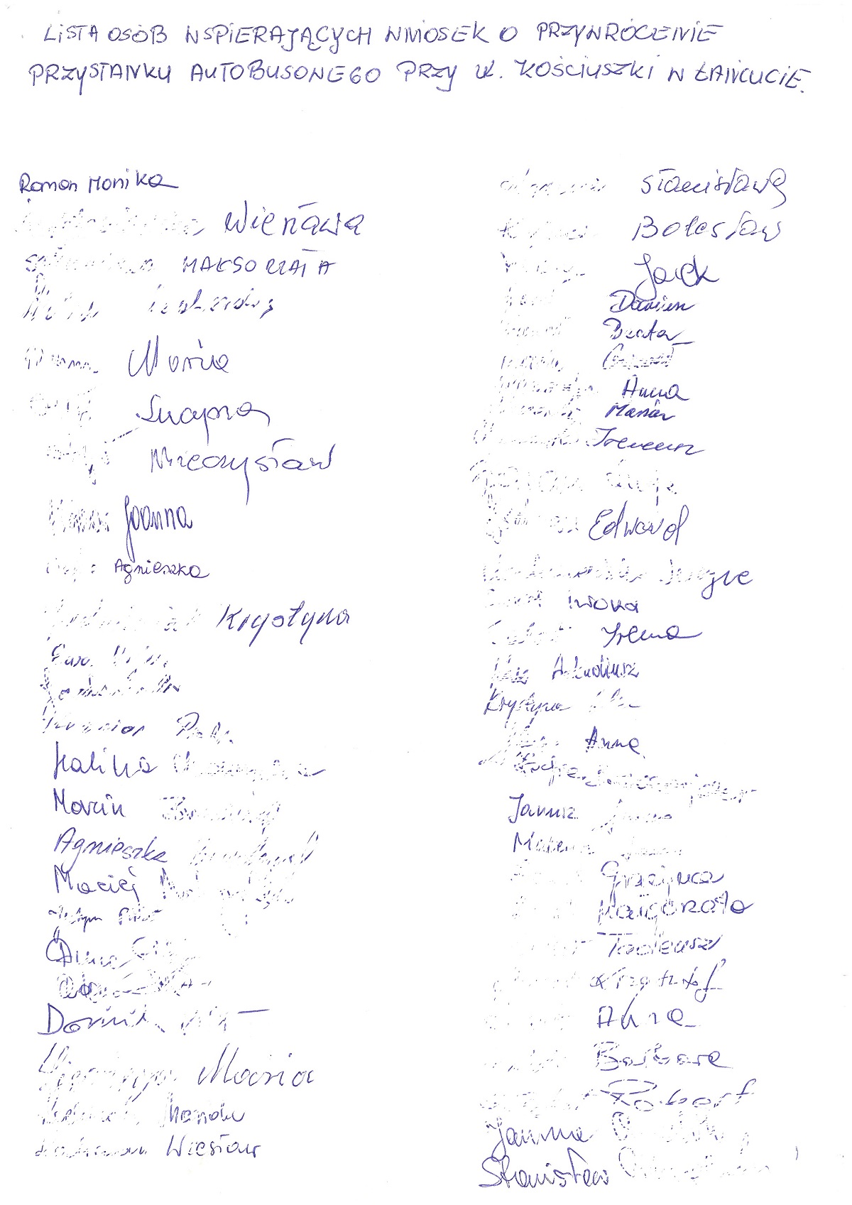 Efektem końcowym starań jest nowoczesna zatoka autobusowa, z bezpiecznym zajazdem i utwardzeniem wykonanym kostką brukową. Pierwsze pismo w sprawie przywrócenia przystanku autobusowego przy ulicy Tadeusza Kościuszki złożyłam w styczniu 2011 roku. Nastąpiło to na wniosek mieszkańców Osiedla "Wschód". W tej sprawie zebrałam ponad pięćdziesiąt podpisów. Pozytywną odpowiedź otrzymałam w kwietniu 2013 roku. W dniu 8 sierpnia 2014 roku zawarto umowę na realizację przedmiotowego zadania.