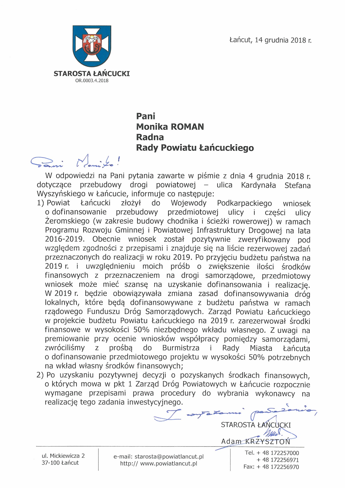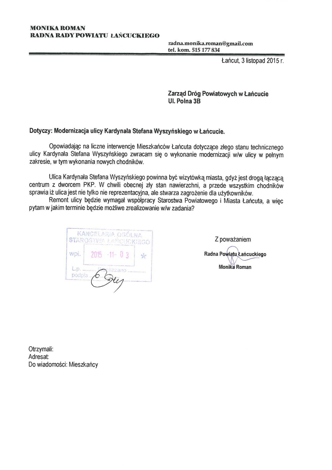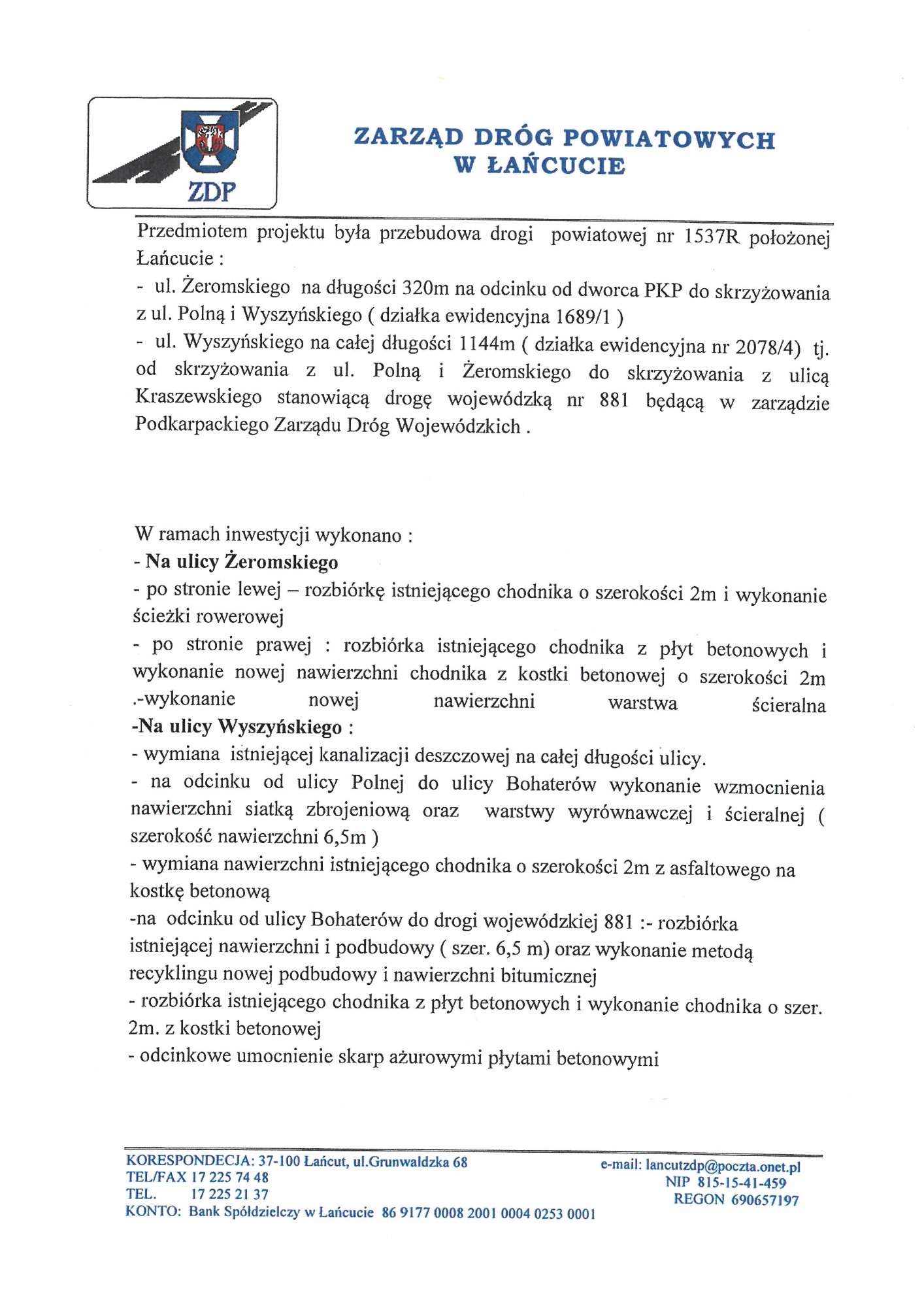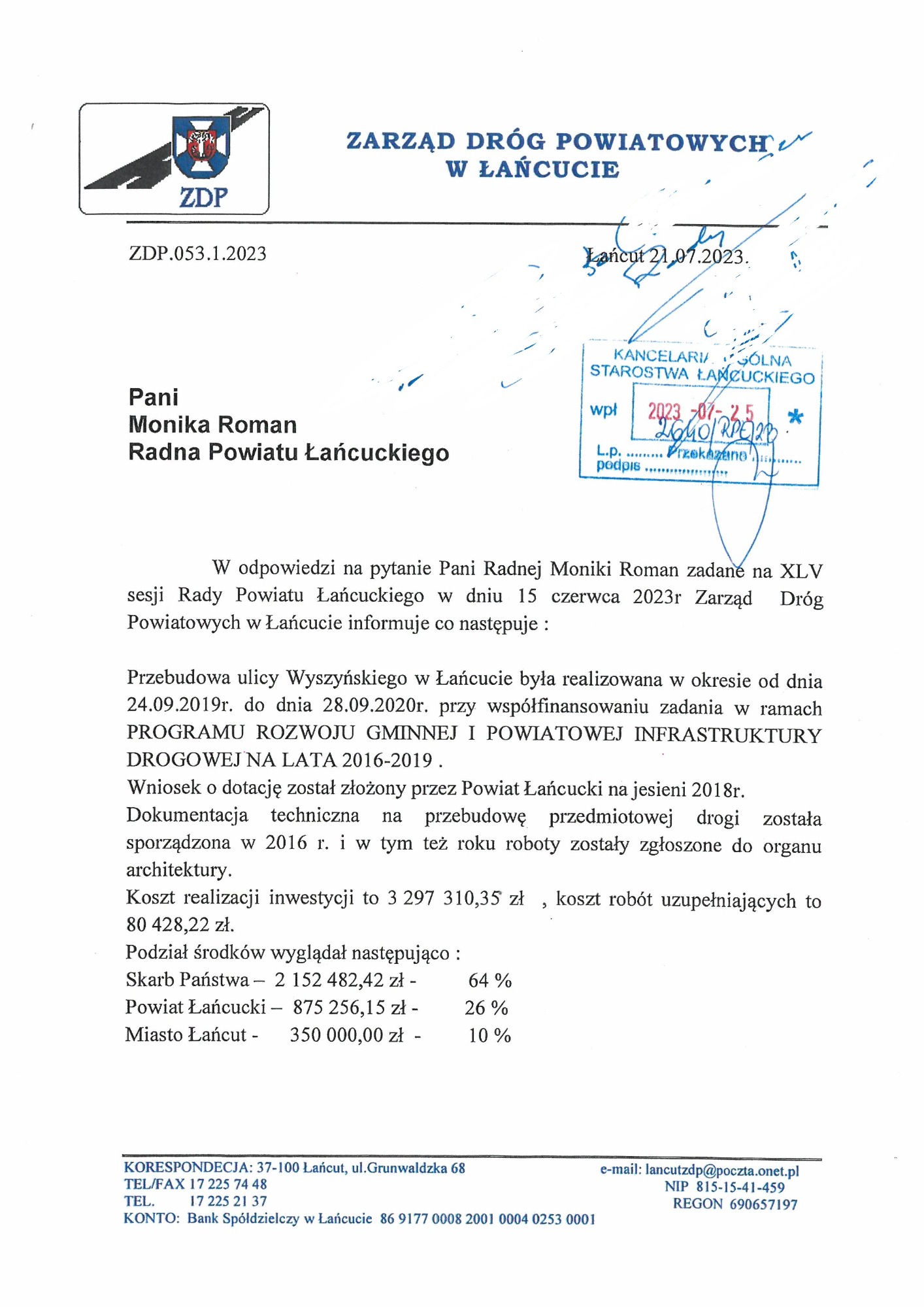 Ulica Kardynała Stefana Wyszyńskiego należy do kategorii dróg powiatowych. W poprzedniej kadencji samorządu tj. w latach 2014 - 2018 w starostwie powiatowym przygotowano dokumenty techniczne, niezbędne do złożenia wniosku o dofinasowanie. Inwestycja w terenie została wykonana w obecnej kadencji samorządu. Przebudowa ulicy była możliwa dzięki determinacji Dyrekcji i Pracowników Zarządu Dróg Powiatowych w Łańcucie.