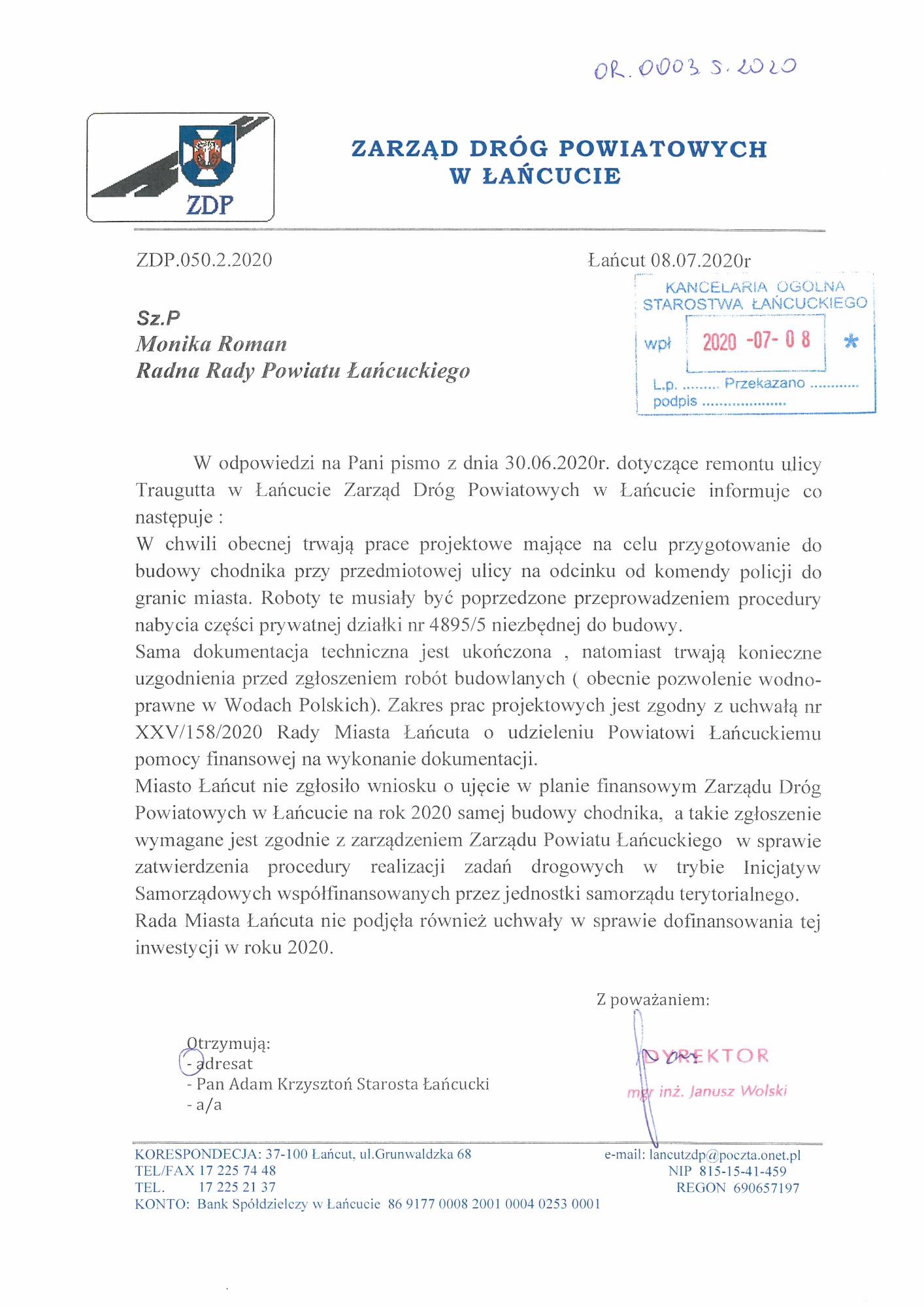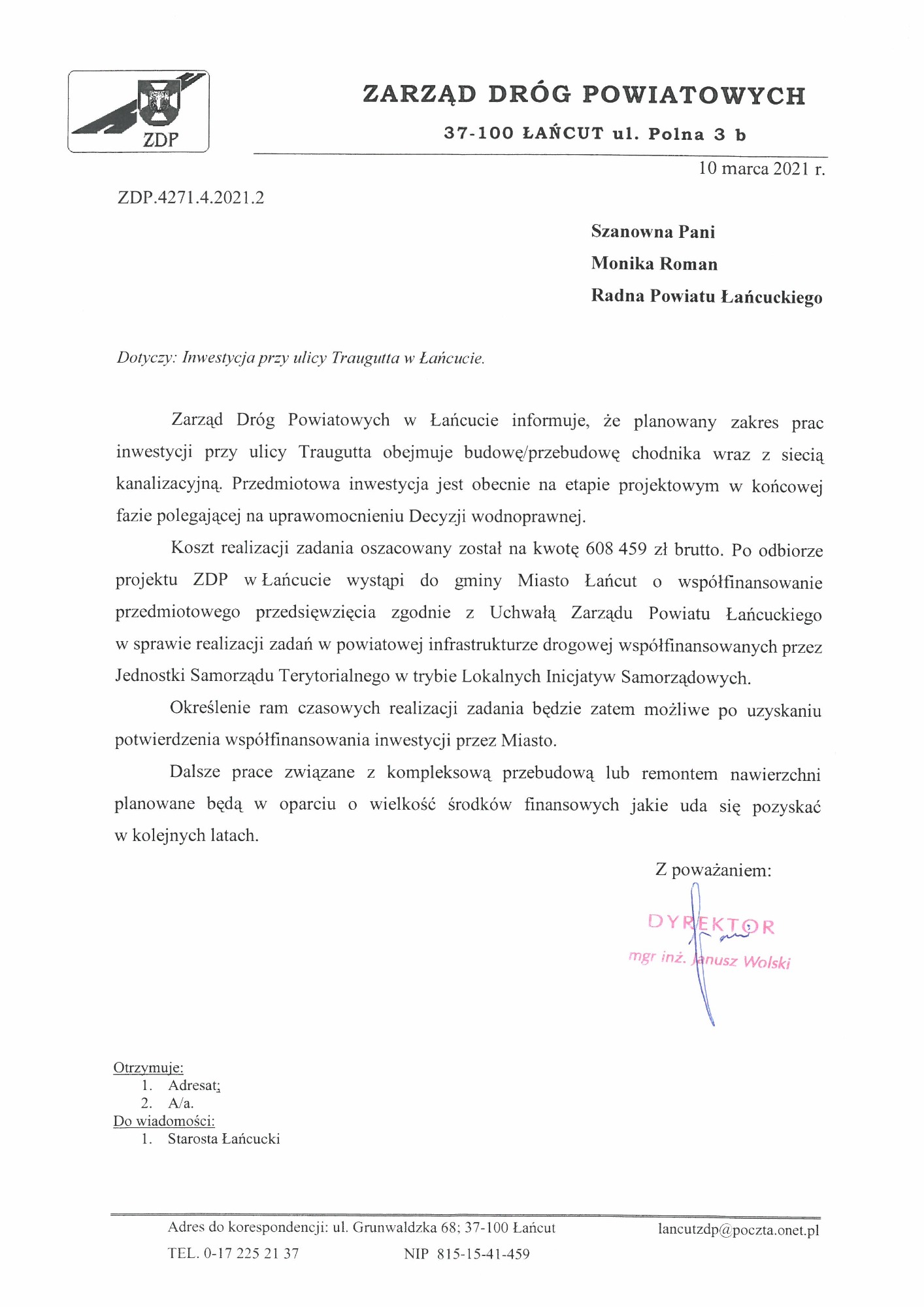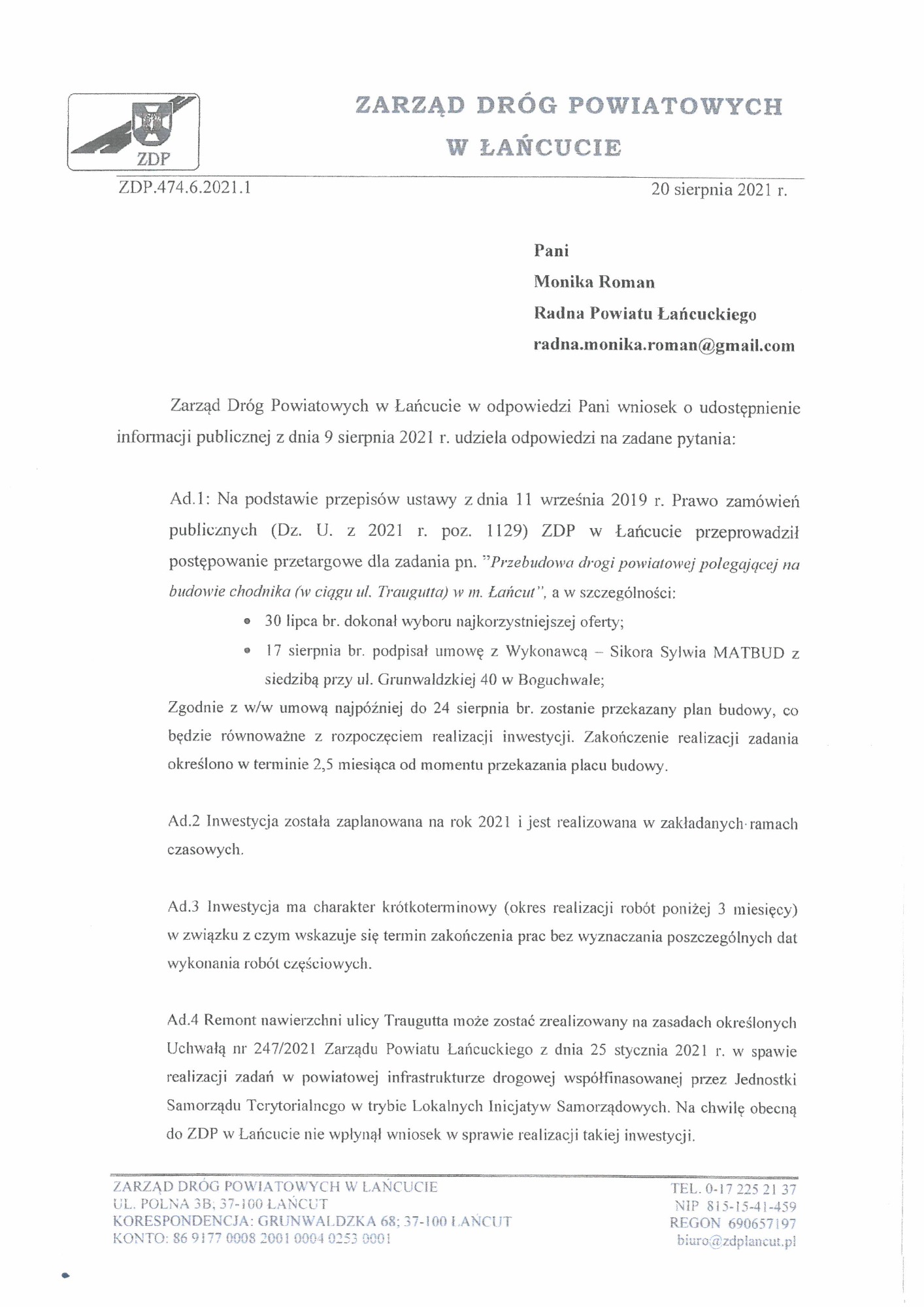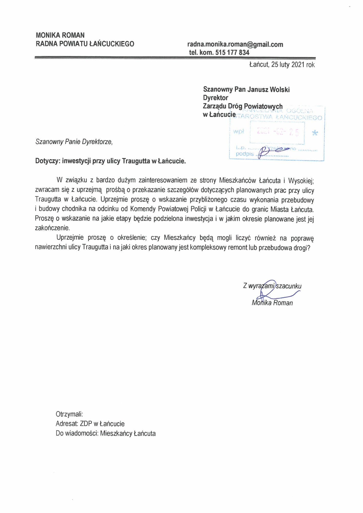 Zapraszam do zapoznania się ze skanami wniosków, które złożyłam w sprawie budowy chodnika na ulicy Romualda Traugutta w Łańcucie. Inwestycja została wykonana przez Zarząd Dróg Powiatowych w Łańcucie.