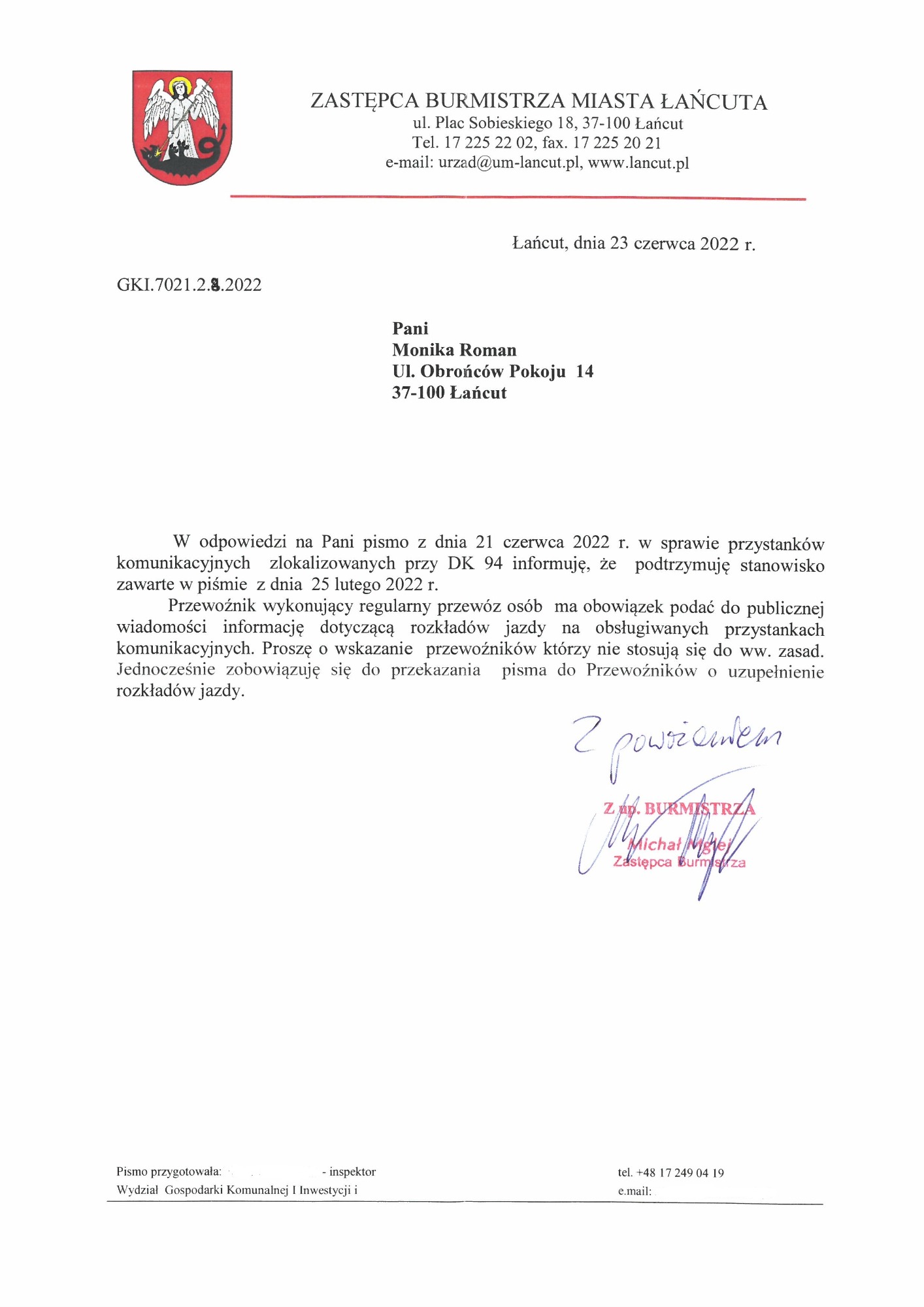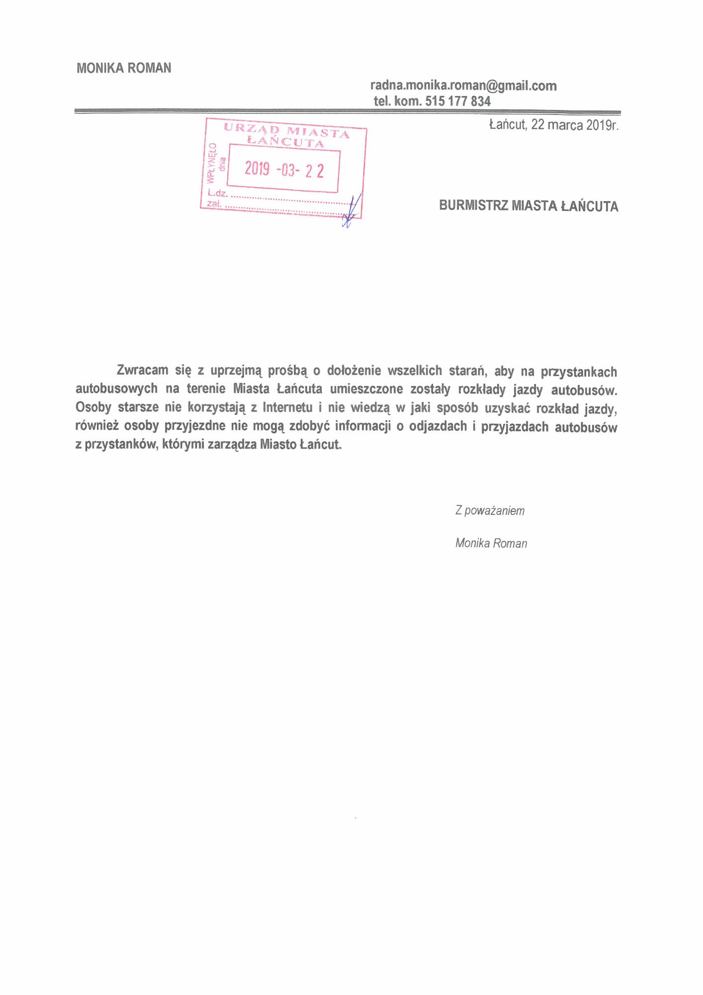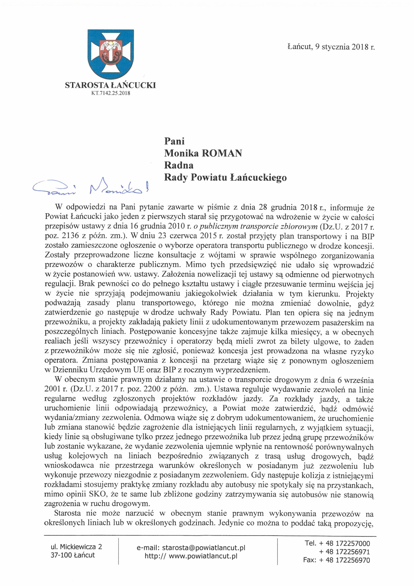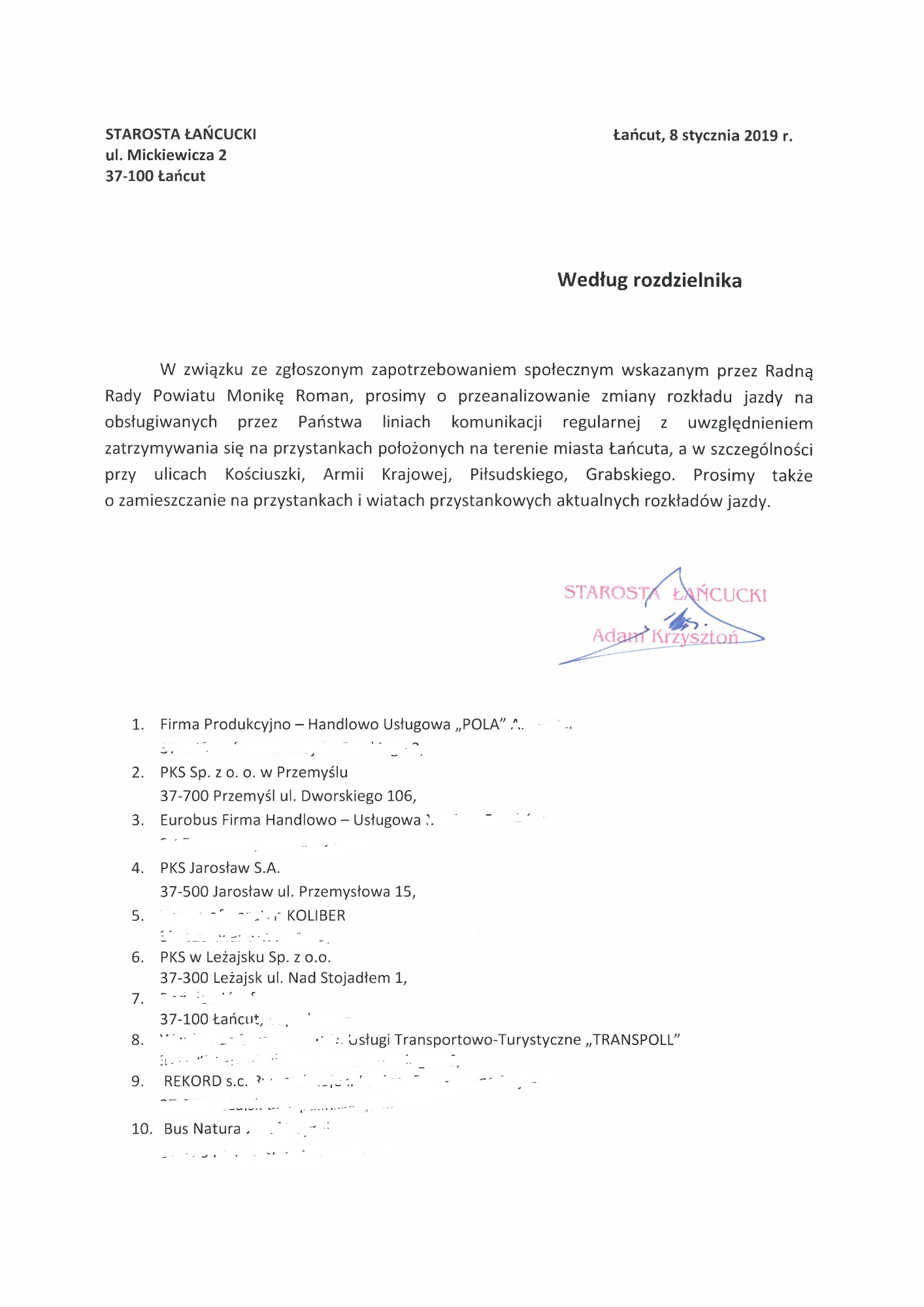 Serdecznie zapraszam Państwa do zapoznania się ze skanami korespondencji w sprawie funkcjonowania komunikacji w mieście i w powiecie.