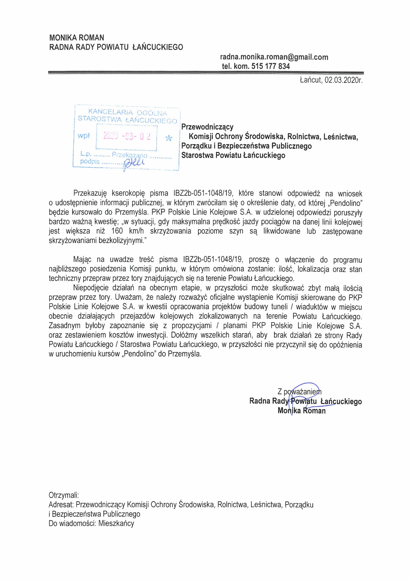 Zwróciłam się z prośbą do POLREGIO S.A. o wprowadzenie kursu nocnego do rozkładu jazdy pociągów. Kurs nocny na trasie Rzeszów – Przeworsk, około godziny 1 w nocy. Widzę potrzebę wprowadzenia takiego połączenia – szeroko ten temat uzasadniłam wypowiadając się podczas sesji Rady Powiatu Łańcuckiego. Aktualnie ostatni pociąg z Rzeszowa do Łańcuta odjeżdża około 23:30. Pasażer, który nie zdążył – zostaje na noc, na peronie. Łańcucianie, którzy wracają z turnusów rehabilitacyjnych, sanatoriów, studenci wracający z uczelni, Mieszkańcy Łańcuta i Powiatu Łańcuckiego wracający z wakacji, lub po prostu z pracy, – jeżeli nie zdążą na ostatni pociąg, który odjeżdża po godzinie 23:30 – muszą czekać do rana. Pierwsze połączenie jest wykonywane około godziny 5:00. Sześć godzin to zbyt długa przerwa w komunikacji. Odległość z Łańcuta do Rzeszowa to tylko lub aż: 17 kilometrów.