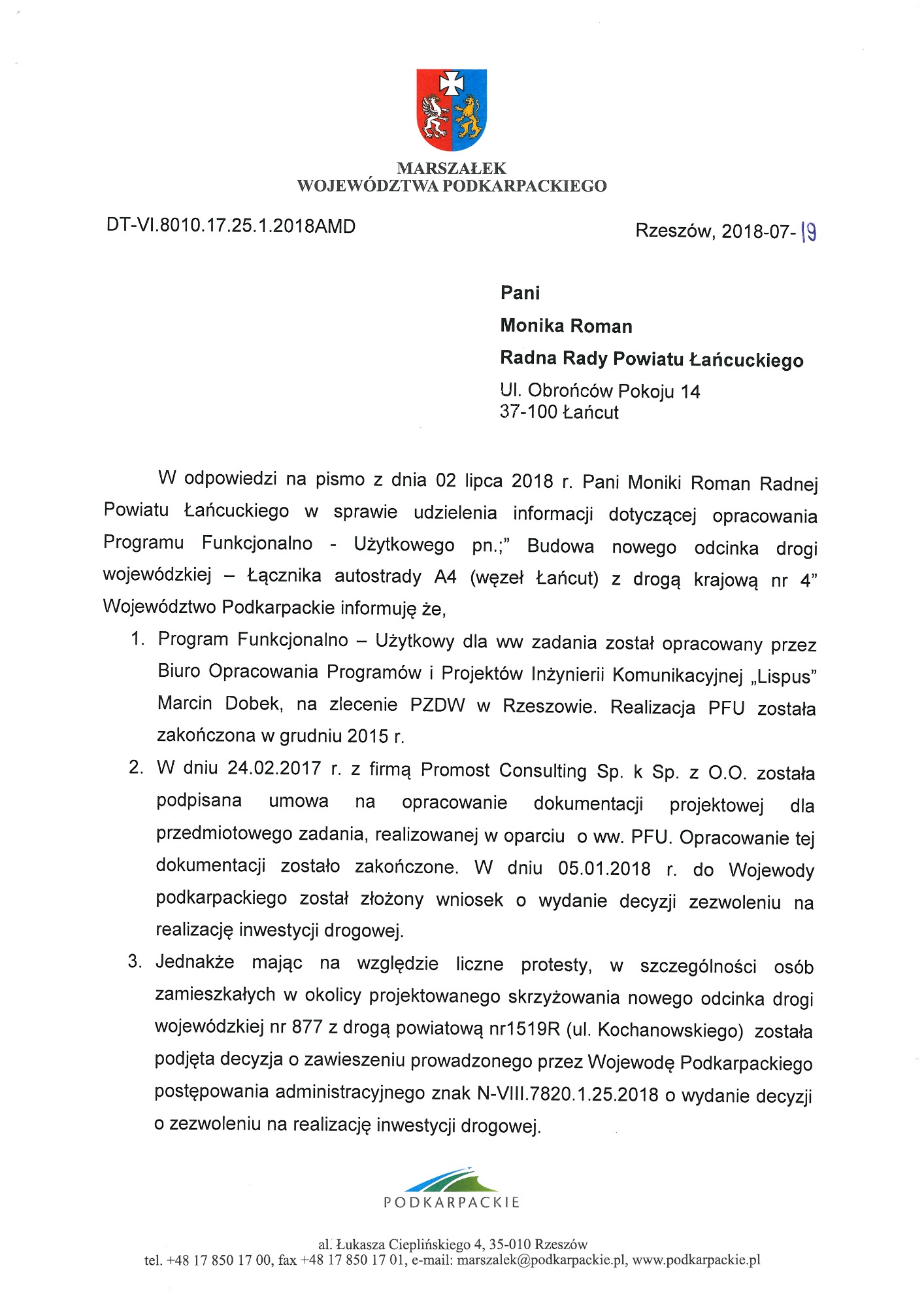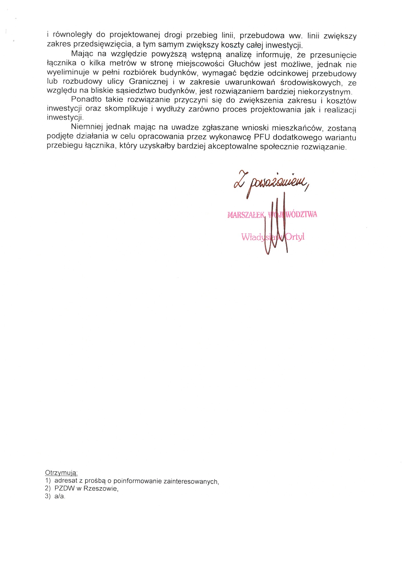 Zgodnie z pismem Urzędu Marszałkowskiego Województwa Podkarpackiego z 2018 roku postępowanie dotyczące budowy łącznika zostało zawieszone przez Wojewodę Podkarpacką. Pisma od Władz Województwa Podkarpackiego znajdują się w galerii, zapraszam do zapoznania się z dokumentami.