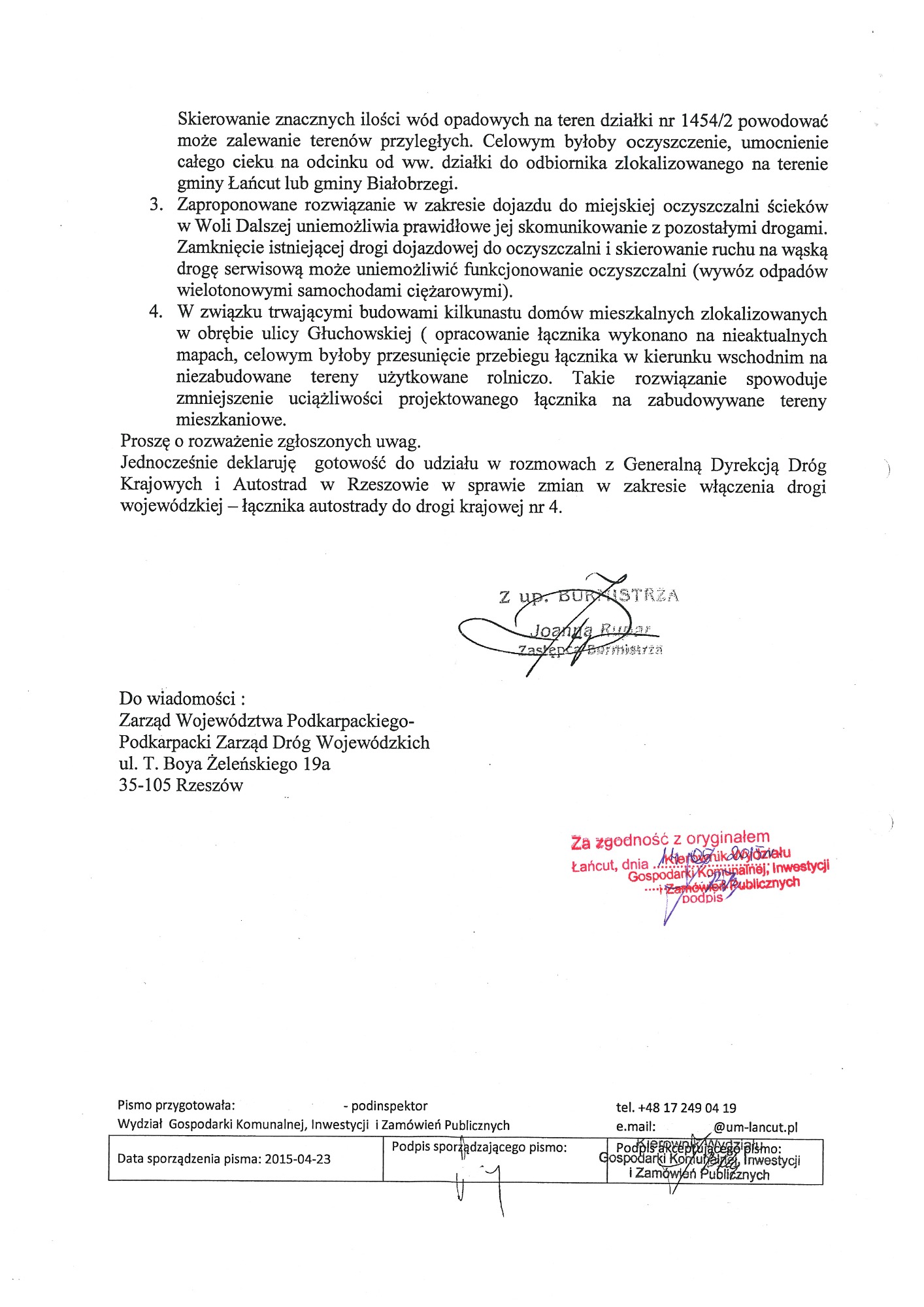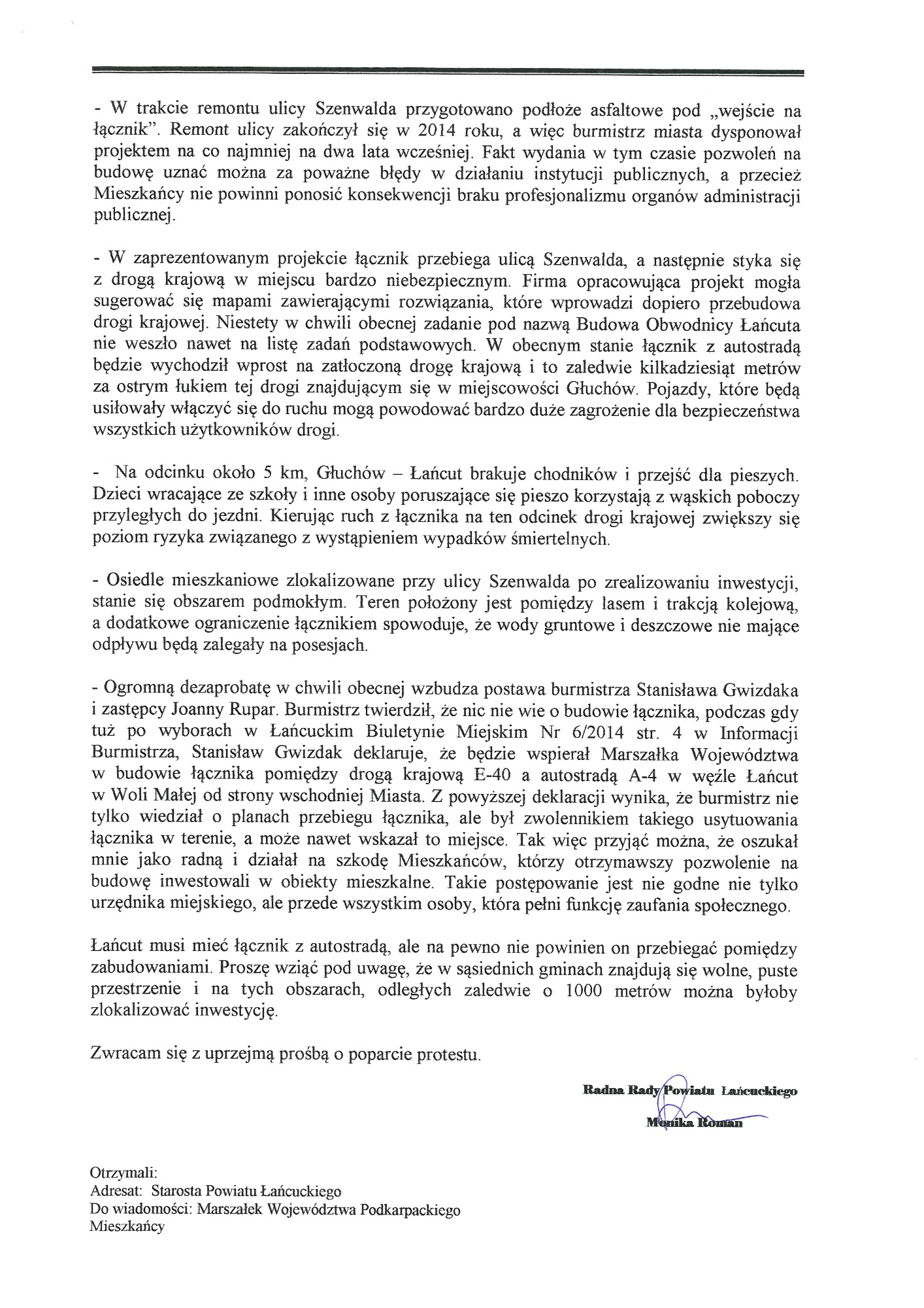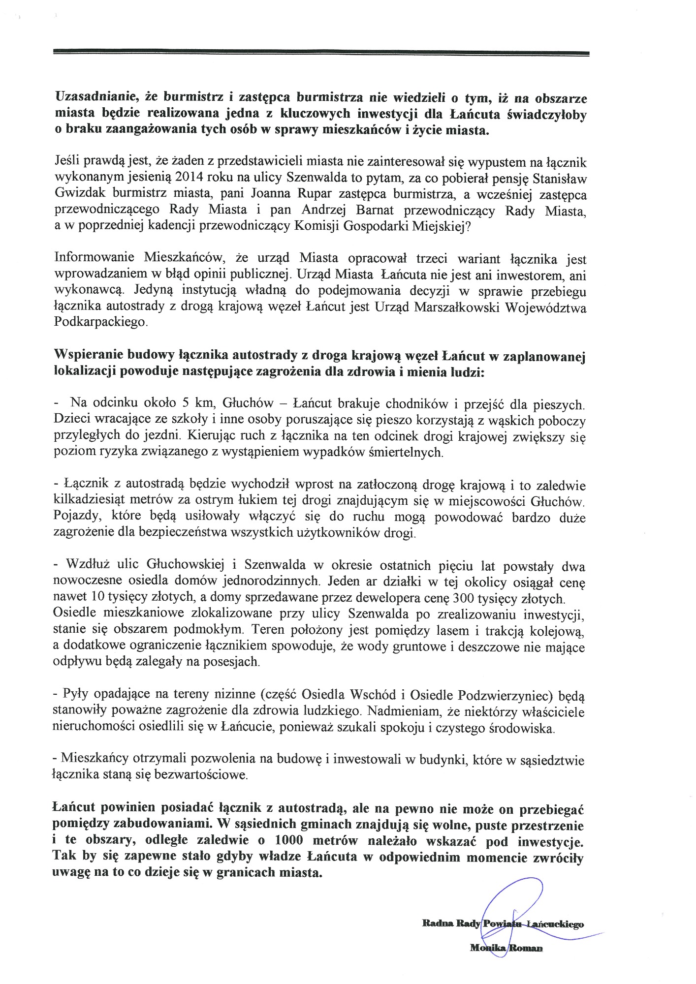 Łącznik jest potrzebny miastu takiemu jak Łańcut, ale w przemyślanej lokalizacji; która nie zablokuje drogi krajowej i będzie bezpieczna dla rodzin - Mieszkańców domów jednorodzinnych. Łącznik powinien wychodzić na drogę krajową w miejscu, gdzie ma ona cztery pasy, a nie dwa, tak jak obecnie został on zaprojektowany ! Burmistrz pan Stanisław Gwizdak i zastępca burmistrza pani Joanna Rupar otrzymali od Urzędu Marszałkowskiego Województwa Podkarpackiego szanse na opracowanie innego wariantu przebiegu łącznika. Niestety z tej szansy nie skorzystali, ponownie zgłosili do realizacji ten sam wariant przebiegu łącznika z niewielkimi przesunięciami.