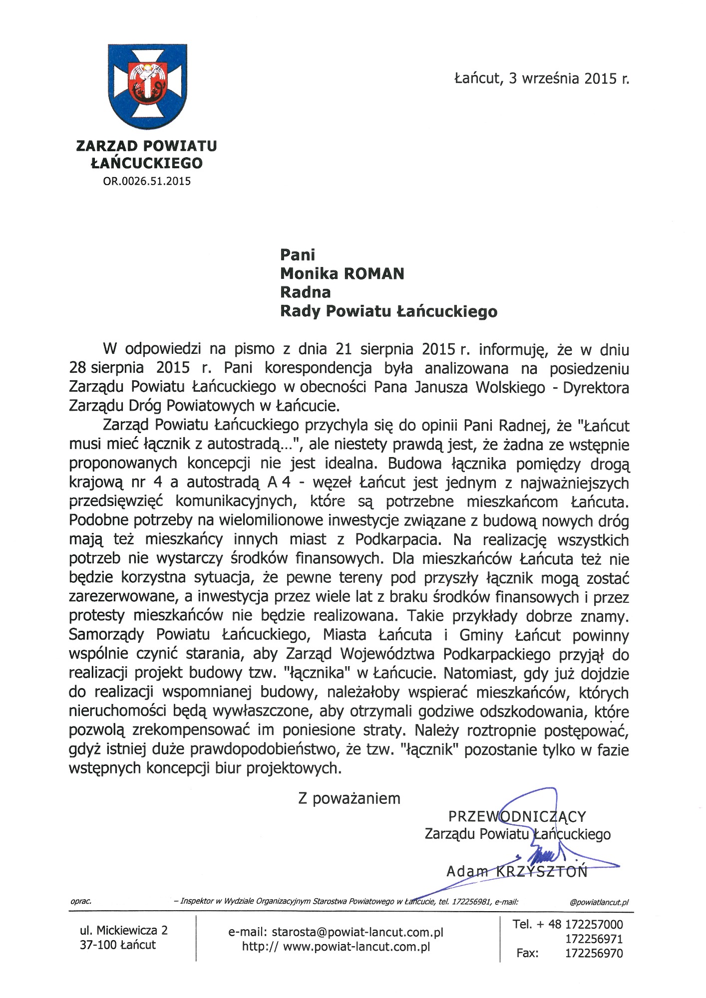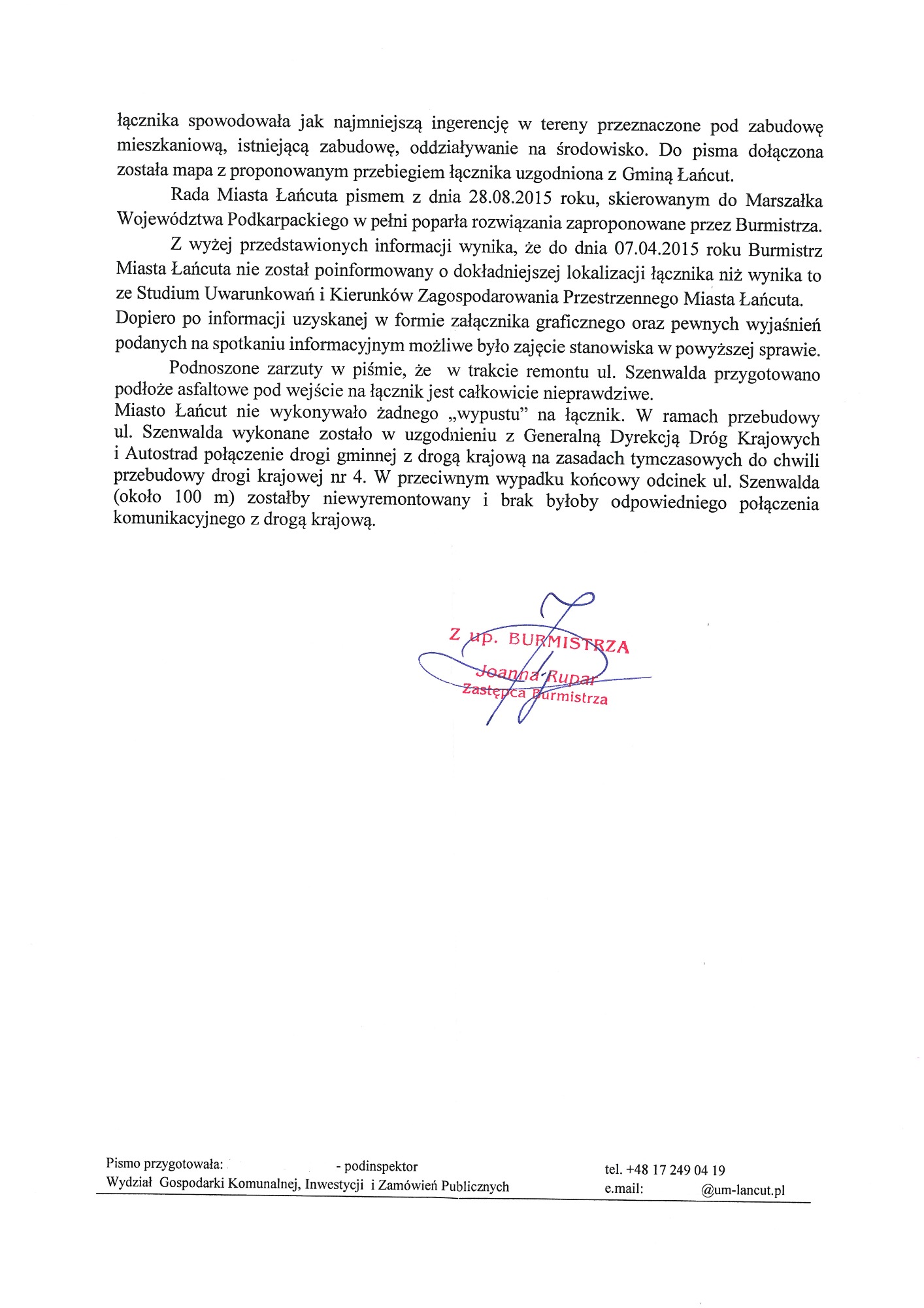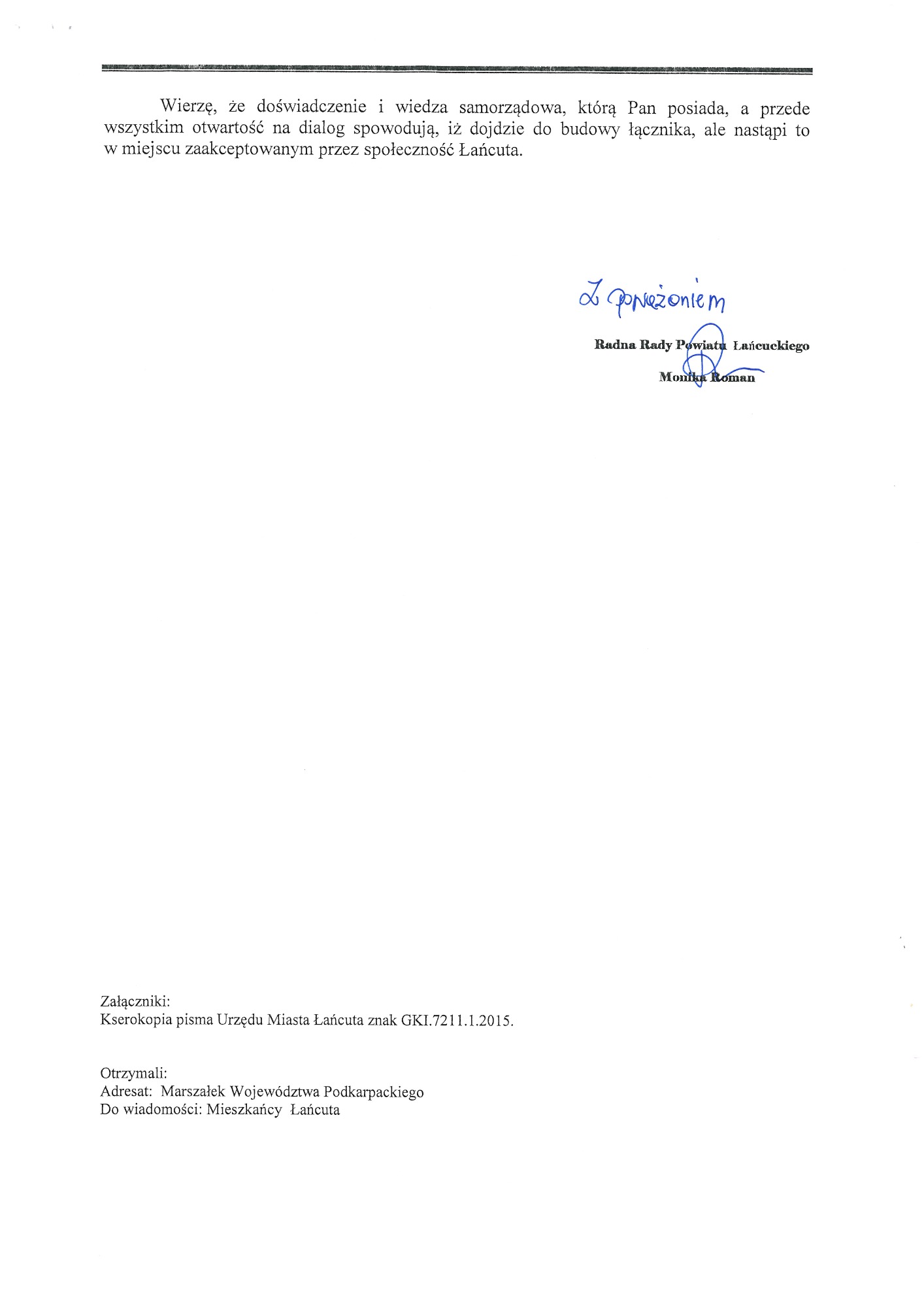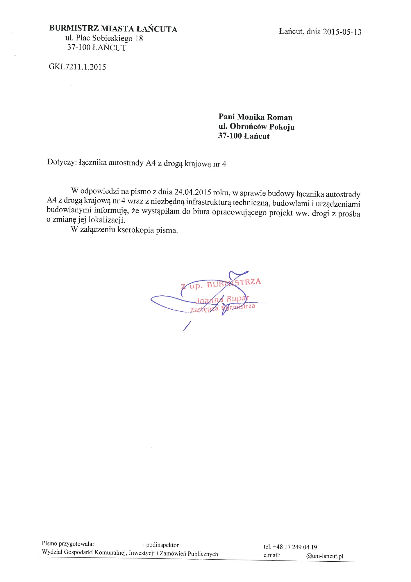 Łącznik jest potrzebny miastu takiemu jak Łańcut, ale w przemyślanej lokalizacji; która nie zablokuje drogi krajowej i będzie bezpieczna dla rodzin - Mieszkańców domów jednorodzinnych. Łącznik powinien wychodzić na drogę krajową w miejscu, gdzie ma ona cztery pasy, a nie dwa, tak jak obecnie został on zaprojektowany ! Burmistrz pan Stanisław Gwizdak i zastępca burmistrza pani Joanna Rupar otrzymali od Urzędu Marszałkowskiego Województwa Podkarpackiego szanse na opracowanie innego wariantu przebiegu łącznika. Niestety z tej szansy nie skorzystali, ponownie zgłosili do realizacji ten sam wariant przebiegu łącznika z niewielkimi przesunięciami.