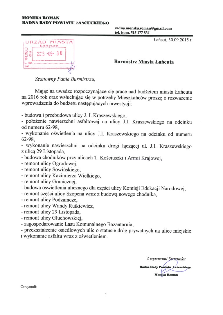 Modernizacja ulicy Józefa Ignacego Kraszewskiego była jedną z moich obietnic wyborczych. Zebrałam około 300 podpisów pod wnioskiem o realizację inwestycji. Wniosek wraz z podpisami przekazałam do Urzędu Marszałkowskiego Województwa Podkarpackiego. Poparcie społeczne było jednym z decydujących czynników, który przyczynił się do wybrania właśnie tej inwestycji do dofinansowania z funduszy europejskich !