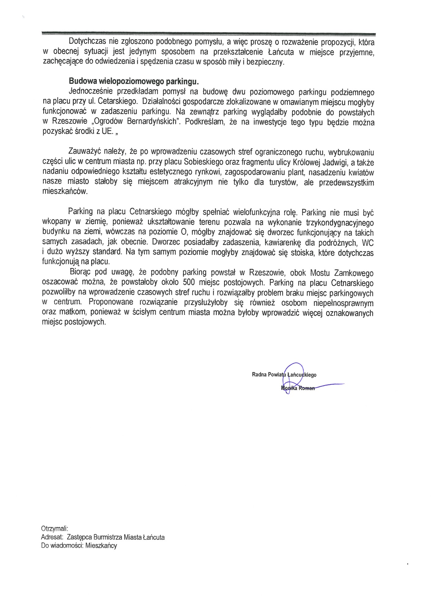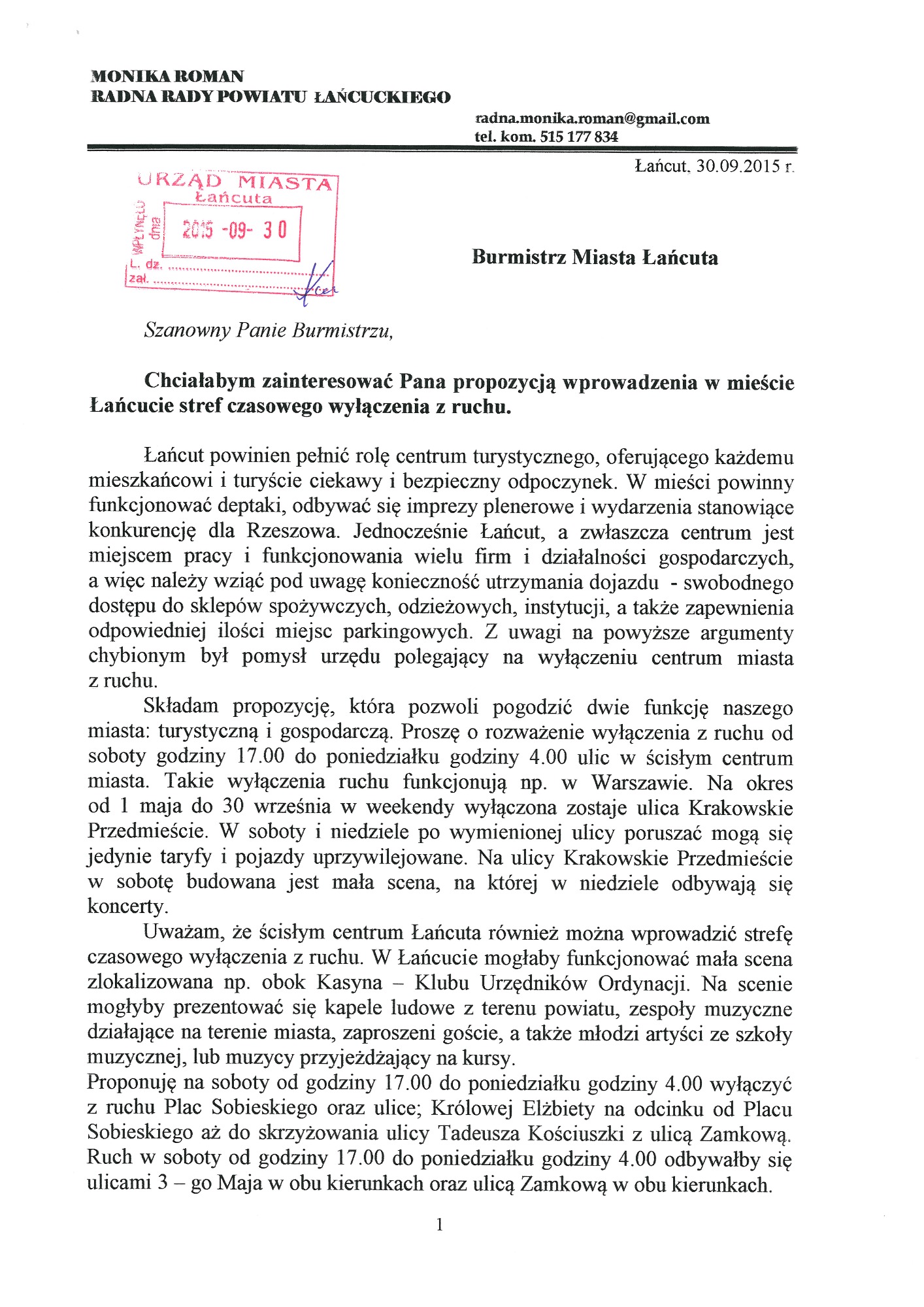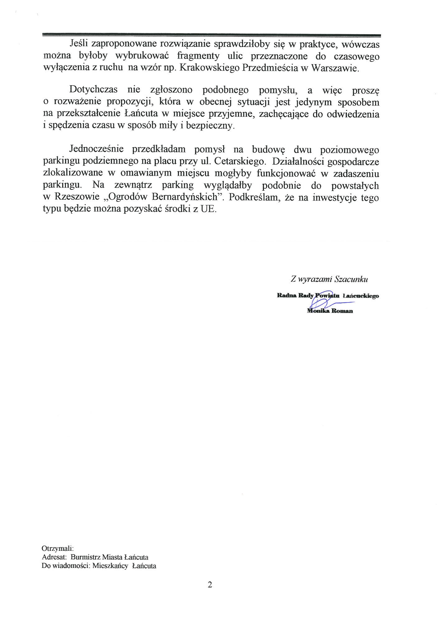 W kadencji przypadającej na lata 2014 - 2018, jako radna Powiatu Łańcuckiego, zaproponowałam władzom miasta rozwiązanie stosowane w Warszawie tzn. czasowe wyłączenie ulic z ruchu. Rozwiązanie polega na wybrukowaniu dwóch ulic kostką, po której mogą poruszać się samochody, a następnie wyłączaniu tych ulic z ruchu tylko na czas weekendu tzn. od godziny 16:00 w sobotę do 24:00 w niedzielę, lub do 3:00 w poniedziałek. Takie rozwiązanie funkcjonuje w Warszawie na ulicy Krakowskie Przedmieście. W weekendy na Krakowskim Przedmieściu funkcjonuje deptak, stoją krzesełka z lokalnych kawiarenek, natomiast od poniedziałku do piątku po ulicy jeżdżą samochody i autobusy. Myślę, że jest to dobre rozwiązanie na zachęcenie turystów, rozwój gastronomii i dla Nas – Mieszkańców Łańcuta. Każdy chciałby w niedzielę wyjść do miasta na lody i bezpiecznie pospacerować, zwłaszcza jeśli wychodzi z małymi dziećmi.