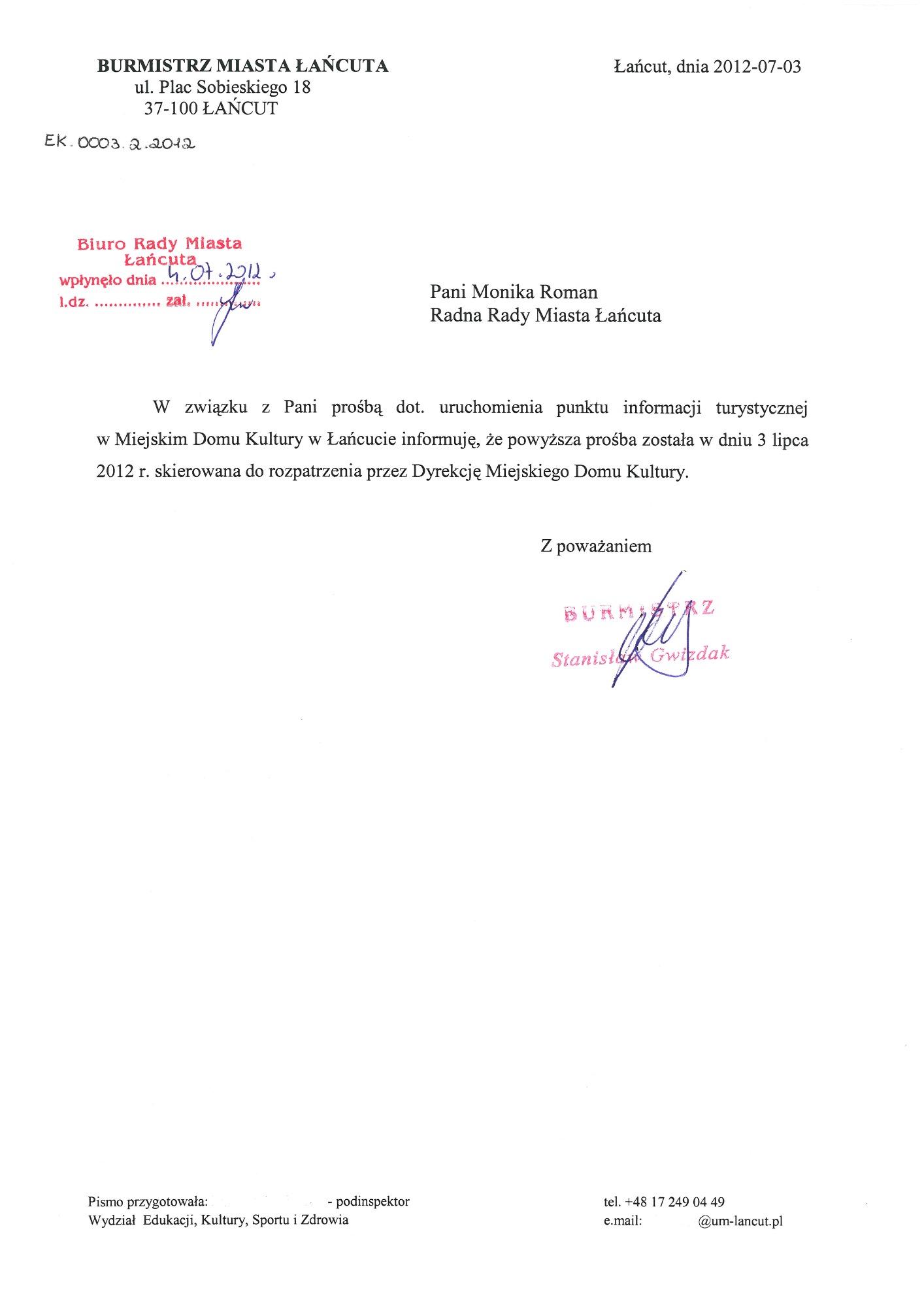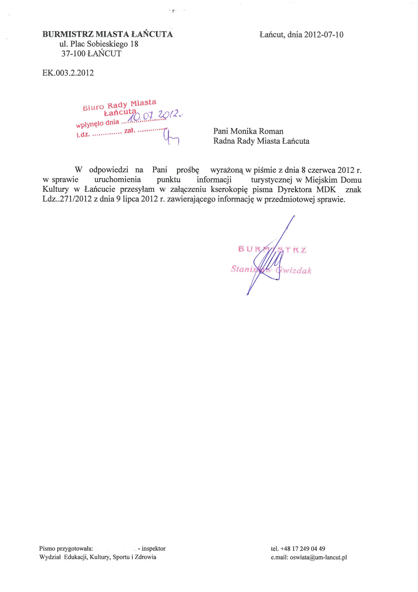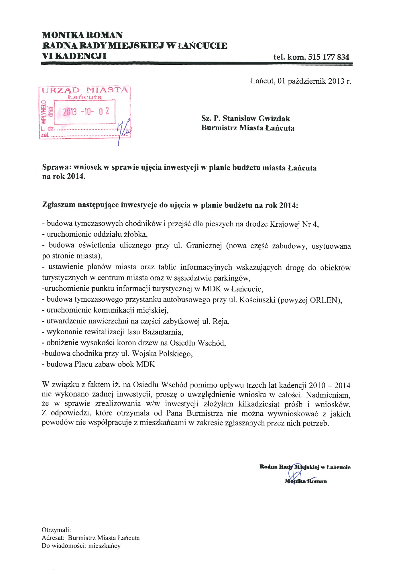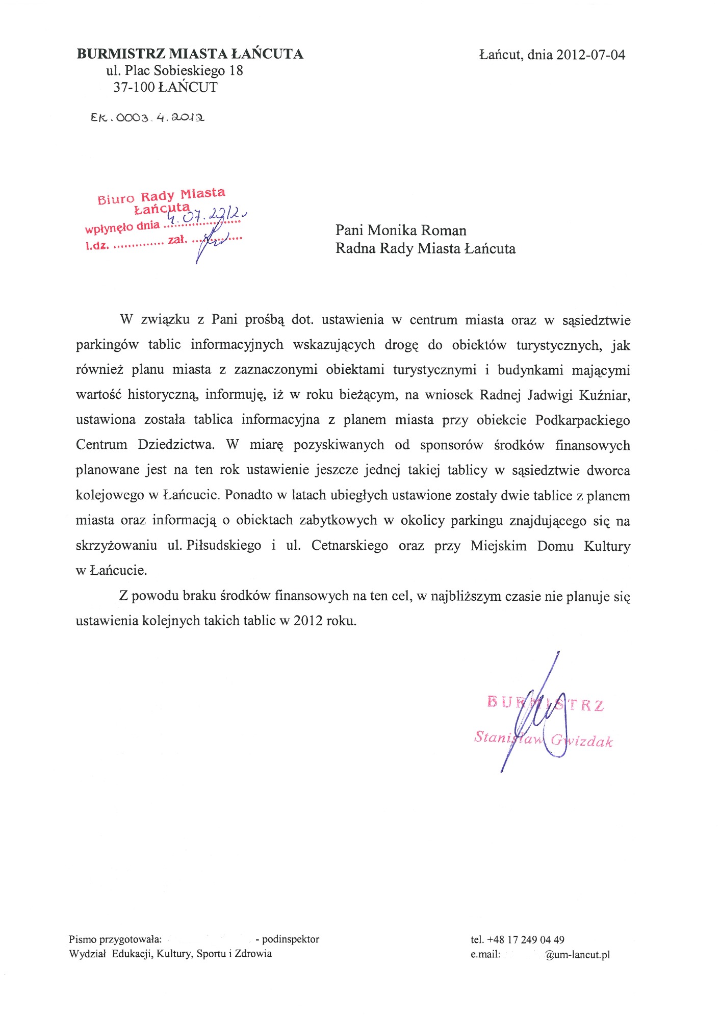 Niestety burmistrz Pan Stanisław Gwizdak i zastępca burmistrza Pani Joanna Rupar nie zainteresowali się żadnym z ciekawych pomysłów dotyczących rozwoju naszego miasta.