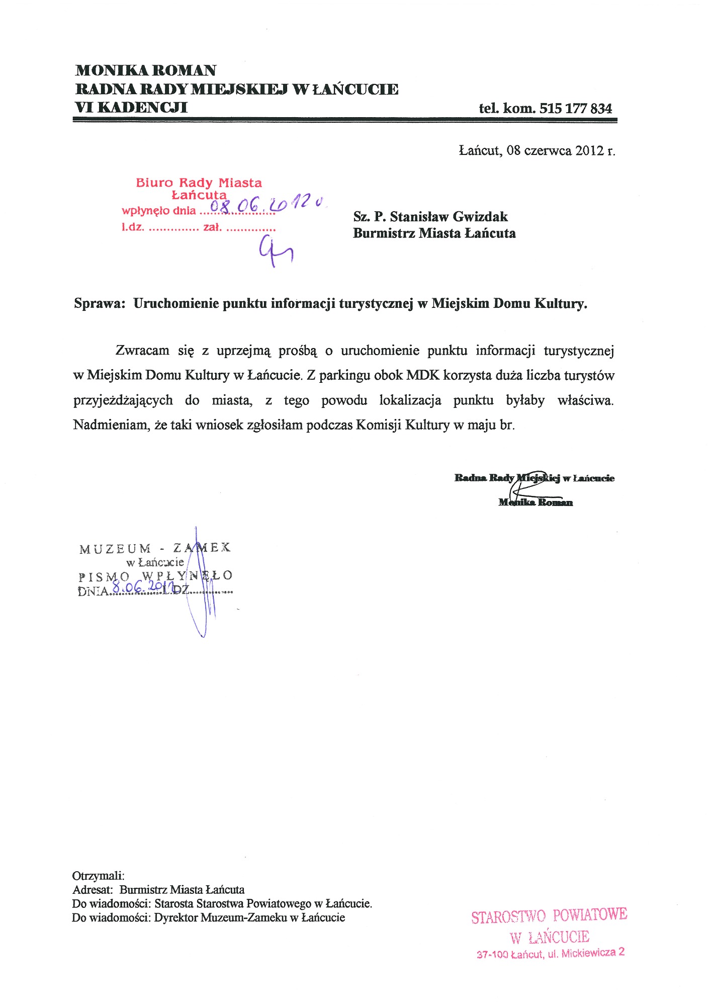 Większa cześć radnych – z listy pana burmistrza zdecydowała, że budynek handlowy jest większą szansą dla Łańcuta niż turystyka, gdyż powstanie w nim galeria handlowa! Argumentowałam, tłumaczyłam, że Łańcut jest perełką turystyczną! że żadna sieć handlowa nie uruchomi sklepu w mieście poniżej 20 tysięcy mieszkańców, że przyszłość centrum miasta powinna być powiązana z turystyką, a galerie handlową można zaplanować w innej dzielnicy. Niestety większa część radnych zarzuciła mi blokowanie rozwoju miasta, zdecydowali że galeria handlowa jest większą szansą na rozwój Łańcuta, niż turystyka! Budynek na Placu Sobieskiego, w którym obecnie znajduje się restauracja i hotel, w zamyśle radnych V kadencji miał być galerią handlową. Budynek powstał i zasłonił przepiękny widok na Muzeum – Zamek.
