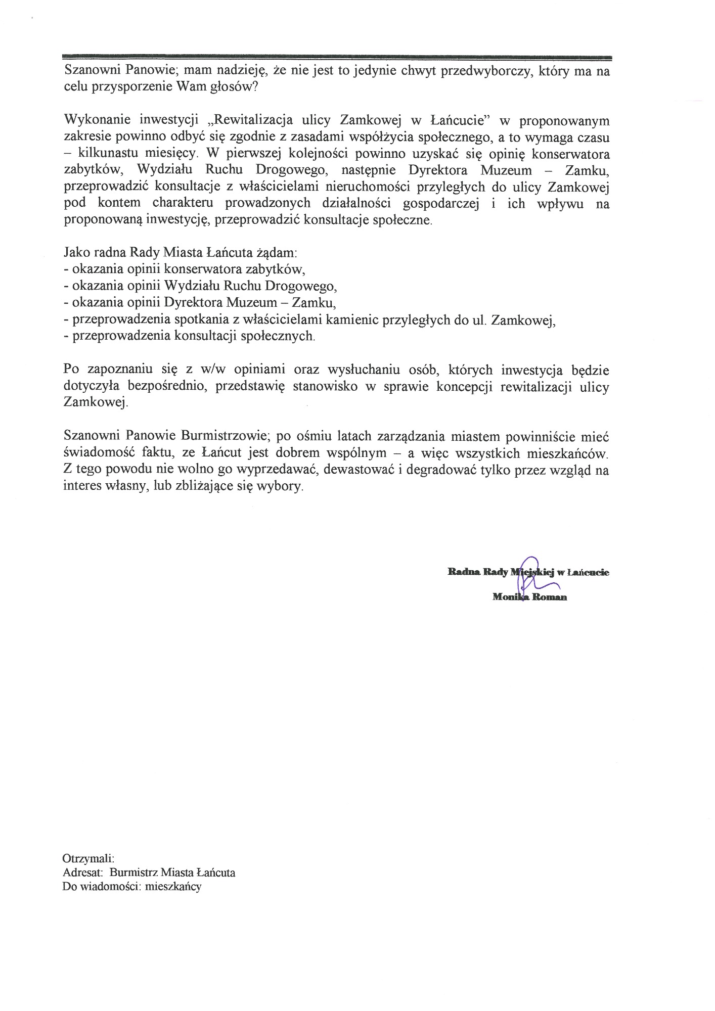 Władze miasta powinny konsultować wszelkie plany dotyczące inwestycji w mieście, a zwłaszcza rewitalizacji rynku, zamiaru utworzenia strefy trwale wyłączonej z ruchu pojazdów. Należy zadać pytanie; czy Łańcut potrzebuje strefy wyłączonej z ruchu? Czy nie wystarczy czasowe ograniczenie ruchu na kilku ulicach, obowiązujące w weekendy, po zamknięciu sklepów?