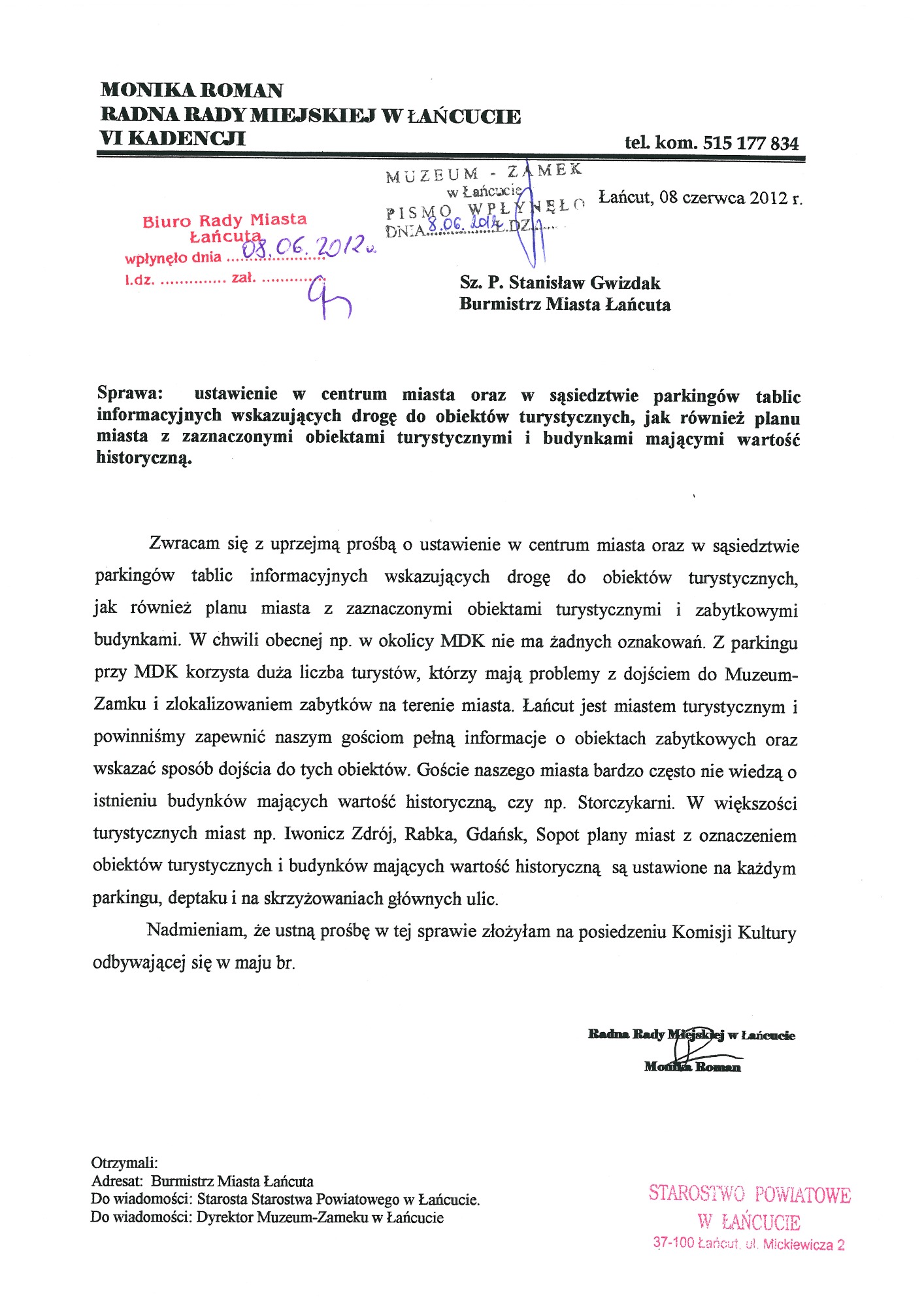 Zaproponowałam również rzeczy prozaiczne, takie jak ustawienie tablic ze wskazaniem zabytków, czy opisem historii miasta. Proponowałam również „gadające ławeczki” – na wzór ławeczek grających utwory Szopena. W Warszawie na Krakowskim Przedmieściu stoją marmurowe ławeczki, po dotknięciu ławeczka odtwarza muzykę skomponowaną przez Fryderyka Szopena. Ciekawą atrakcją dla Łańcuta byłaby marmurowa ławeczka, która po dotknięciu odtwarza nagraną historię miasta. Byłaby to również lekcja historii miasta dla młodych łańcucian.