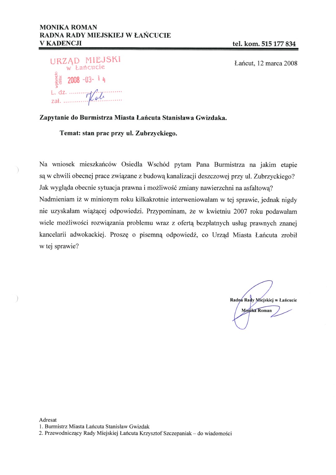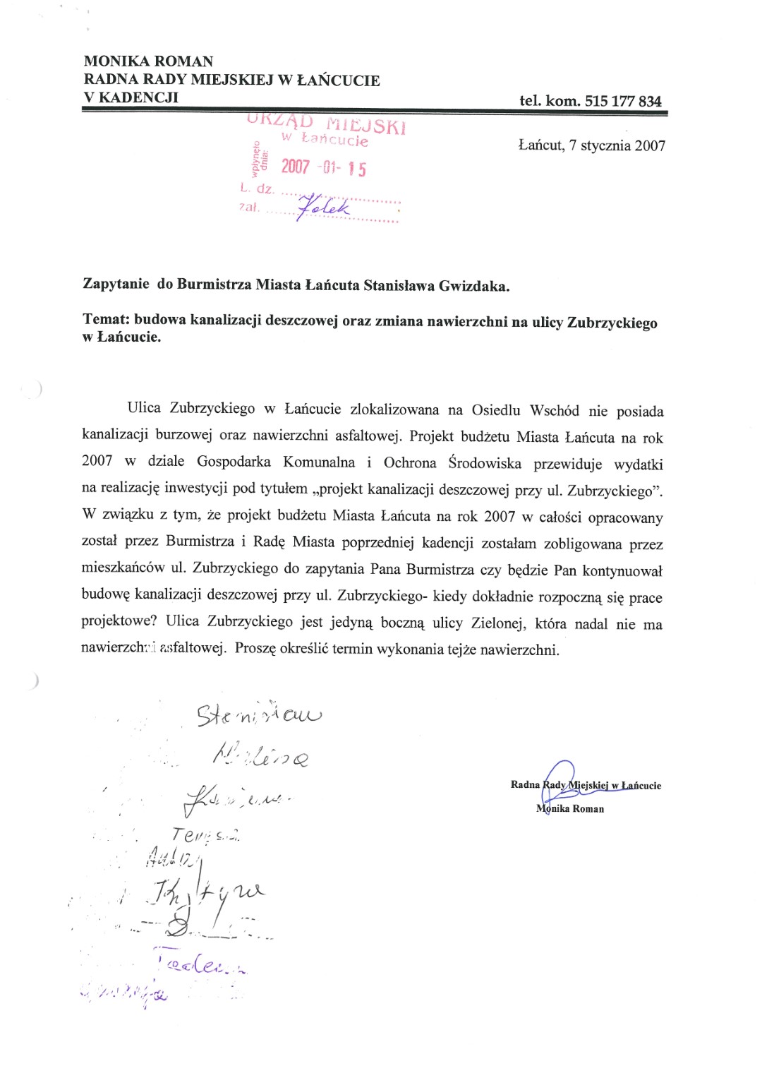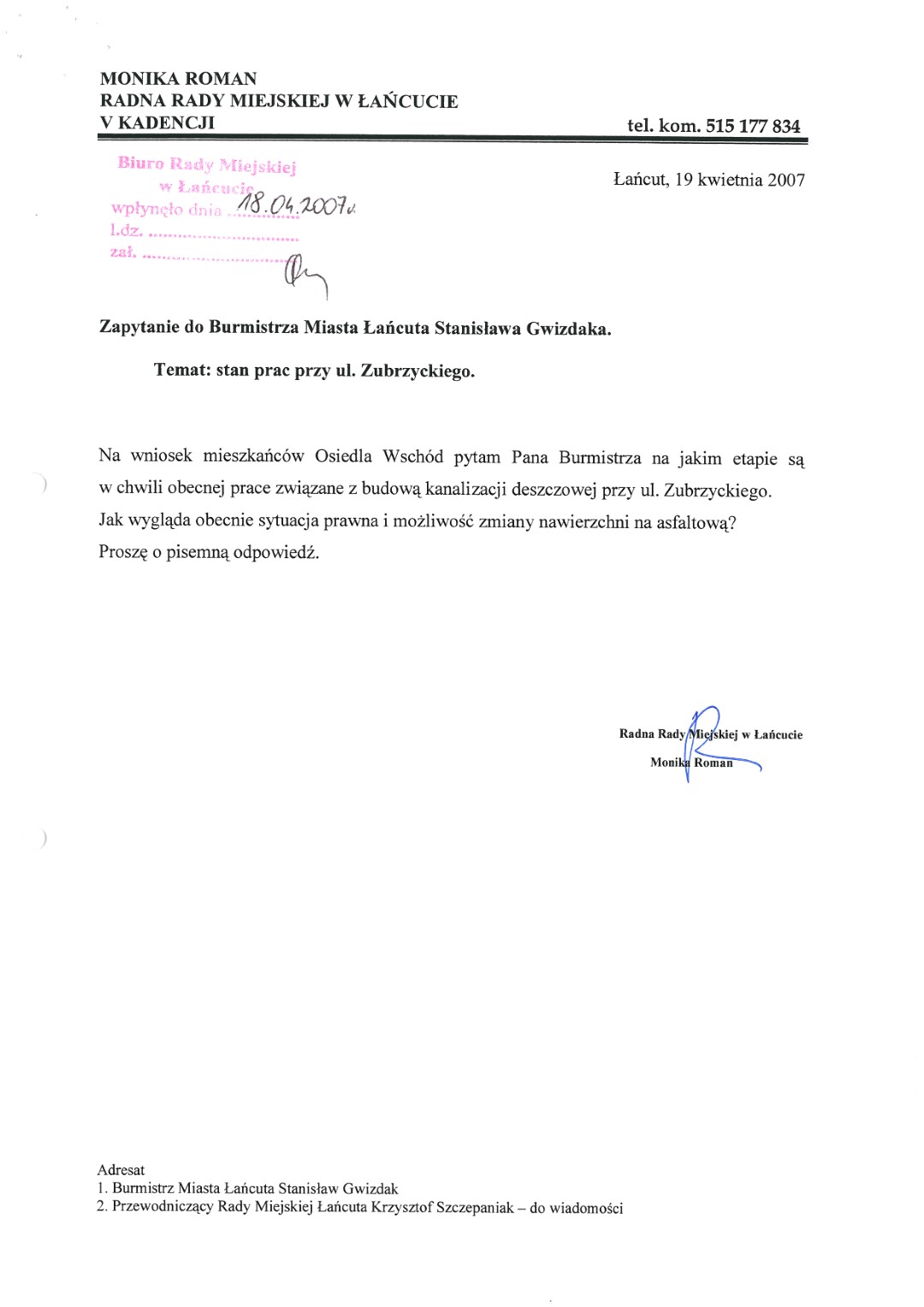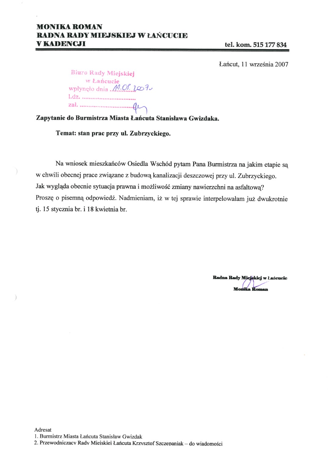 Mieszkańcy ulicy Zubrzyckiego (obecnie ulica Pod Bażantarnią) zwrócili się do mnie z wnioskiem w sprawie wykonania kanalizacji burzowej oraz asfaltowej nawierzchni. Powodem interwencji był brak utwardzonej nawierzchni oraz woda wlewająca się do garaży po każdym deszczu. Zebraliśmy podpisy i opracowaliśmy treść pism. Wnioski o realizację inwestycji złożyłam w terminach: 07-01-2007, 19-04-2007, 11-09-2007, 12-03-2008.