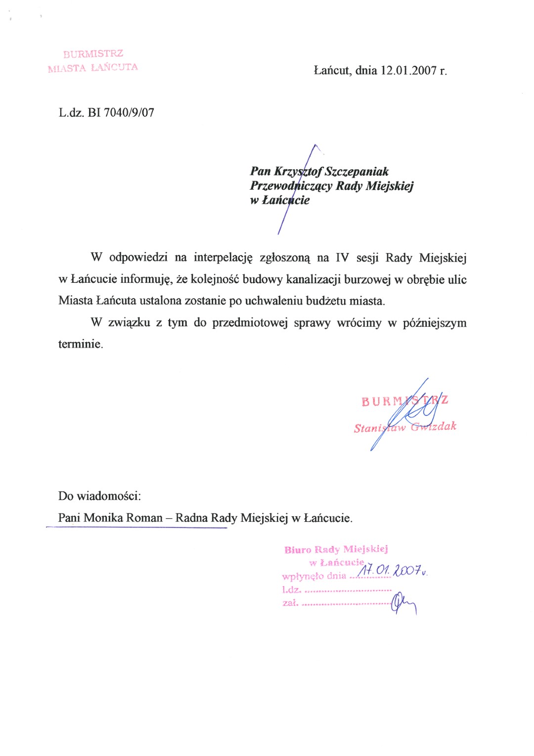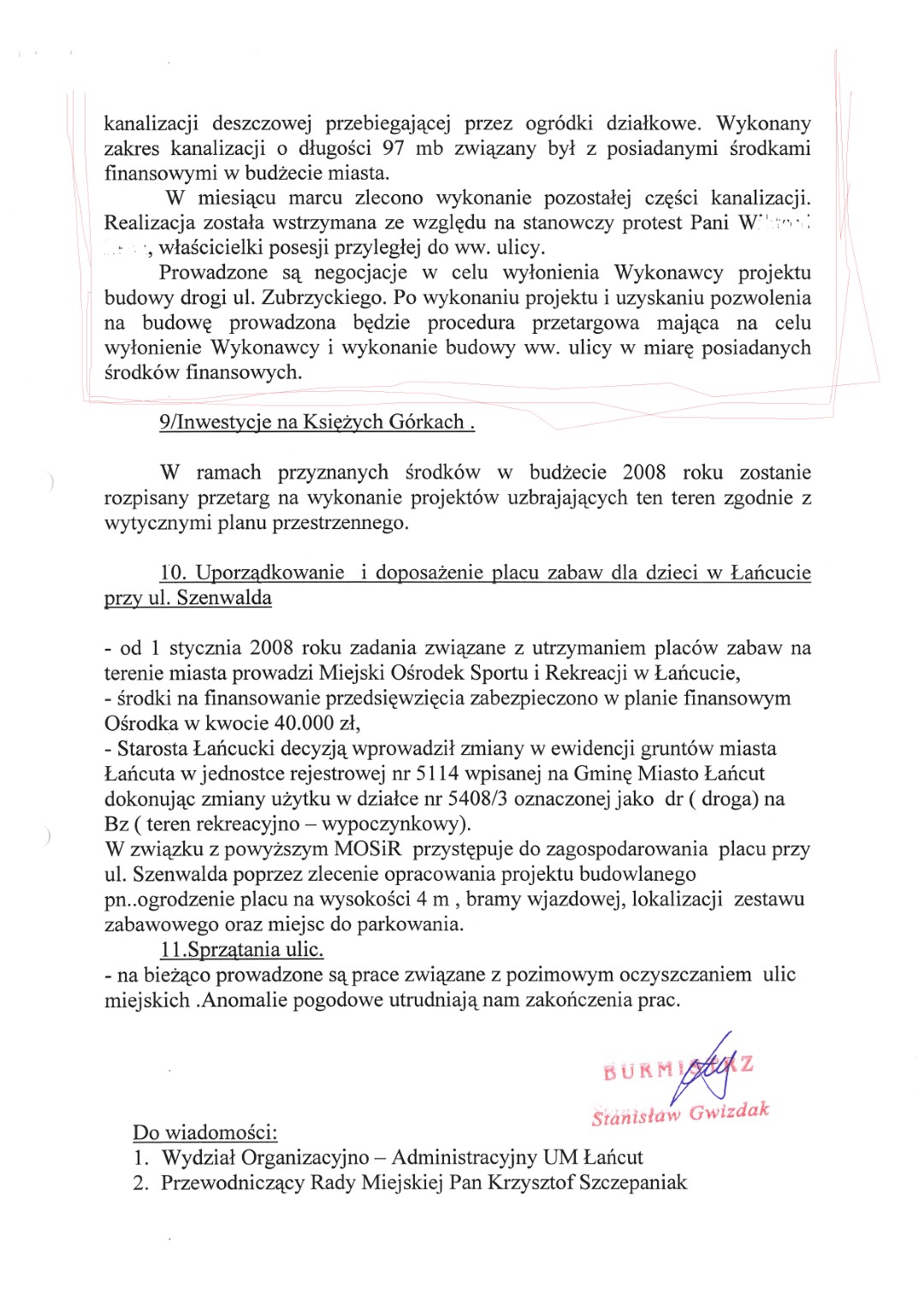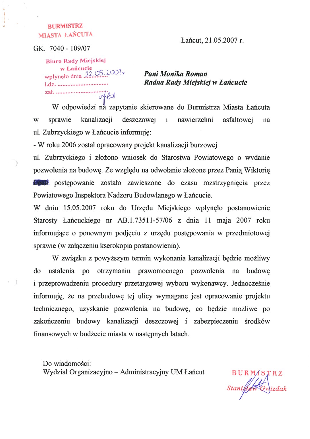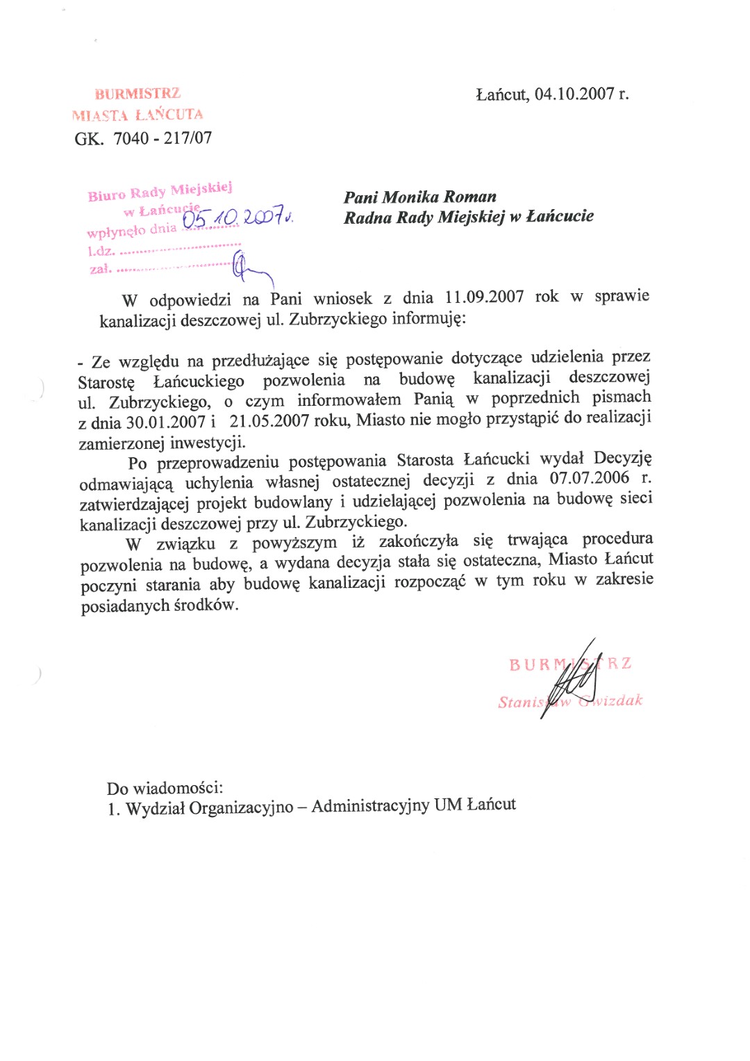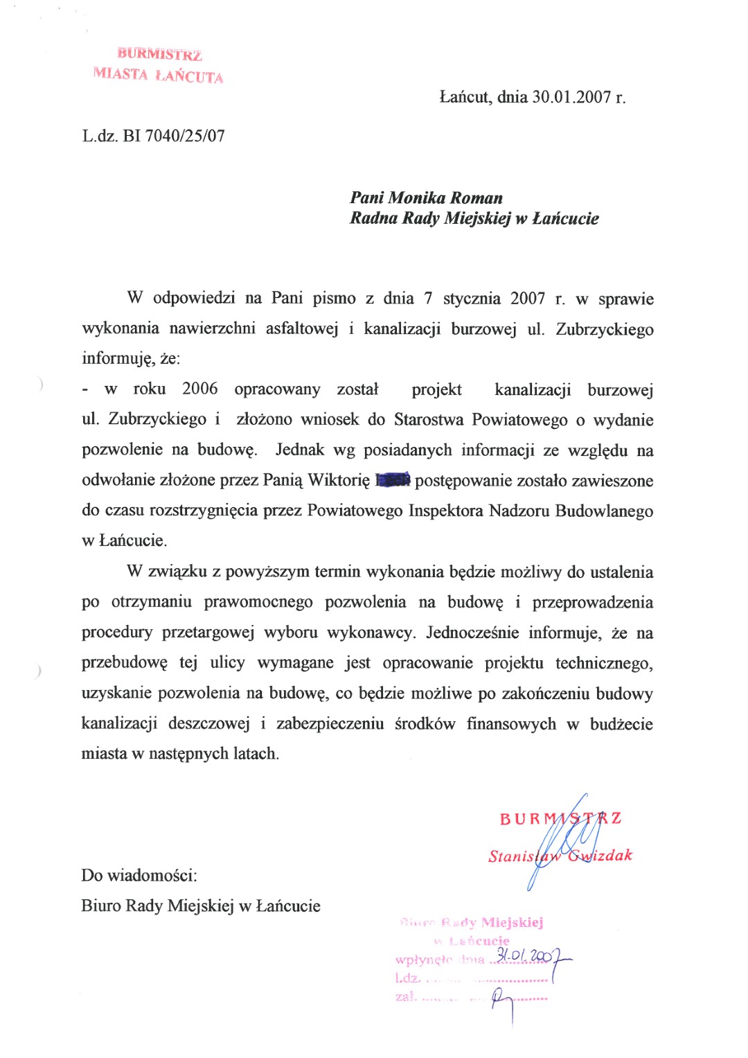 Mieszkańcy ulicy Zubrzyckiego (obecnie ulica Pod Bażantarnią) zwrócili się do mnie z wnioskiem w sprawie wykonania kanalizacji burzowej oraz asfaltowej nawierzchni. Powodem interwencji był brak utwardzonej nawierzchni oraz woda wlewająca się do garaży po każdym deszczu. Zebraliśmy podpisy i opracowaliśmy treść pism. Wnioski o realizację inwestycji złożyłam w terminach: 07-01-2007, 19-04-2007, 11-09-2007, 12-03-2008.