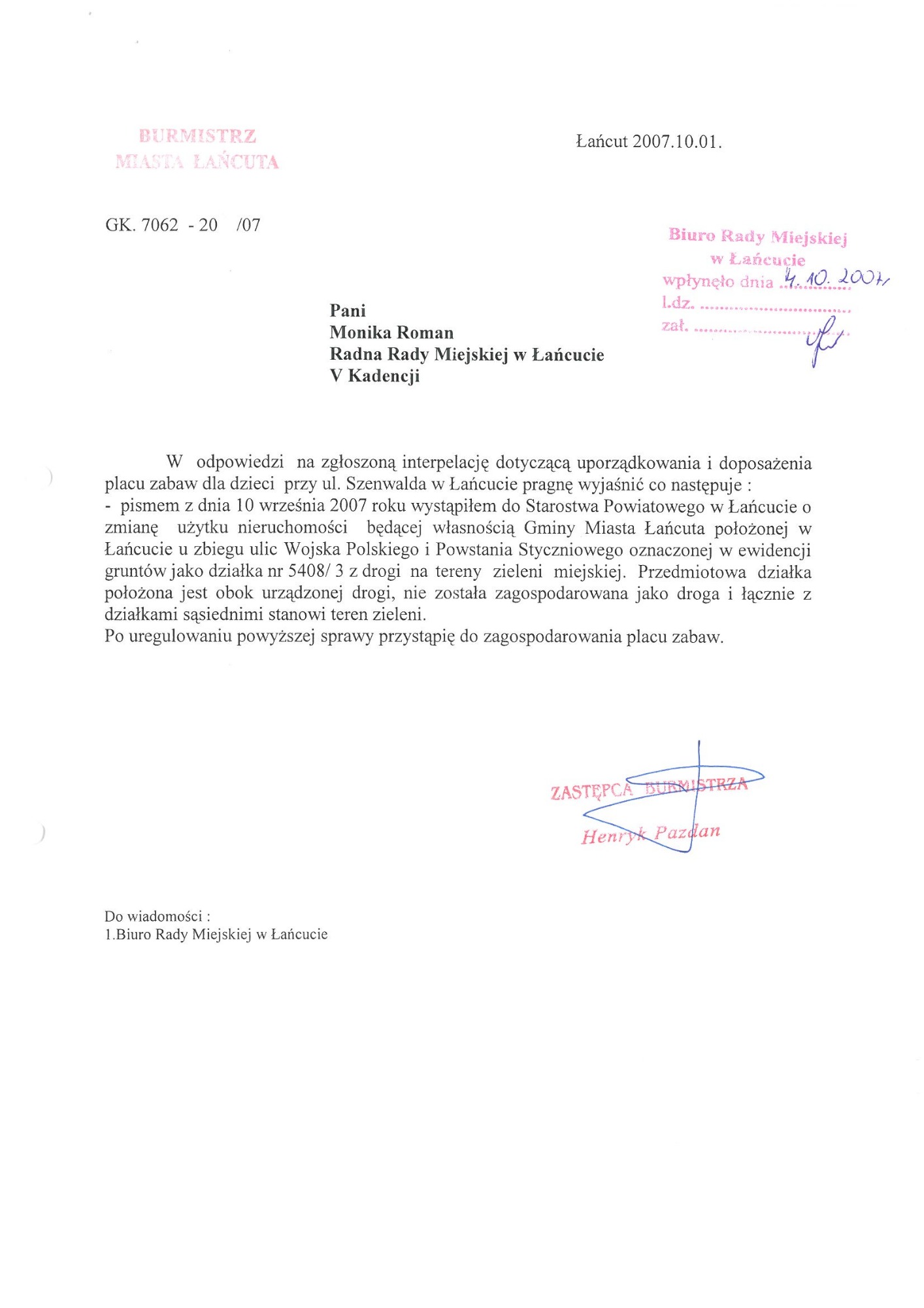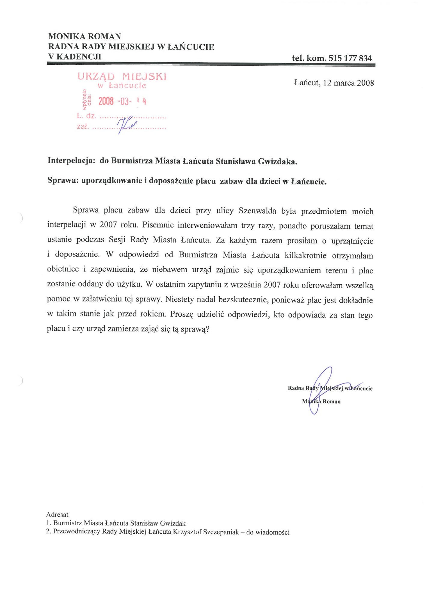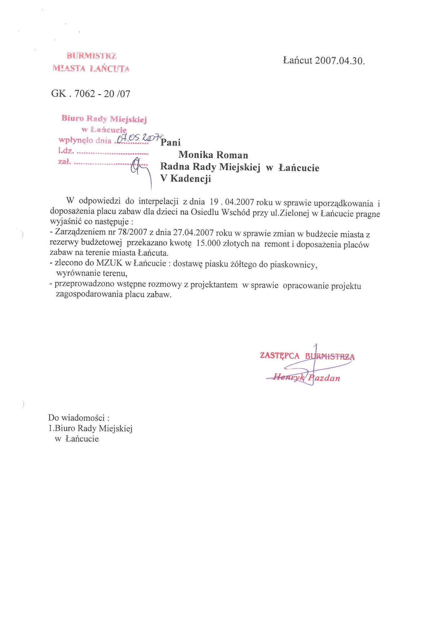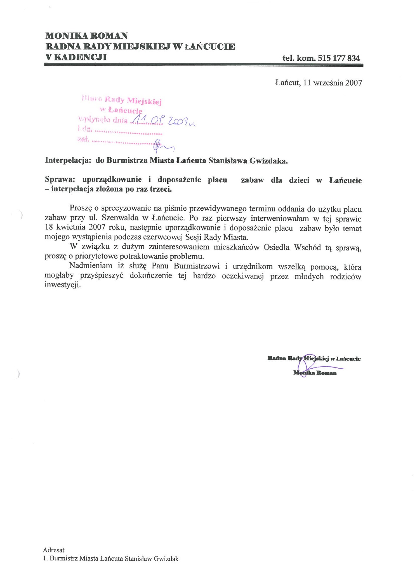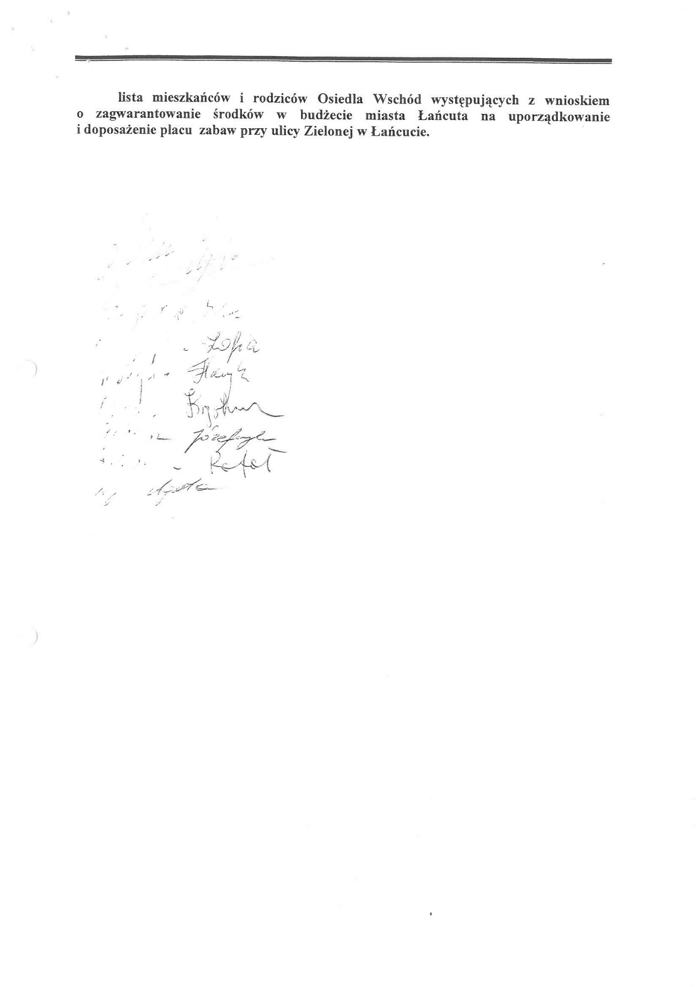 Plac zabaw przy ul. Zielonej (poprzednia nazwa ulica Szenwalda). Wspólne starania Mieszkańców i moje zostały uwieńczone sukcesem powstał ogrodzony - bezpieczny plac zabaw dla dzieci. Plac zabaw jest systematycznie doposażony i unowocześniany.