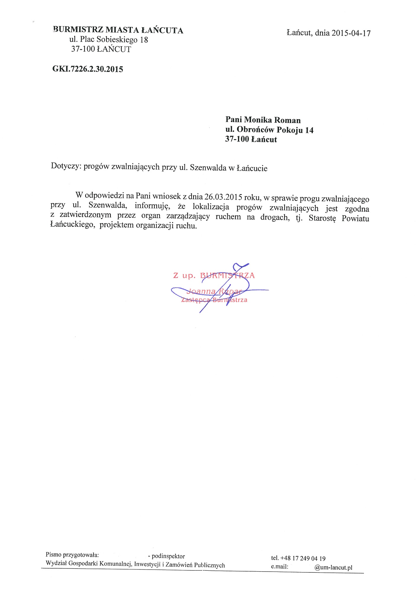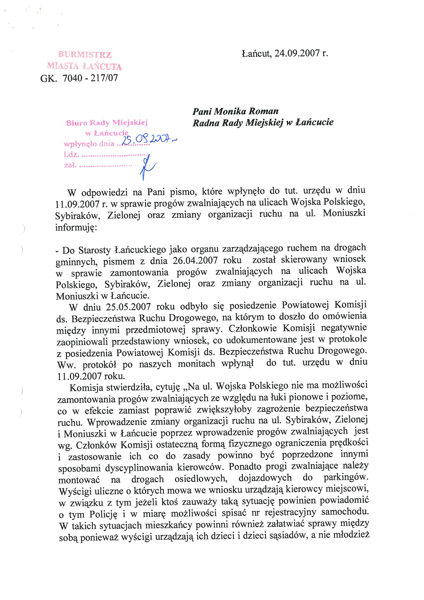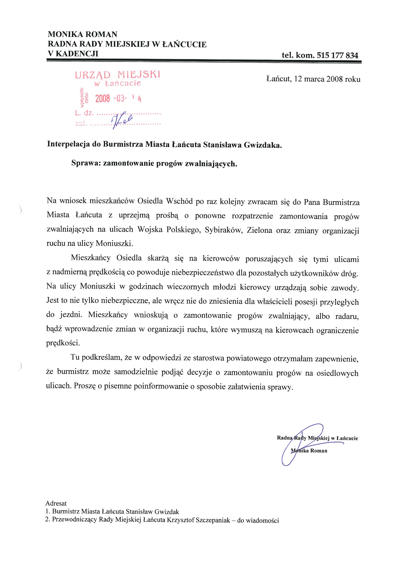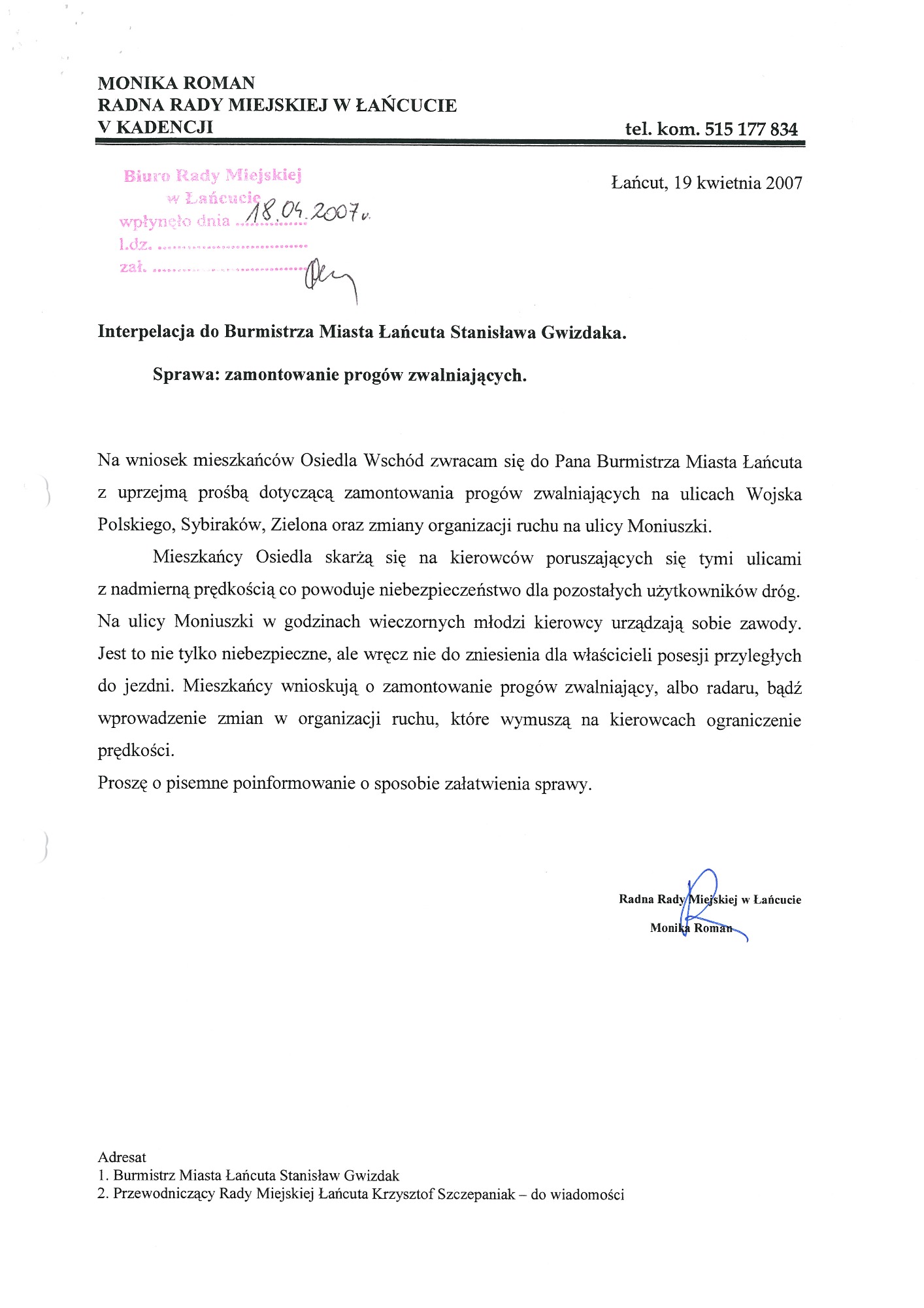 W poprzednich latach wnioskowałam również o zamontowanie progów zwalniających na ulicach miejskich: Stanisława Moniuszki i Polnej. Podjęłam wiele interwencji w sprawie zmiany organizacji ruchu na ulicy Stanisława Moniuszki. Niektóre wnioski czekały na realizację ponad dziesięć lat.