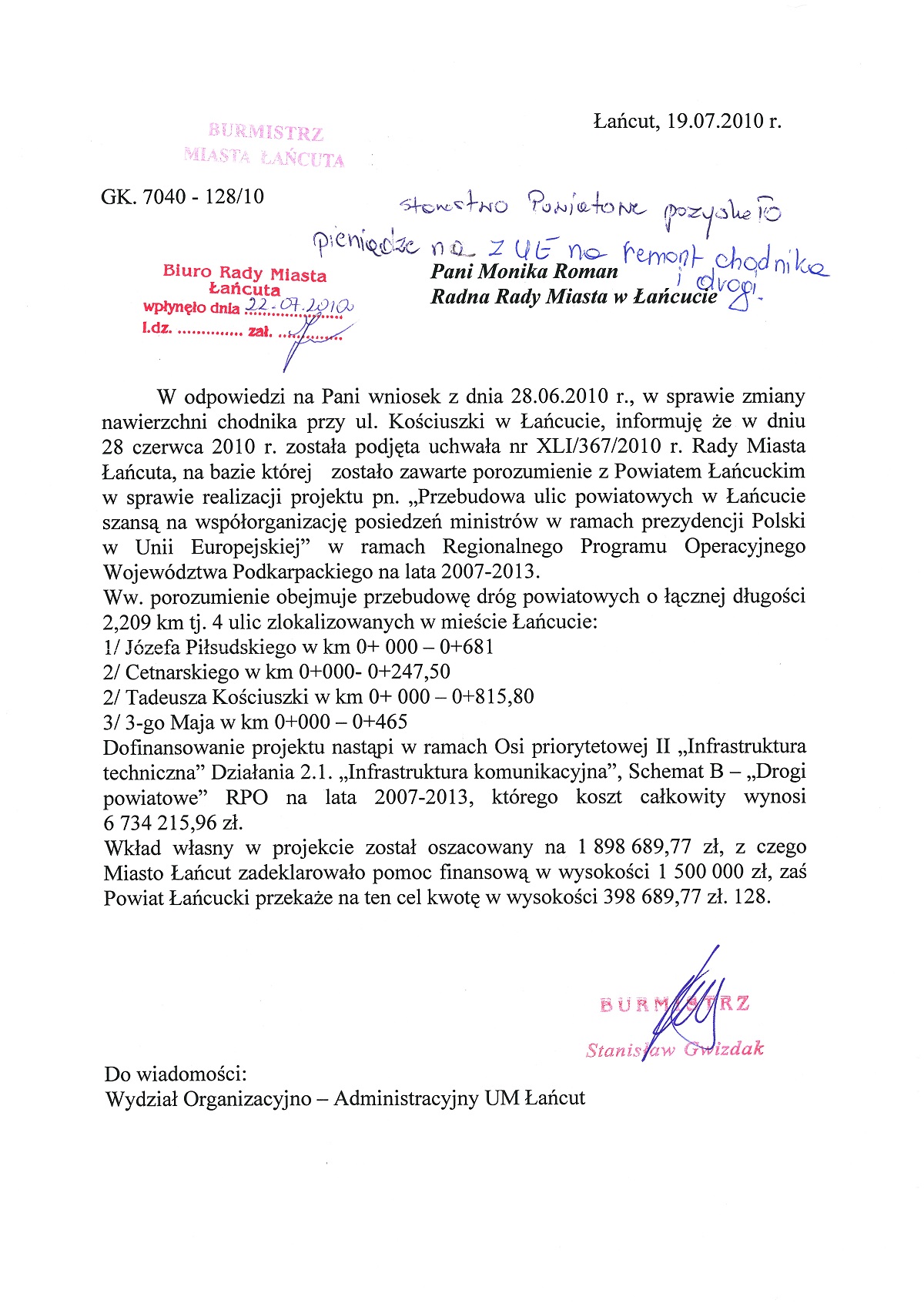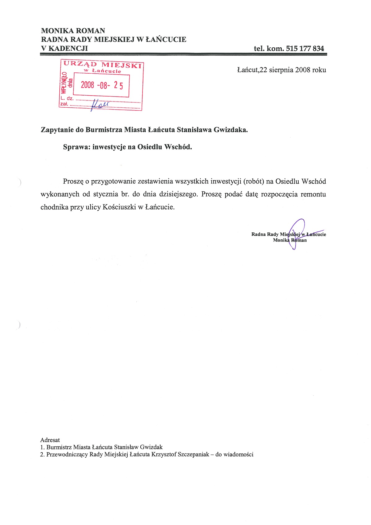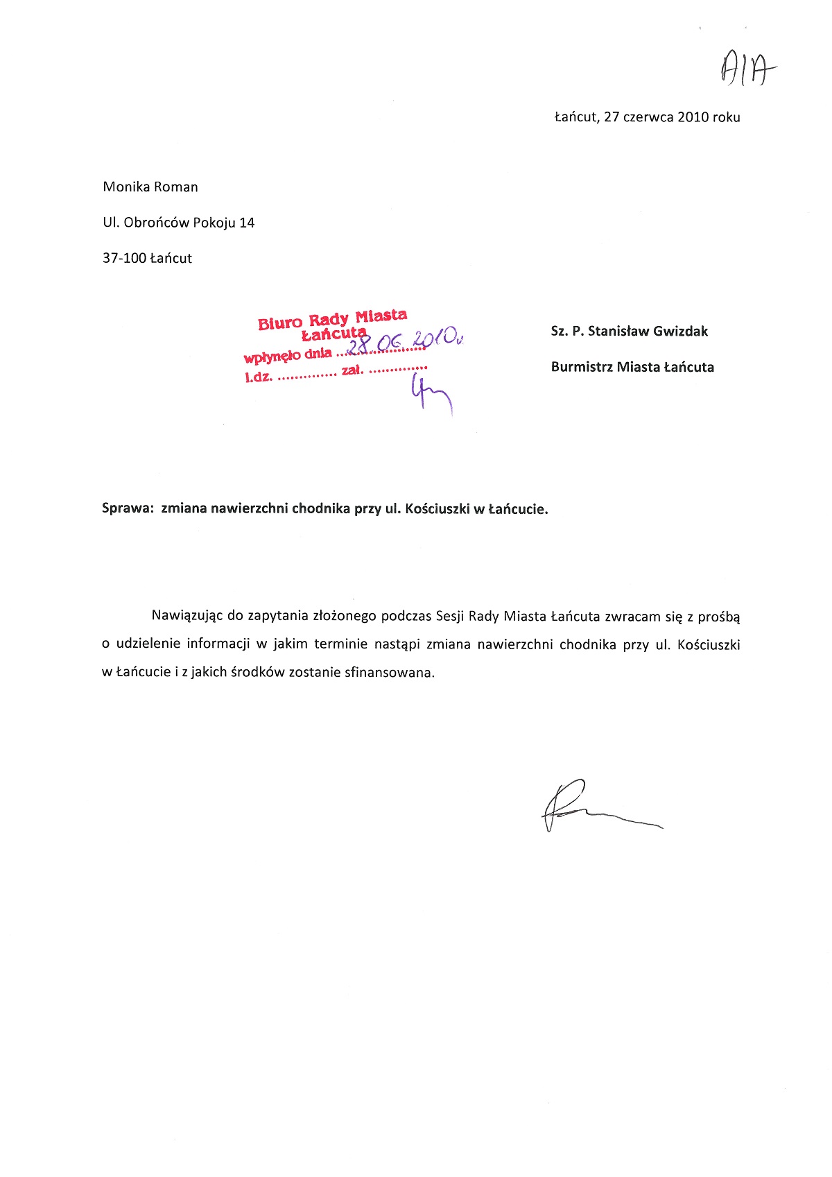 Inwestycja została zrealizowana w 2011 roku. Przebudowa chodnika przy ulicy Tadeusza Kościuszki była przedmiotem wielu moich interwencji. Obecnie, po chodniku wygodnie jeździ się dziecięcym wózkiem i jest on w pełni bezpieczny dla osób starszych.