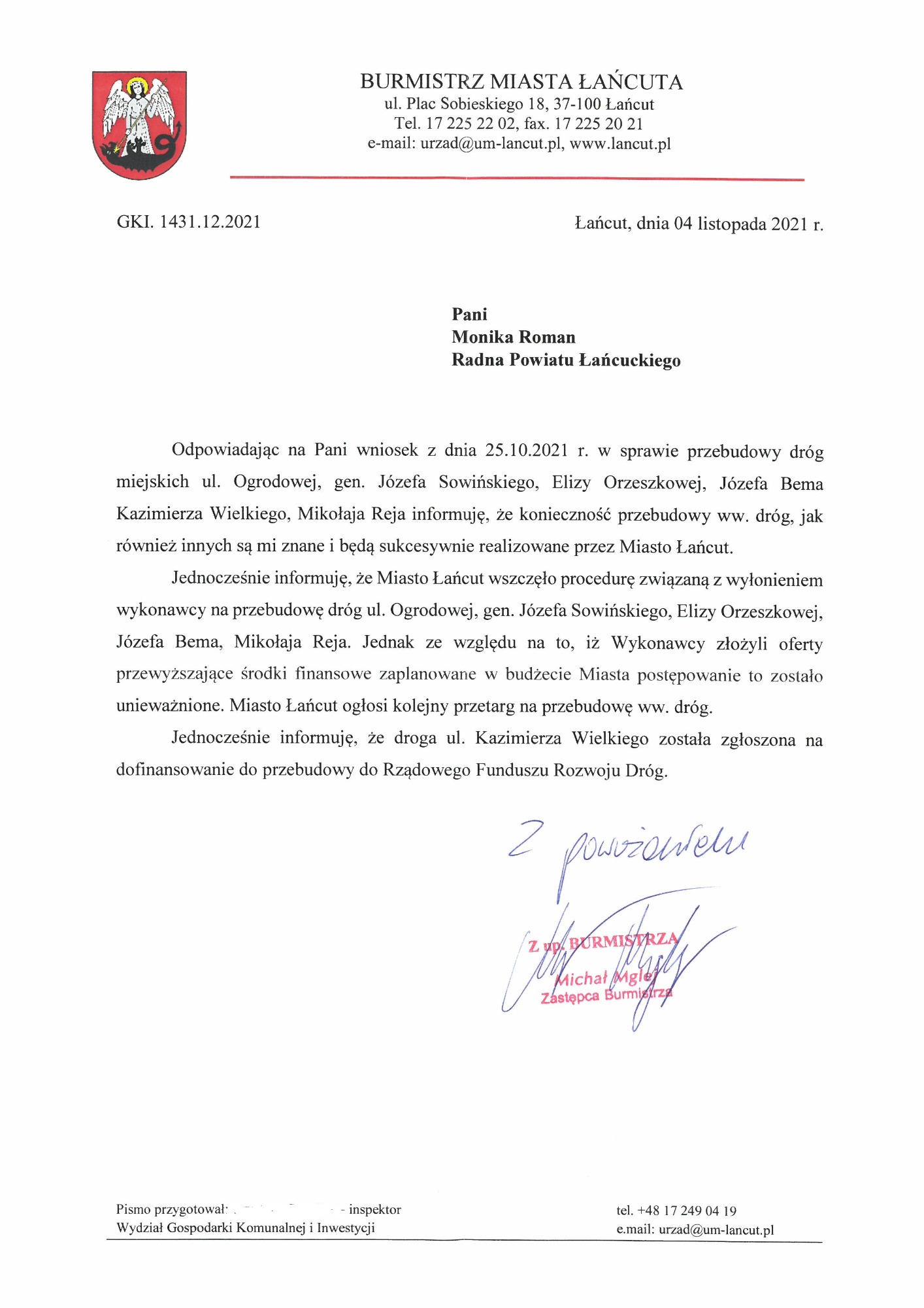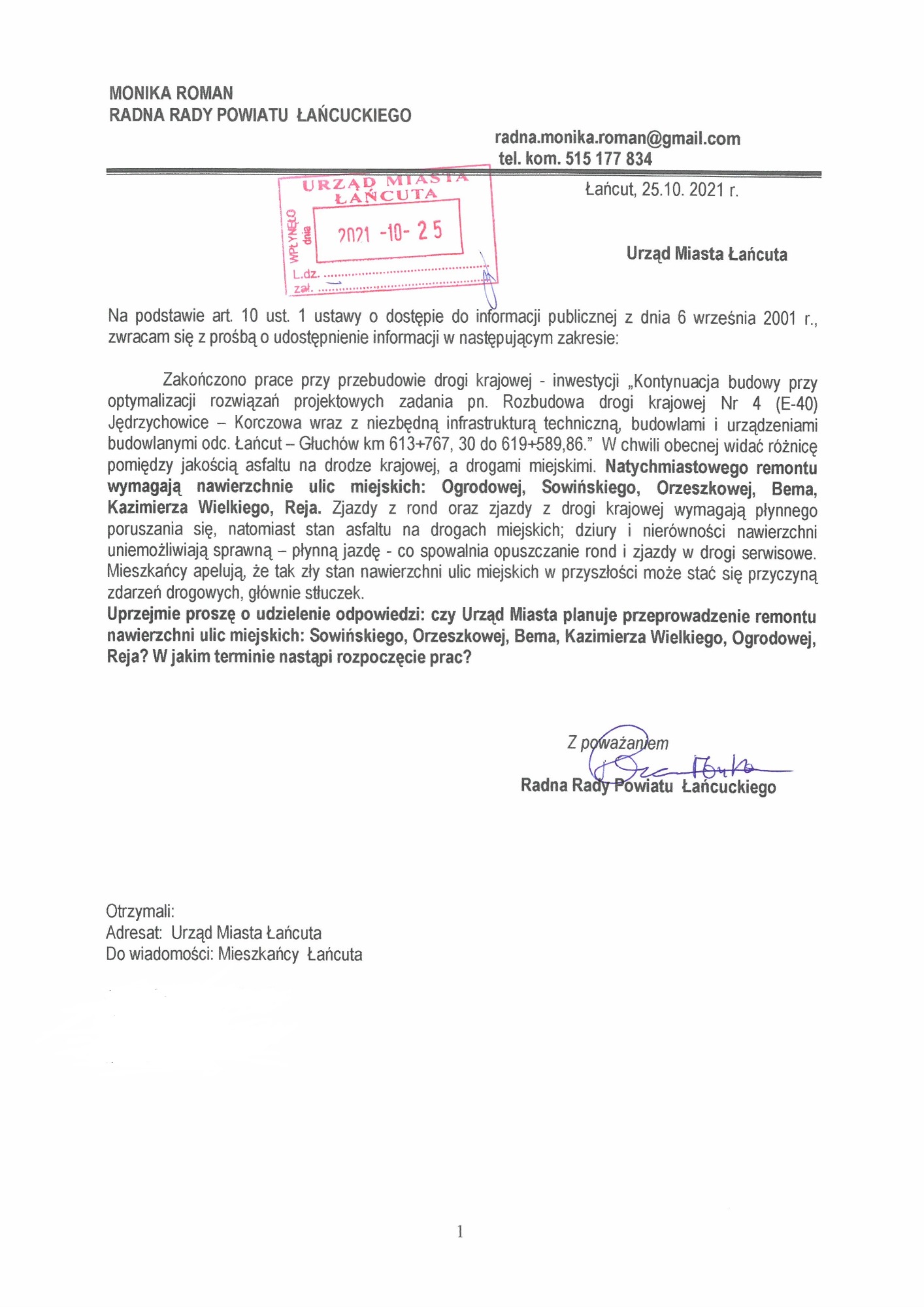 W poprzednich kadencjach samorządu; wspólnie z Mieszkańcami zbieraliśmy podpisy, składaliśmy prośby ustne i pisemne, dotyczące remontu nawierzchni dróg oraz budowy chodników. Wnioski zostały wpisane na listę zadań do realizacji. Wniosek na wymianę nawierzchni ulicy Podzamcze przeleżał szesnaście lat. Pierwszą interwencję w sprawie ulicy Podzamcze podjęłam w 2007 roku. Ciągłość działania samorządu gwarantuje, że wnioski raz złożone, pisma dostarczone do Urzędu Miasta, powinny być składowane do czasu zamknięcia sprawy, bez względu na to kto z imienia i nazwiska sprawuje urząd burmistrza.