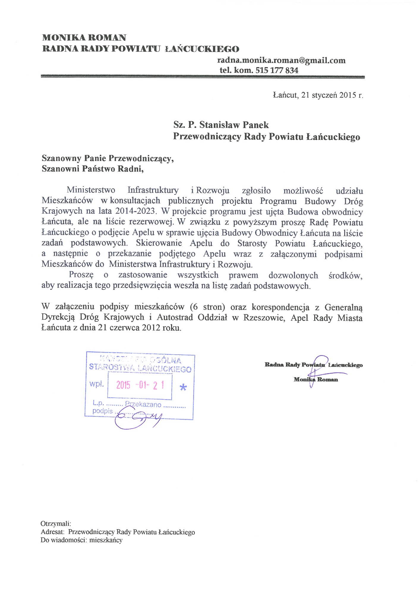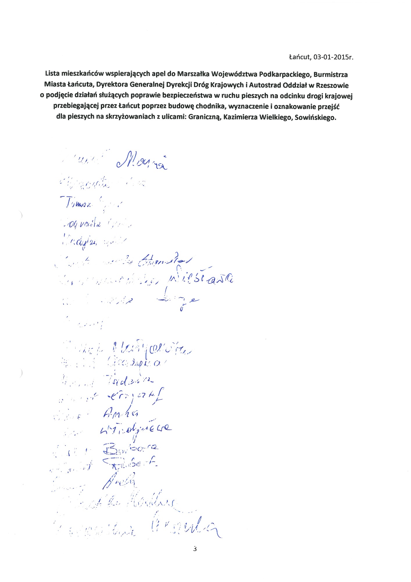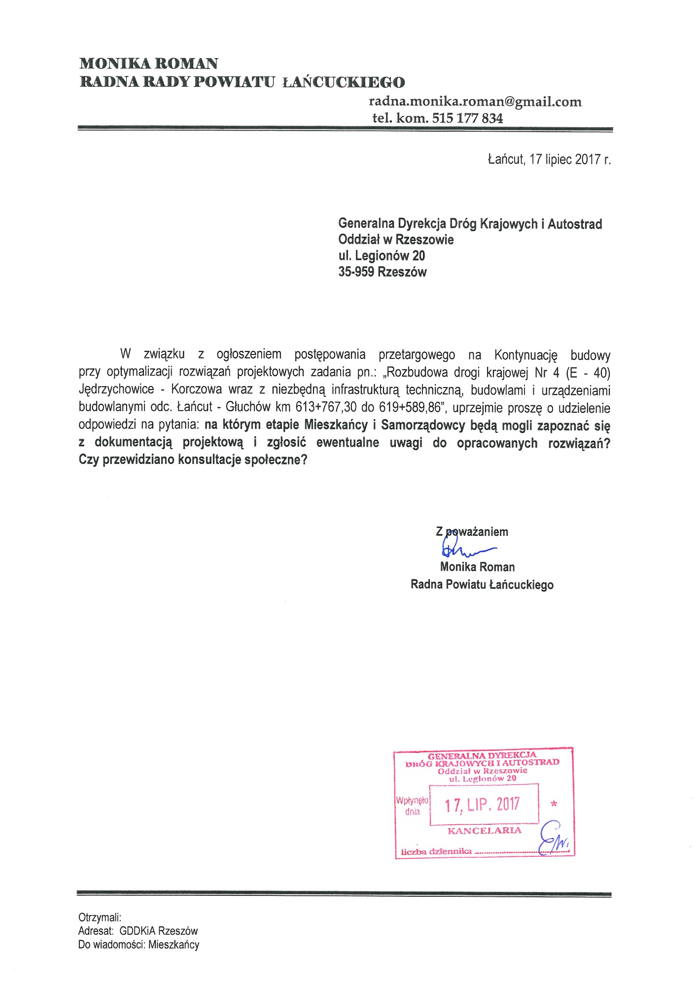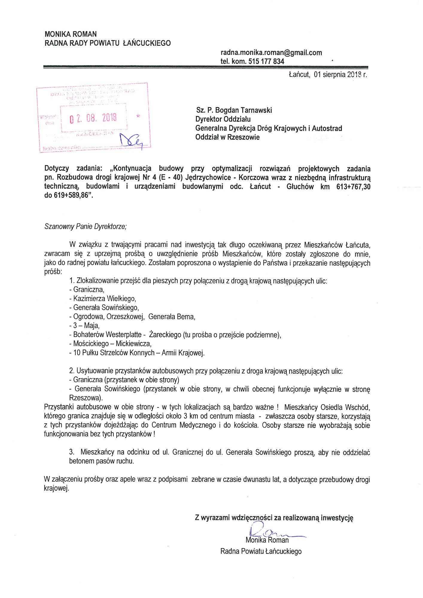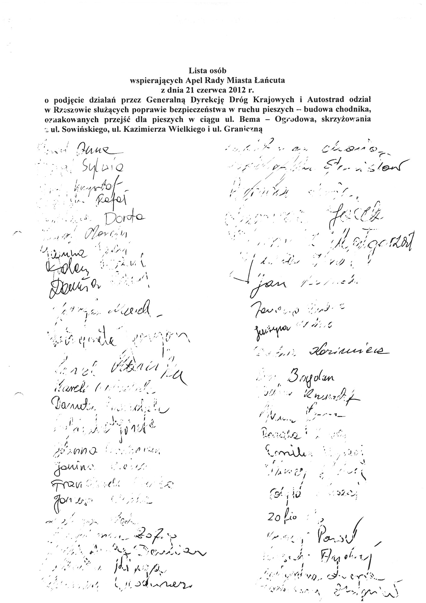 Proszę o zapoznanie się z apelami, wnioskami, pismami. W dokumentach znajdują się również skany kart z podpisami Mieszkańców, które dwukrotnie osobiście zebrałam i przekazałam do Generalnej Dyrekcji Dróg Krajowych i Autostrad oddział w Rzeszowie. Podpisy zostały zanonimizowane z uwagi na wymogi stawiane przez znowelizowaną ustawę o ochronie danych osobowych.