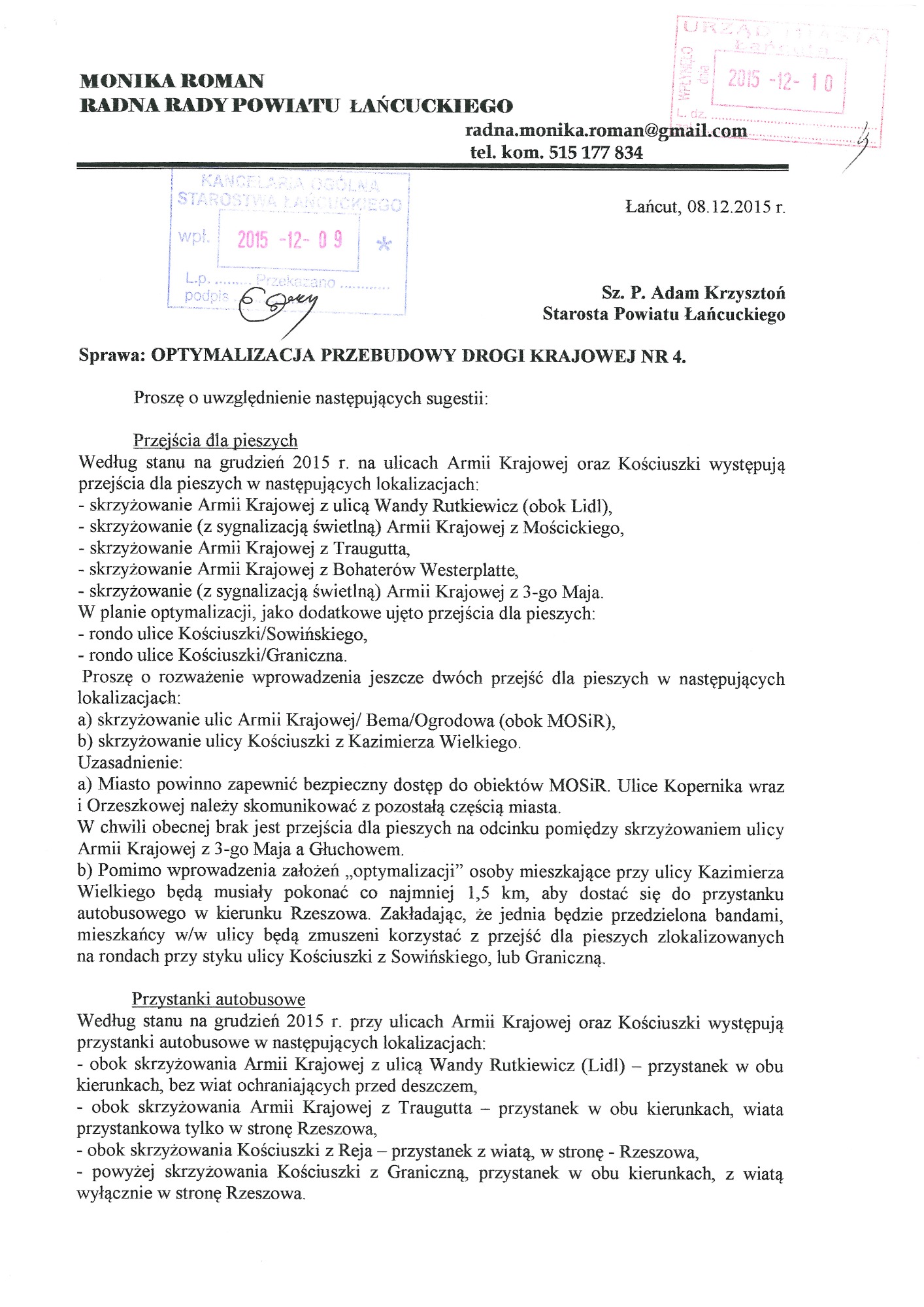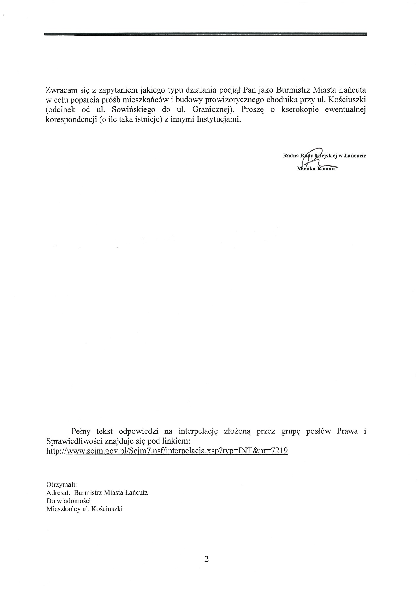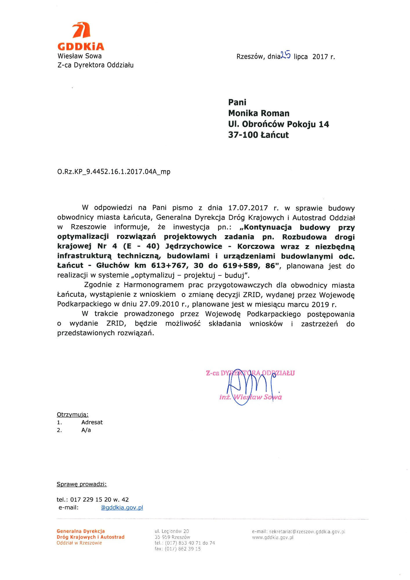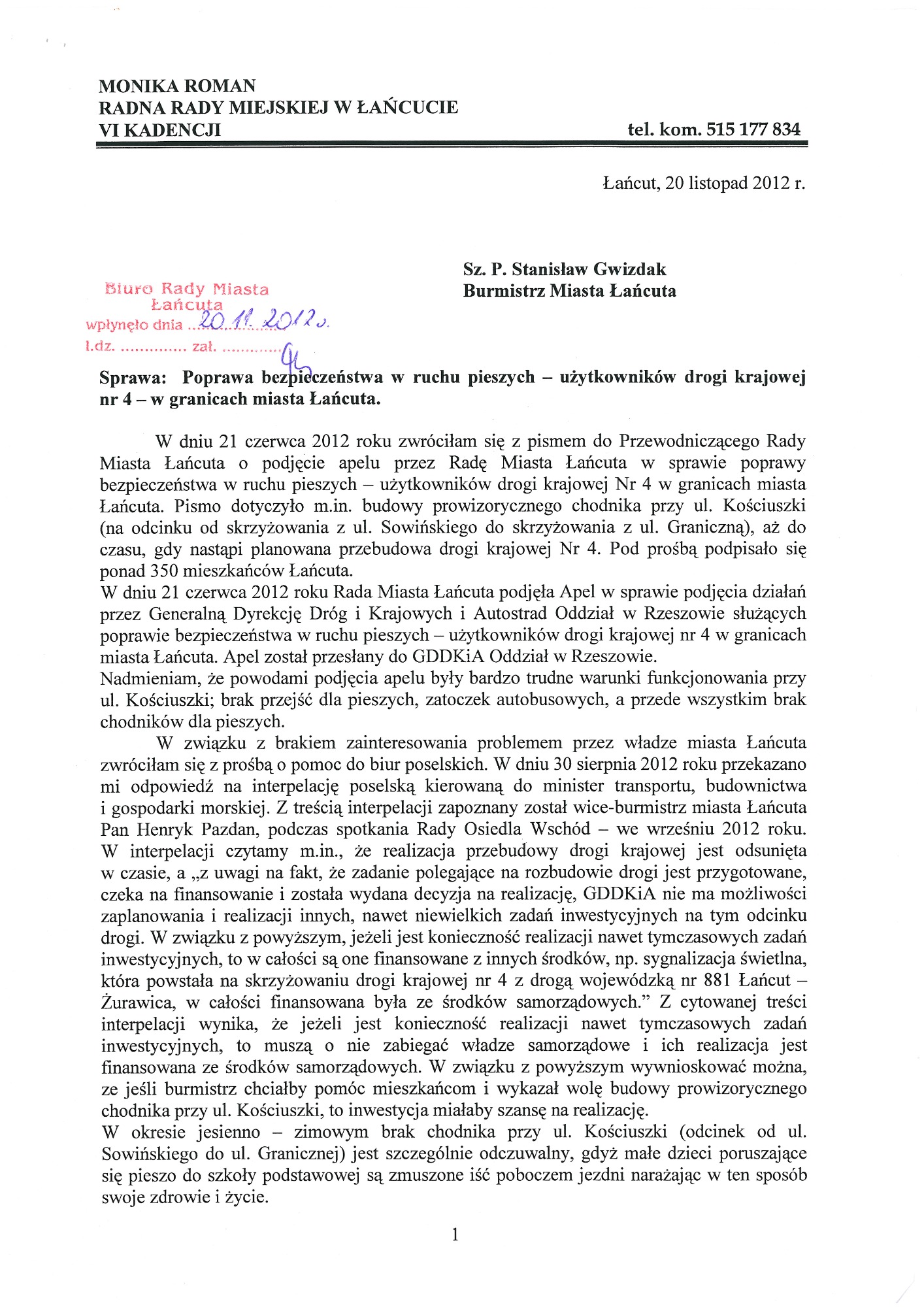 Proszę o zapoznanie się z apelami, wnioskami, pismami. W dokumentach znajdują się również skany kart z podpisami Mieszkańców, które dwukrotnie osobiście zebrałam i przekazałam do Generalnej Dyrekcji Dróg Krajowych i Autostrad oddział w Rzeszowie. Podpisy zostały zanonimizowane z uwagi na wymogi stawiane przez znowelizowaną ustawę o ochronie danych osobowych.