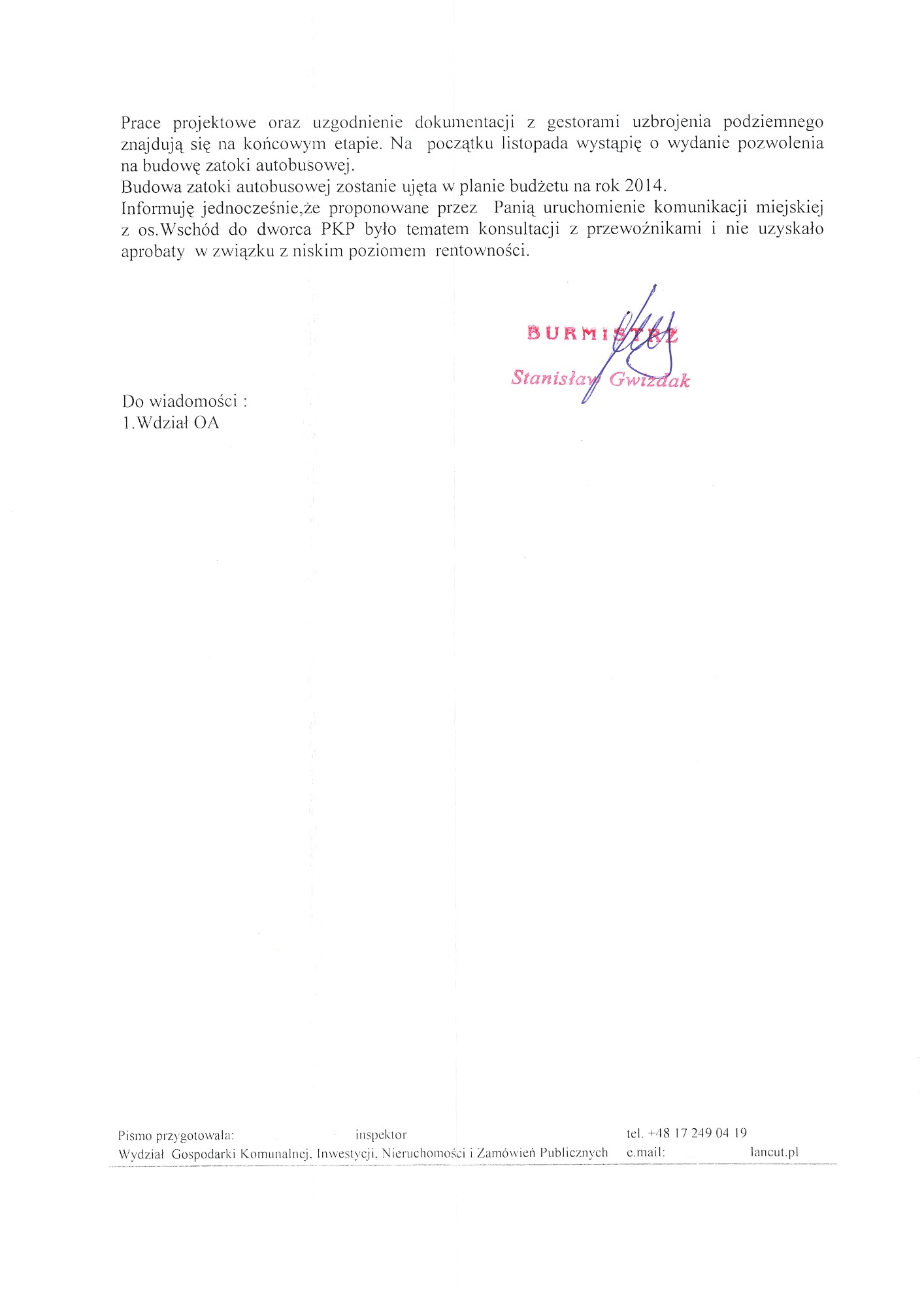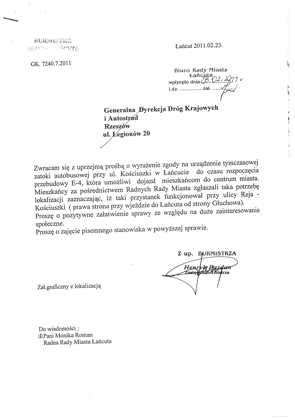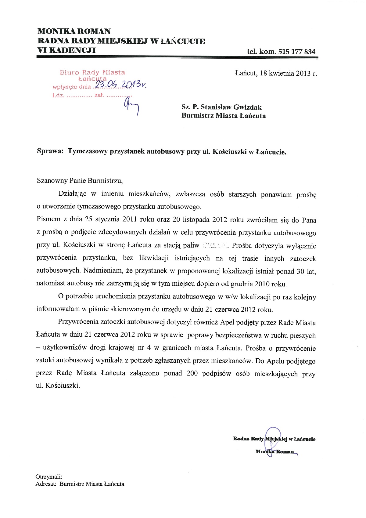 Efektem końcowym starań jest nowoczesna zatoka autobusowa, z bezpiecznym zajazdem i utwardzeniem wykonanym kostką brukową. Pierwsze pismo w sprawie przywrócenia przystanku autobusowego przy ulicy Tadeusza Kościuszki złożyłam w styczniu 2011 roku. Nastąpiło to na wniosek mieszkańców Osiedla "Wschód". W tej sprawie zebrałam ponad pięćdziesiąt podpisów. Pozytywną odpowiedź otrzymałam w kwietniu 2013 roku. W dniu 8 sierpnia 2014 roku zawarto umowę na realizację przedmiotowego zadania.