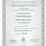Ukończyłam studia wyższe magisterskie na kierunku prawo na Uniwersytecie Marii Curie – Skłodowskiej w Lublinie (2003r.), kurs doktorancki na Wydziale Nauk Historycznych i Społecznych na Uniwersytecie Kardynała Stefana Wyszyńskiego w Warszawie (2009r.), studia podyplomowe w zakresie zarządzania marketingiem w Wyższej Szkole Zarządzania w Rzeszowie (2012r.), studia podyplomowe na Wydziale Nauk Ekonomicznych Uniwersytetu Warszawskiego (2015r.) oraz studia podyplomowe na kierunku Prawo Pomocy Publicznej w Szkole Głównej Handlowej w Warszawie (2018r.). Posiadam certyfikaty zawodowe honorowane na terenie Unii Europejskiej uprawniające do pracy przy projektach finansowanych z funduszy UE na specjalnościach: P30 – Biura Portfeli, Programów i Projektów; Change Management - Zarządzanie Zmianą; Zarządzanie Programami MSP oraz Zarządzanie Projektami PRINCE2 Practitioner.